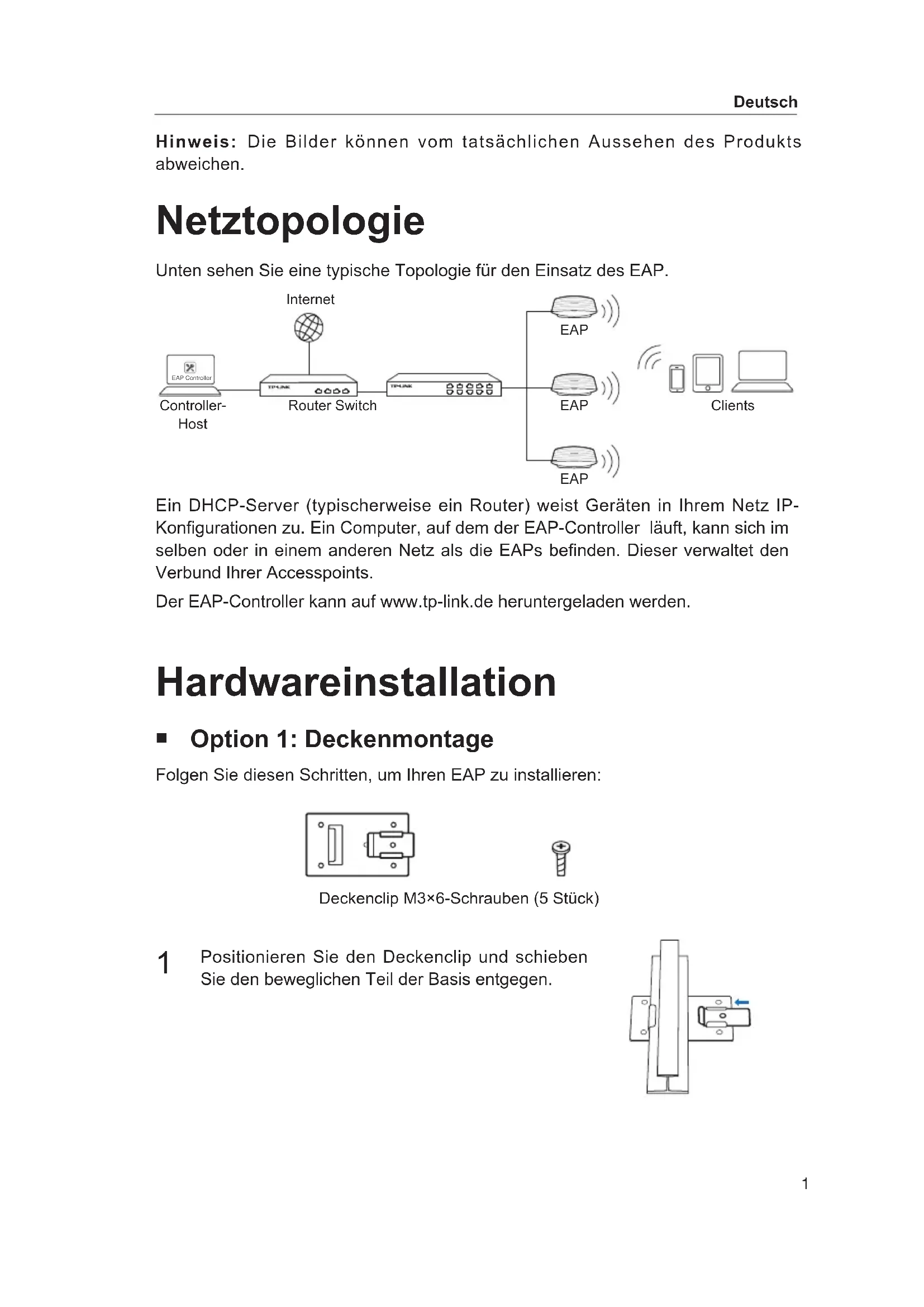 Positionieren Sie den Deckenclip und schieben Sie den beweglichen Teil der Basis entgegen. Controller- Host Router SwitchClients Deckenclip M3×6-Schrauben (5 Stück) Internet EAP EAP EAP2 Deutsch