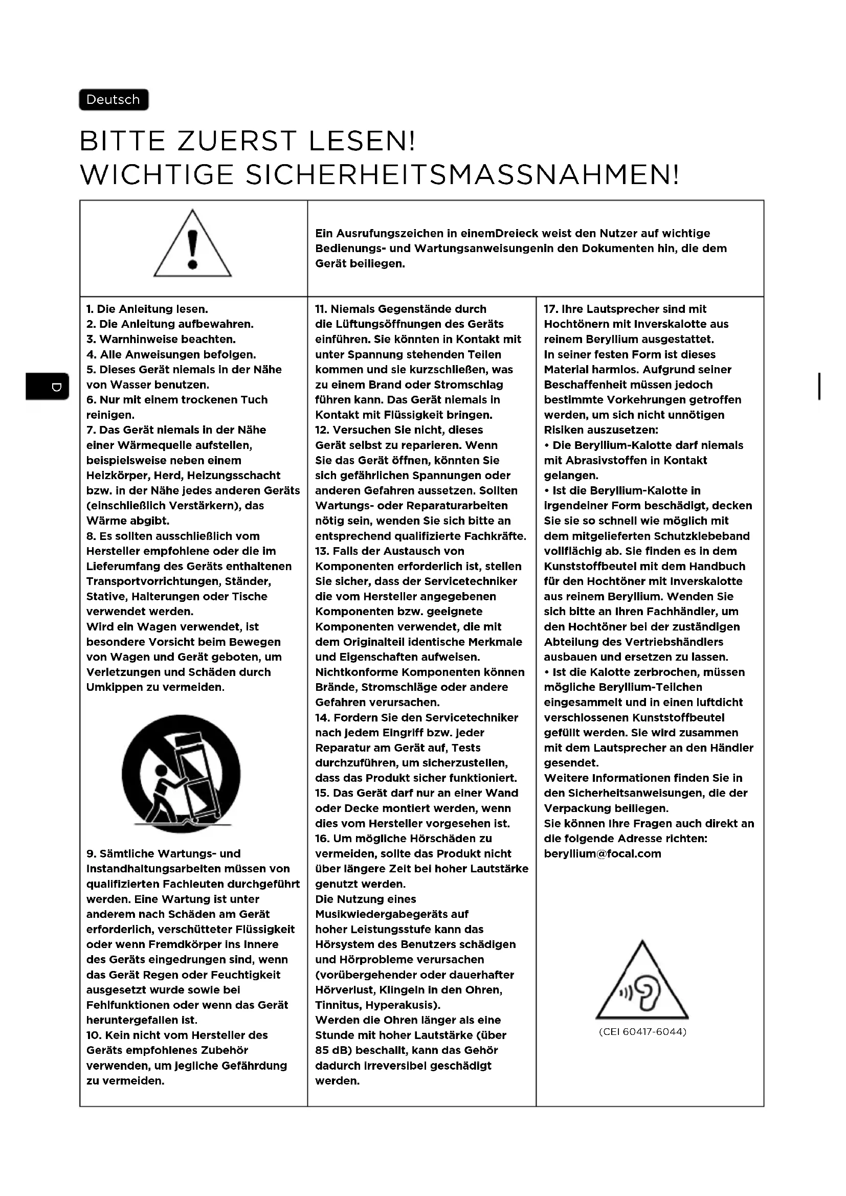 - Ist die Kalotte zerbrochen, müssen mögliche Beryllium-Teilchen eingesammelt und in einen luftdicht verschlossenen Kunststobeutel gefüllt werden. Sie wird zusammen mit dem Lautsprecher an den Händler gesendet. Weitere Informationen finden Sie in den Sicherheitsanweisungen, die der Verpackung beiliegen. Sie können Ihre Fragen auch direkt an die folgende Adresse richten: beryllium@focal.com (CEI 60417-6044)19 SOPRA