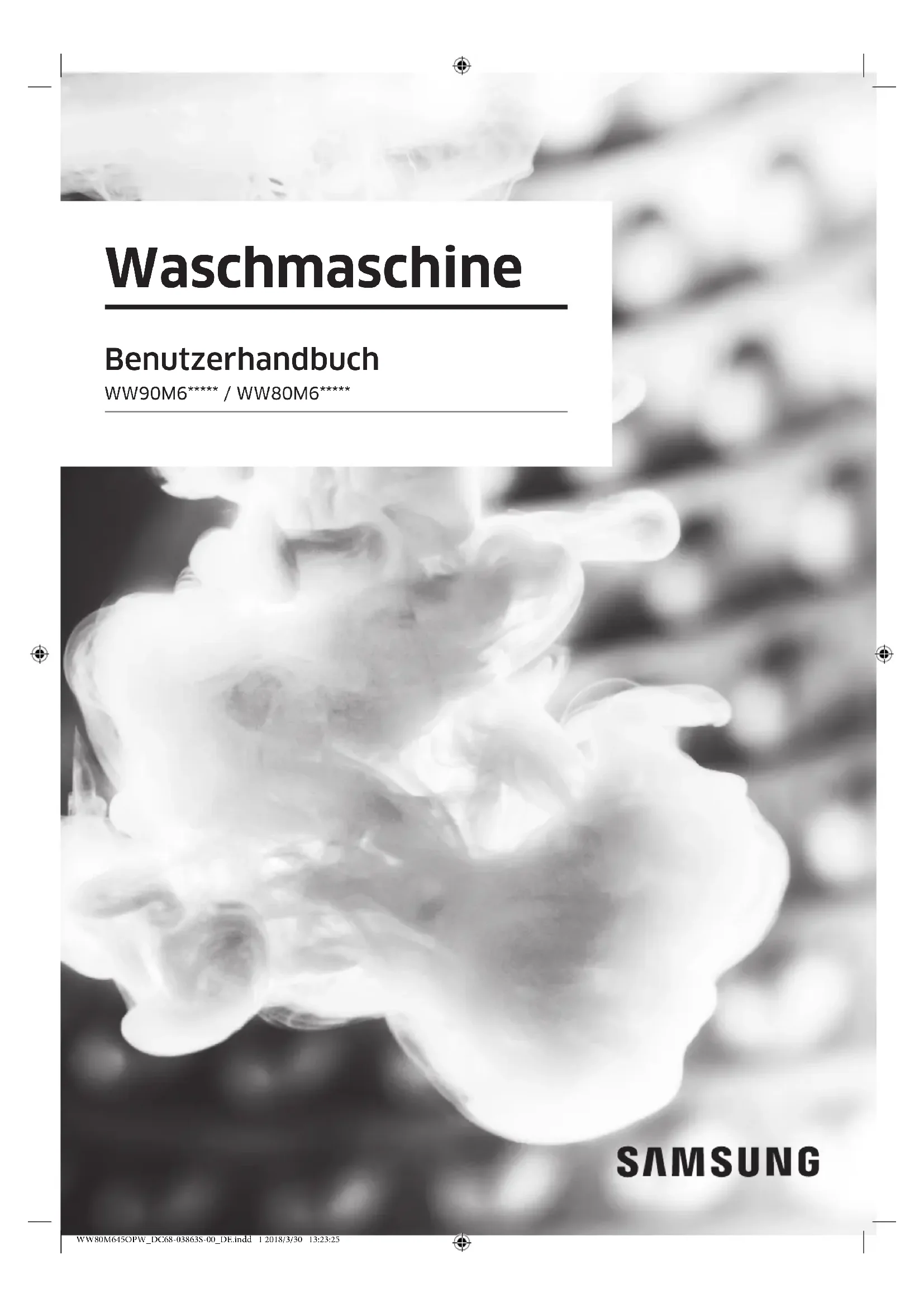 Waschmaschine Benutzerhandbuch WW90M6***** / WW80M6***** WW80M645OPW_DC68-03863S-00_DE.indd 1 2018/3/30 13:23:252 Deutsch Inhalt Inhalt Sicherheitsinformationen 4 Wichtige Informationen zu den Sicherheitshinweisen 4 Wichtige Sicherheitssymbole 4 Wichtige Sicherheitsvorkehrungen 5 Wichtige Warnhinweise für die Installation 6 Vorsichtshinweise für die Installation 8 Wichtige Warnhinweise für die Nutzung 8 Vorsichtshinweise für die Nutzung 10 Wichtige Warnhinweise für die Reinigung 13 Hinweise zum WEEE-Zeichen 14 Installation 15 Das ist inbegriffen 15 Installationsanforderungen 17 Schrittweise Installation 19 Vor dem Start 27 Grundeinstellungen 27 Waschhinweise 27 Richtlinien Waschmittelbehälter 30 Betrieb 33 Bedienfeld 33 Einfache Schritte für den Start 35 Programmübersicht 36 Spezialfunktionen 39 Einstellungen 41 SmartThings 42 WW80M645OPW_DC68-03863S-00_DE.indd 2 2018/3/30 13:23:25Deutsch 3 Inhalt Wartung 47 TROMMELREINIGUNG