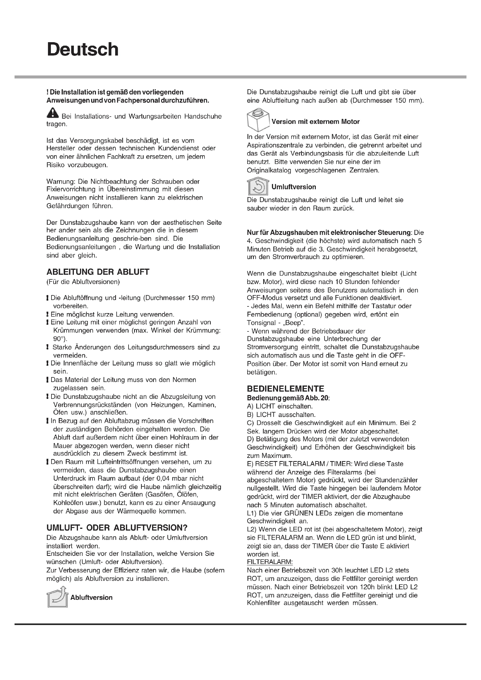 ! Den Raum mit Lufteintrittsöffnungen versehen, um zu vermeiden, dass die Dunstabzugshaube einen Unterdruck im Raum aufbaut (der 0,04 mbar nicht überschreiten darf); wird die Haube nämlich gleichzeitig mit nicht elektrischen Geräten (Gasöfen, Ölöfen, Kohleöfen usw.) benutzt, kann es zu einer Ansaugung der Abgase aus der Wärmequelle kommen. UMLUFT- ODER ABLUFTVERSION? Die Abzugshaube kann als Abluft- oder Umluftversion installiert werden. Entscheiden Sie vor der Installation, welche Version Sie wünschen (Umluft- oder Abluftversion). Zur Verbesserung der Effizienz raten wir, die Haube (sofern möglich) als Abluftversion zu installieren. Abluftversion Die Dunstabzugshaube reinigt die Luft und gibt sie über eine Abluftleitung nach außen ab (Durchmesser 150 mm). Version mit externem Motor In der Version mit externem Motor, ist das Gerät mit einer Aspirationszentrale zu verbinden, die getrennt arbeitet und das Gerät als Verbindungsbasis für die abzuleitende Luft benutzt. Bitte verwenden Sie nur eine der im Originalkatalog vorgeschlagenen Zentralen. Umluftversion Die Dunstabzugshaube reinigt die Luft und leitet sie sauber wieder in den Raum zurück. Nur für Abzugshauben mit elektronischer Steuerung: Die