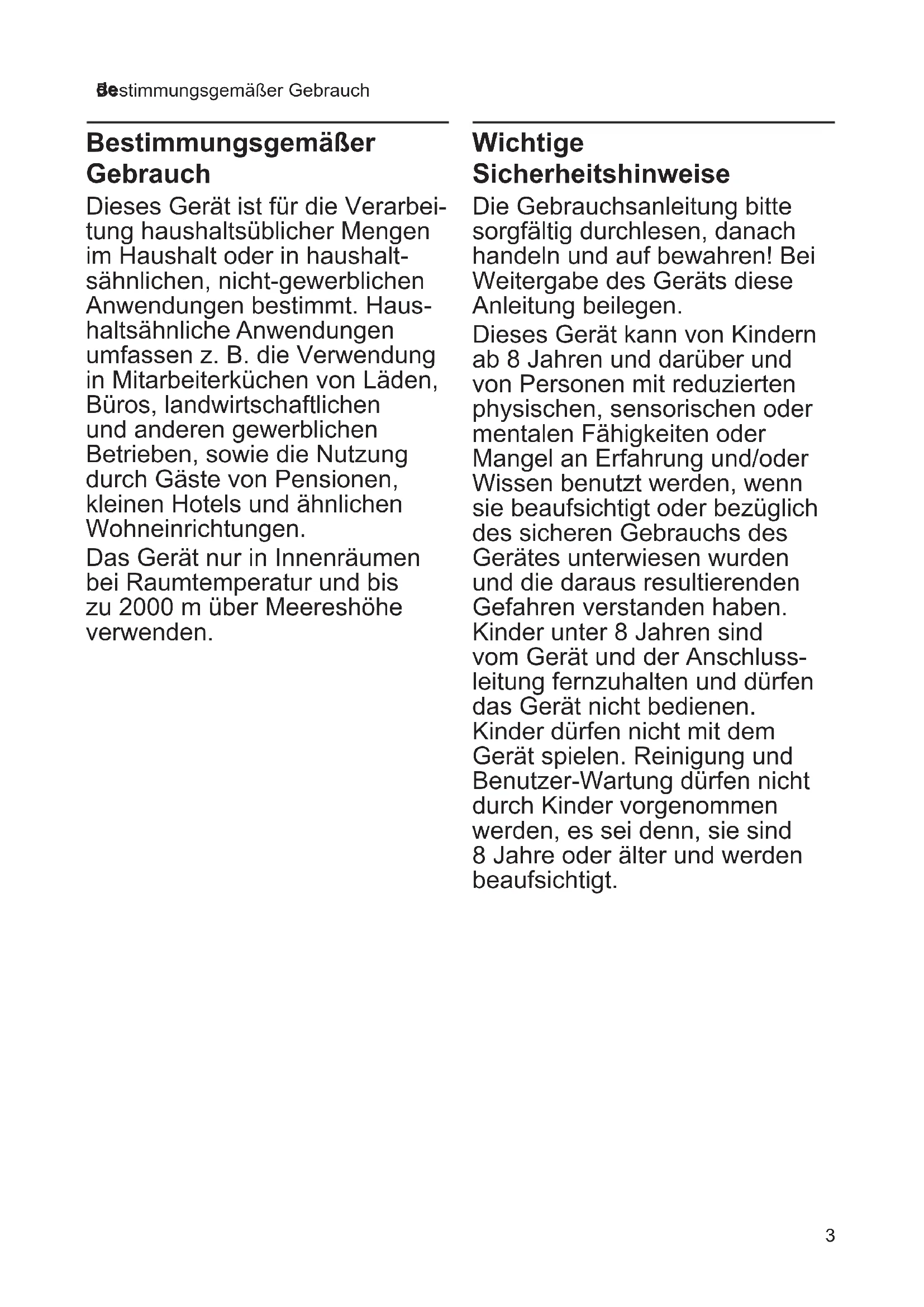 Bestimmungsgemäßer Gebrauch Bestimmungsgemäßer Gebrauch Dieses Gerät ist für die Verarbei- tung haushaltsüblicher Mengen im Haushalt oder in haushalt- sähnlichen, nicht-gewerblichen Anwendungen bestimmt. Haus- haltsähnliche Anwendungen umfassen z. B. die Verwendung in Mitarbeiterküchen von Läden, Büros, landwirtschaftlichen und anderen gewerblichen Betrieben, sowie die Nutzung durch Gäste von Pensionen, kleinen Hotels und ähnlichen Wohneinrichtungen. Das Gerät nur in Innenräumen bei Raumtemperatur und bis zu 2000 m über Meereshöhe verwenden. Wichtige Sicherheitshinweise Die Gebrauchsanleitung bitte sorgfältig durchlesen, danach handeln und auf bewahren! Bei Weitergabe des Geräts diese Anleitung beilegen. Dieses Gerät kann von Kindern ab 8 Jahren und darüber und von Personen mit reduzierten physischen, sensorischen oder mentalen Fähigkeiten oder Mangel an Erfahrung und/oder Wissen benutzt werden, wenn sie beaufsichtigt oder bezüglich des sicheren Gebrauchs des Gerätes unterwiesen wurden und die daraus resultierenden Gefahren verstanden haben. Kinder unter 8 Jahren sind vom Gerät und der Anschluss- leitung fernzuhalten und dürfen das Gerät nicht bedienen. Kinder dürfen nicht mit dem Gerät spielen. Reinigung und Benutzer-Wartung dürfen nicht durch Kinder vorgenommen werden, es sei denn, sie sind 8 Jahre oder älter und werden beaufsichtigt. Bestimmungsgemäßer Gebrauch Wichtige Sicherheitshinweise4 de Bestimmungsgemäßer Gebrauch W Warnung Stromschlaggefahr! ■ Das Gerät darf nur über eine vorschriftsmäßig installierte Steckdose mit Erdung an ein Stromnetz mit Wechselstrom angeschlossen werden. Stellen Sie sicher, dass das Schutzleitersystem der elektrischen Hausinstallation vorschriftsmäßig installiert ist. ■ Gerät nur gemäß Angaben auf dem Typen schild anschließen und betreiben. ■ Nur benutzen, wenn Zuleitung und Gerät keine Beschädi- gungen aufweisen. ■ Reparaturen am Gerät, wie z. B. eine beschädigte Netz- anschlussleitung auswech- seln, dürfen nur durch unseren Kundendienst ausge- führt werden, um Gefähr- dungen zu vermeiden. ■ Gerät oder Netzkabel niemals in Wasser tauchen. ■ Im Fehlerfall sofort den Netzstecker ziehen oder die Netzspannung ausschalten. W Warnung Gefahr durch Magnetismus! Das Gerät enthält Permanent- magnete, die elektronische Implantate wie z. B. Herzschritt- macher oder Insulinpumpen beein ussen können. Träger von elektronischen Implantaten bitte einen Mindestabstand von 10 cm zum Gerät und, bei Entnahme, zu folgenden Teilen einhalten: Milchbehälter, Milchsystem, Wassertank und Brüheinheit. W Warnung Erstickungsgefahr! Kinder nicht mit Verpackungs- material spielen lassen. Klein- teile sicher aufbewahren, sie können verschluckt werden. W Warnung Verletzungsgefahr! ■ Nicht in das Mahlwerk greifen. ■ Fehlanwendung des Gerätes kann zu Verletzungen führen. W Warnung Verbrennungsgefahr! ■ Das Milchsystem wird sehr heiß. Nach Benutzung zuerst abkühlen lassen und erst dann berühren. ■ Nach dem Gebrauch können die Ober ächen von Heiz- element oder Wärmeplatte noch einige Zeit heiß sein.5