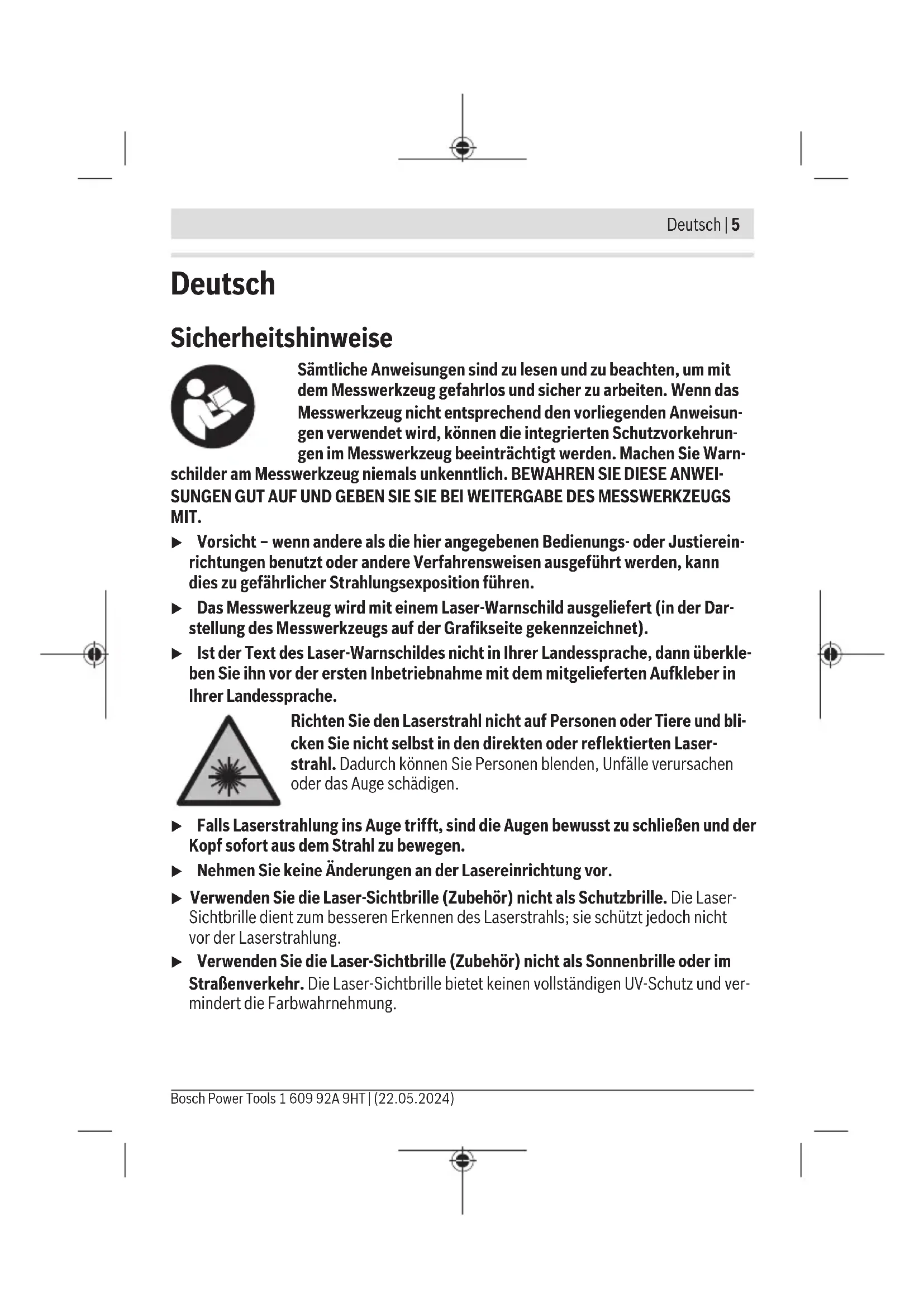 1 609 92A 9HT | (22.05.2024) Bosch Power ToolsDeutsch | 5 Deutsch Sicherheitshinweise Sämtliche Anweisungen sind zu lesen und zu beachten, um mit dem Messwerkzeug gefahrlos und sicher zu arbeiten. Wenn das Messwerkzeug nicht entsprechend den vorliegenden Anweisun- gen verwendet wird, können die integrierten Schutzvorkehrun- gen im Messwerkzeug beeinträchtigt werden. Machen Sie Warn- schilder am Messwerkzeug niemals unkenntlich. BEWAHREN SIE DIESE ANWEI- SUNGEN GUT AUF UND GEBEN SIE SIE BEI WEITERGABE DES MESSWERKZEUGS MIT. u Vorsicht – wenn andere als die hier angegebenen Bedienungs- oder Justierein- richtungen benutzt oder andere Verfahrensweisen ausgeführt werden, kann dies zu gefährlicher Strahlungsexposition führen. u Das Messwerkzeug wird mit einem Laser-Warnschild ausgeliefert (in der Dar- stellung des Messwerkzeugs auf der Grafikseite gekennzeichnet). u Ist der Text des Laser-Warnschildes nicht in Ihrer Landessprache, dann überkle- ben Sie ihn vor der ersten Inbetriebnahme mit dem mitgelieferten Aufkleber in Ihrer Landessprache. Richten Sie den Laserstrahl nicht auf Personen oder Tiere und bli- cken Sie nicht selbst in den direkten oder reflektierten Laser- strahl. Dadurch können Sie Personen blenden, Unfälle verursachen oder das Auge schädigen. u Falls Laserstrahlung ins Auge trifft, sind die Augen bewusst zu schließen und der Kopf sofort aus dem Strahl zu bewegen. u Nehmen Sie keine Änderungen an der Lasereinrichtung vor. u Verwenden Sie die Laser-Sichtbrille (Zubehör) nicht als Schutzbrille. Die Laser- Sichtbrille dient zum besseren Erkennen des Laserstrahls; sie schützt jedoch nicht vor der Laserstrahlung. u Verwenden Sie die Laser-Sichtbrille (Zubehör) nicht als Sonnenbrille oder im Straßenverkehr. Die Laser-Sichtbrille bietet keinen vollständigen UV-Schutz und ver- mindert die Farbwahrnehmung. Bosch Power Tools 1 609 92A 9HT | (22.05.2024)6 | Deutsch u Lassen Sie das Messwerkzeug nur von qualifiziertem Fachpersonal und nur mit Original-Ersatzteilen reparieren. Damit wird sichergestellt, dass die Sicherheit des Messwerkzeuges erhalten bleibt. u Lassen Sie Kinder das Laser-Messwerkzeug nicht unbeaufsichtigt benutzen. Sie könnten unbeabsichtigt andere Personen oder sich selber blenden. u Arbeiten Sie mit dem Messwerkzeug nicht in explosionsgefährdeter Umgebung, in der sich brennbare Flüssigkeiten, Gase oder Stäube befinden. Im Messwerk- zeug können Funken erzeugt werden, die den Staub oder die Dämpfe entzünden. Bringen Sie den Magnet nicht in die Nähe von Implantaten oder sonstigen medizinischen Geräten, wie z.B. Herzschrittmacher oder Insulinpumpe. Durch den Magnetwird ein Feld erzeugt, das die Funktion von Implantaten oder medizinischen Geräten beeinträchti- gen kann. u Halten Sie das Messwerkzeug fern von magnetischen Datenträgern und magne- tisch empfindlichen Geräten. Durch die Wirkung der Magnete kann es zu irreversi- blen Datenverlusten kommen. Produkt- und Leistungsbeschreibung Bitte beachten Sie die Abbildungen im vorderen Teil der Betriebsanleitung. Bestimmungsgemäßer Gebrauch Das Messwerkzeug ist bestimmt zum Ermitteln und Überprüfen von waagerechten und senkrechten Linien sowie Lotpunkten. Das Messwerkzeug ist zur Verwendung im Innenbereich geeignet. Dieses Produkt ist ein Verbraucher-Laser-Produkt gemäß EN50689. Abgebildete Komponenten Die Nummerierung der abgebildeten Komponenten bezieht sich auf die Darstellung des Messwerkzeugs auf der Grafikseite. (1) Austrittsöffnung Laserstrahlung (2) Taste Neigungsfunktion (3) Statusanzeige (4) Taste für Laser-Betriebsart "Mode" (5) Ein-/Ausschalter (6) Stativaufnahme 1/4" 1 609 92A 9HT | (22.05.2024) Bosch Power ToolsDeutsch | 7 (7) Arretierung des Batteriefachdeckels (8) Batteriefachdeckel (9) Laser-Warnschild (10) Seriennummer (11) Stativ
