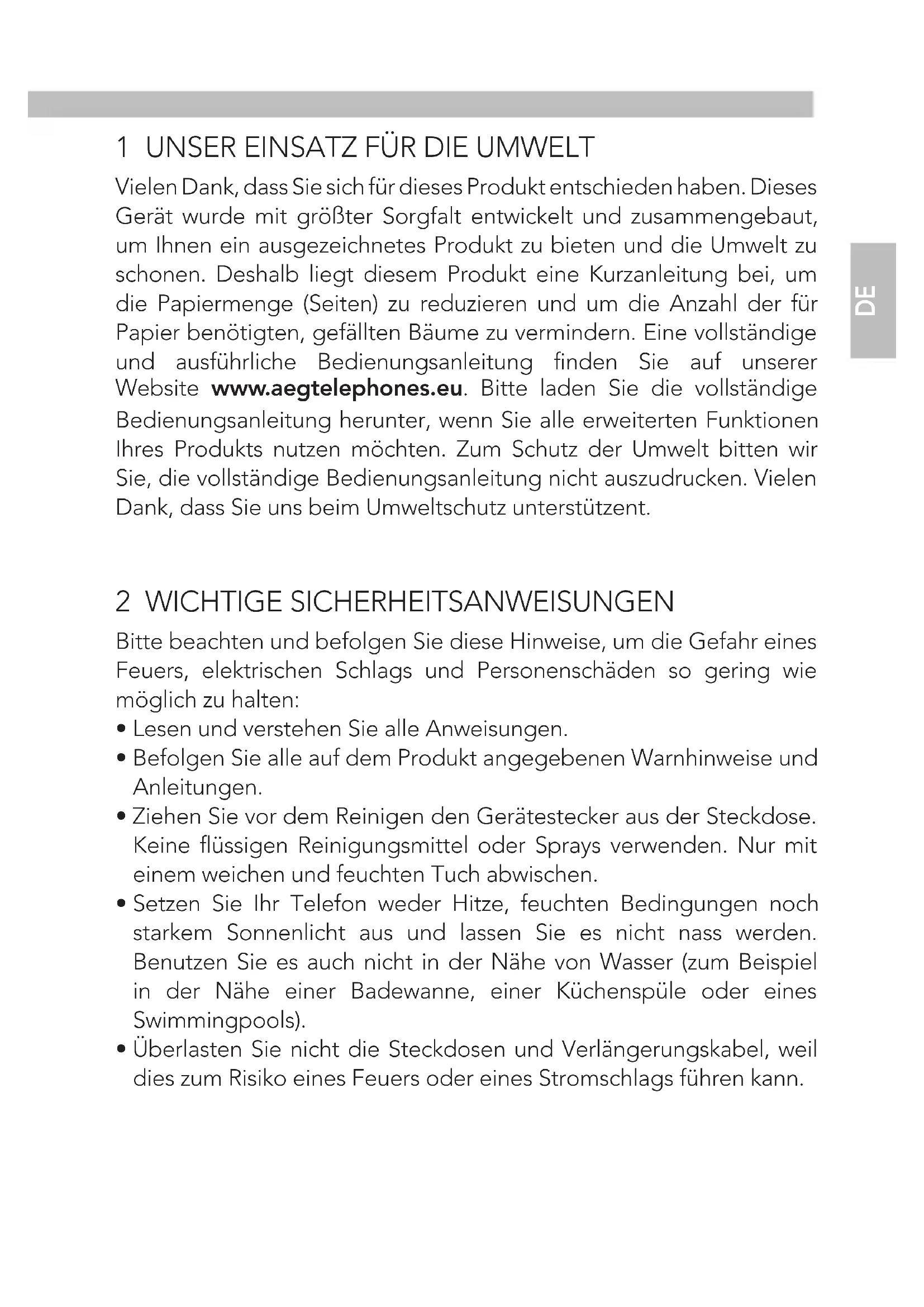 (ENVIRONMENT) At the end of the product lifecycle, you should not throw this product into the normal household garbage but bring the product to a collection point for the recycling of electrical and electronic equipments. The symbol on the product, user guide and/or box indicate this. Some of the product materials can be re-used if you bring them to a recycling point. By reusing some parts or raw materials from used products you make an important contribution to the protection of the environment. Please contact your local authorities in case you need more information on the collection points in your area. Batteries must be removed before disposing of the device. Dispose of the batteries in an environmental manner according to your country regulations.1 UNSER EINSATZ FÜR DIE UMWELT Vielen Dank, dass Sie sich für dieses Produkt entschieden haben. Dieses Gerät wurde mit größter Sorgfalt entwickelt und zusammengebaut, um Ihnen ein ausgezeichnetes Produkt zu bieten und die Umwelt zu schonen. Deshalb liegt diesem Produkt eine Kurzanleitung bei, um die Papiermenge (Seiten) zu reduzieren und um die Anzahl der für Papier benötigten, gefällten Bäume zu vermindern. Eine vollständige und ausführliche Bedienungsanleitung finden Sie auf unserer Website www.aegtelephones.eu. Bitte laden Sie die vollständige Bedienungsanleitung herunter, wenn Sie alle erweiterten Funktionen Ihres Produkts nutzen möchten. Zum Schutz der Umwelt bitten wir Sie, die vollständige Bedienungsanleitung nicht auszudrucken. Vielen Dank, dass Sie uns beim Umweltschutz unterstützent. 2 WICHTIGE SICHERHEITSANWEISUNGEN Bitte beachten und befolgen Sie diese Hinweise, um die Gefahr eines Feuers, elektrischen Schlags und Personenschäden so gering wie möglich zu halten: