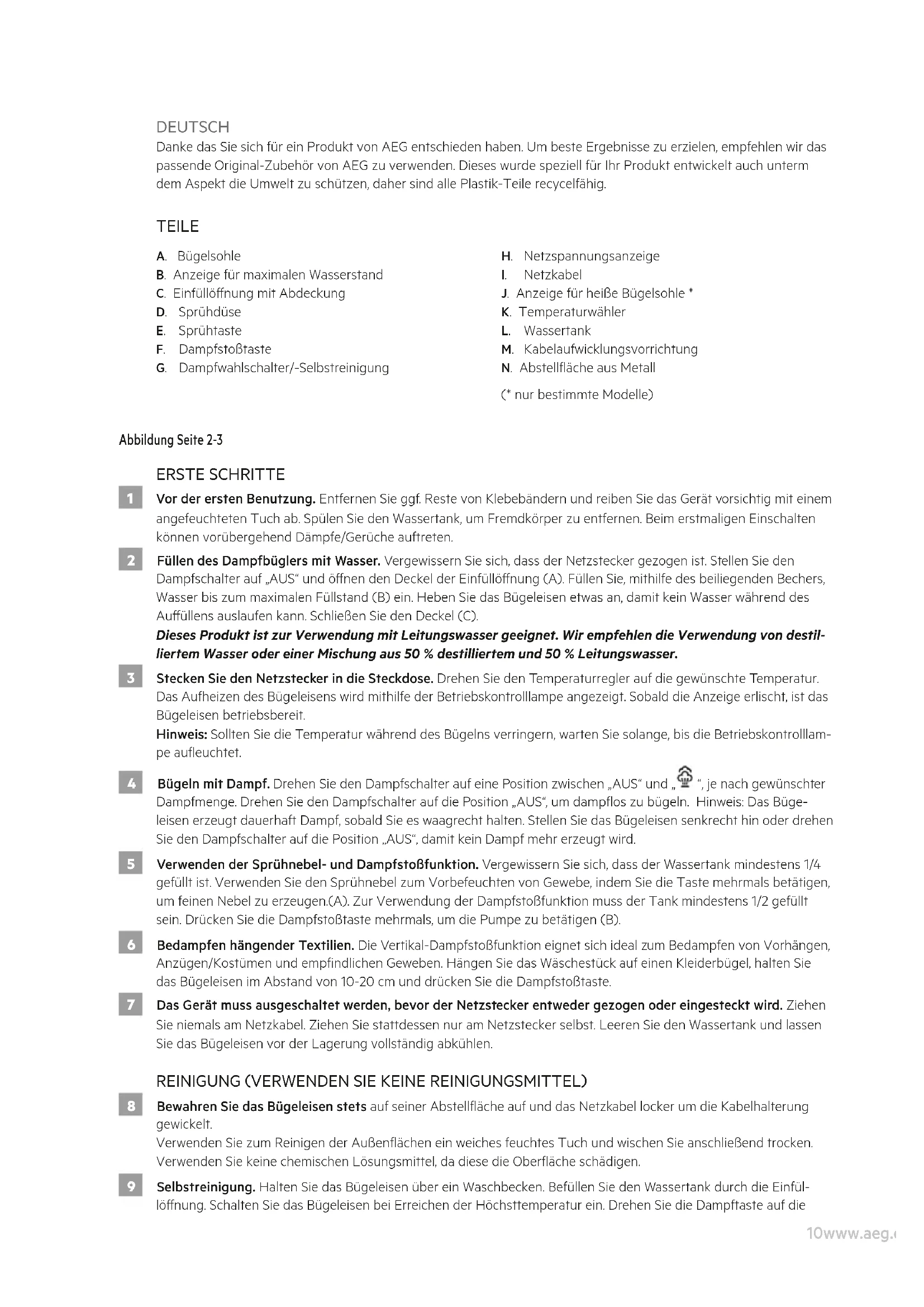J. Anzeige für heiße Bügelsohle * K. Temperaturwähler L. Wassertank M. Kabelaufwicklungsvorrichtung N. Abstelläche aus Metall (* nur bestimmte Modelle) Abbildung Seite 2-3 ERSTE SCHRITTE 1 Vor der ersten Benutzung. Entfernen Sie ggf. Reste von Klebebändern und reiben Sie das Gerät vorsichtig mit einem angefeuchteten Tuch ab. Spülen Sie den Wassertank, um Fremdkörper zu entfernen. Beim erstmaligen Einschalten können vorübergehend Dämpfe/Gerüche auftreten. 2 Füllen des Dampfbüglers mit Wasser. Vergewissern Sie sich, dass der Netzstecker gezogen ist. Stellen Sie den Dampfschalter auf „AUS“ und önen den Deckel der Einfüllönung (A). Füllen Sie, mithilfe des beiliegenden Bechers, Wasser bis zum maximalen Füllstand (B) ein. Heben Sie das Bügeleisen etwas an, damit kein Wasser während des Auüllens auslaufen kann. Schließen Sie den Deckel (C). Dieses Produkt ist zur Verwendung mit Leitungswasser geeignet. Wir empfehlen die Verwendung von destil- liertem Wasser oder einer Mischung aus 50 % destilliertem und 50 % Leitungswasser. 3 Stecken Sie den Netzstecker in die Steckdose. Drehen Sie den Temperaturregler auf die gewünschte Temperatur. Das Aufheizen des Bügeleisens wird mithilfe der Betriebskontrolllampe angezeigt. Sobald die Anzeige erlischt, ist das Bügeleisen betriebsbereit. Hinweis: Sollten Sie die Temperatur während des Bügelns verringern, warten Sie solange, bis die Betriebskontrolllam- pe aueuchtet. 4 Bügeln mit Dampf. Drehen Sie den Dampfschalter auf eine Position zwischen „AUS“ und „ “, je nach gewünschter Dampfmenge. Drehen Sie den Dampfschalter auf die Position „AUS“, um dampos zu bügeln. Hinweis: Das Büge- leisen erzeugt dauerhaft Dampf, sobald Sie es waagrecht halten. Stellen Sie das Bügeleisen senkrecht hin oder drehen Sie den Dampfschalter auf die Position „AUS“, damit kein Dampf mehr erzeugt wird. 5 Verwenden der Sprühnebel- und Dampfstoßfunktion. Vergewissern Sie sich, dass der Wassertank mindestens 1/4 gefüllt ist. Verwenden Sie den Sprühnebel zum Vorbefeuchten von Gewebe, indem Sie die Taste mehrmals betätigen, um feinen Nebel zu erzeugen.(A). Zur Verwendung der Dampfstoßfunktion muss der Tank mindestens 1/2 gefüllt sein. Drücken Sie die Dampfstoßtaste mehrmals, um die Pumpe zu betätigen (B). 6 Bedampfen hängender Textilien. Die Vertikal-Dampfstoßfunktion eignet sich ideal zum Bedampfen von Vorhängen, Anzügen/Kostümen und empndlichen Geweben. Hängen Sie das Wäschestück auf einen Kleiderbügel, halten Sie das Bügeleisen im Abstand von 10-20 cm und drücken Sie die Dampfstoßtaste. 7 Das Gerät muss ausgeschaltet werden, bevor der Netzstecker entweder gezogen oder eingesteckt wird. Ziehen Sie niemals am Netzkabel. Ziehen Sie stattdessen nur am Netzstecker selbst. Leeren Sie den Wassertank und lassen Sie das Bügeleisen vor der Lagerung vollständig abkühlen. REINIGUNG (VERWENDEN SIE KEINE REINIGUNGSMITTEL) 8 Bewahren Sie das Bügeleisen stets auf seiner Abstelläche auf und das Netzkabel locker um die Kabelhalterung gewickelt. Verwenden Sie zum Reinigen der Außenächen ein weiches feuchtes Tuch und wischen Sie anschließend trocken. Verwenden Sie keine chemischen Lösungsmittel, da diese die Oberäche schädigen. 9 Selbstreinigung. Halten Sie das Bügeleisen über ein Waschbecken. Befüllen Sie den Wassertank durch die Einfül- lönung. Schalten Sie das Bügeleisen bei Erreichen der Höchsttemperatur ein. Drehen Sie die Dampftaste auf die11www.aeg.com