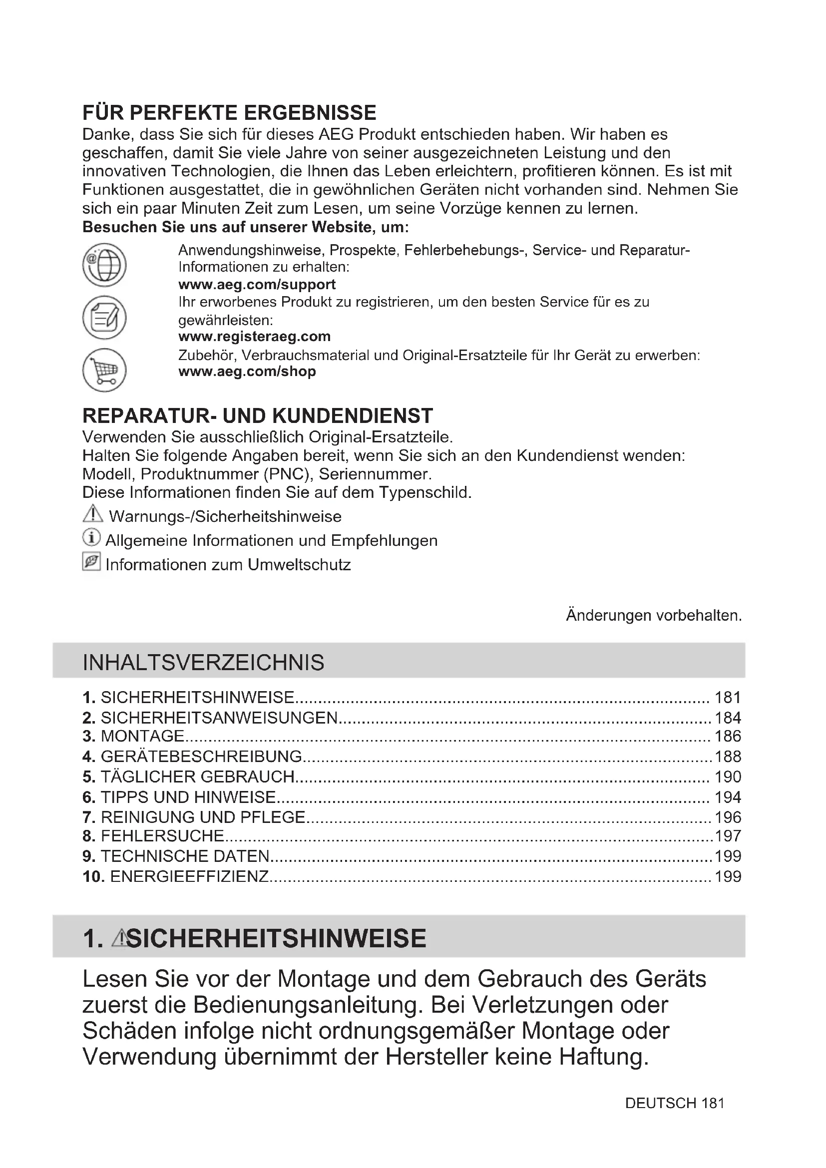 Danke, dass Sie sich für dieses AEG Produkt entschieden haben. Wir haben es geschaffen, damit Sie viele Jahre von seiner ausgezeichneten Leistung und den innovativen Technologien, die Ihnen das Leben erleichtern, profitieren können. Es ist mit Funktionen ausgestattet, die in gewöhnlichen Geräten nicht vorhanden sind. Nehmen Sie sich ein paar Minuten Zeit zum Lesen, um seine Vorzüge kennen zu lernen. Besuchen Sie uns auf unserer Website, um:Anwendungshinweise, Prospekte, Fehlerbehebungs-, Service- und Reparatur-Informationen zu erhalten:www.aeg.com/supportIhr erworbenes Produkt zu registrieren, um den besten Service für es zugewährleisten:www.registeraeg.comZubehör, Verbrauchsmaterial und Original-Ersatzteile für Ihr Gerät zu erwerben:www.aeg.com/shop