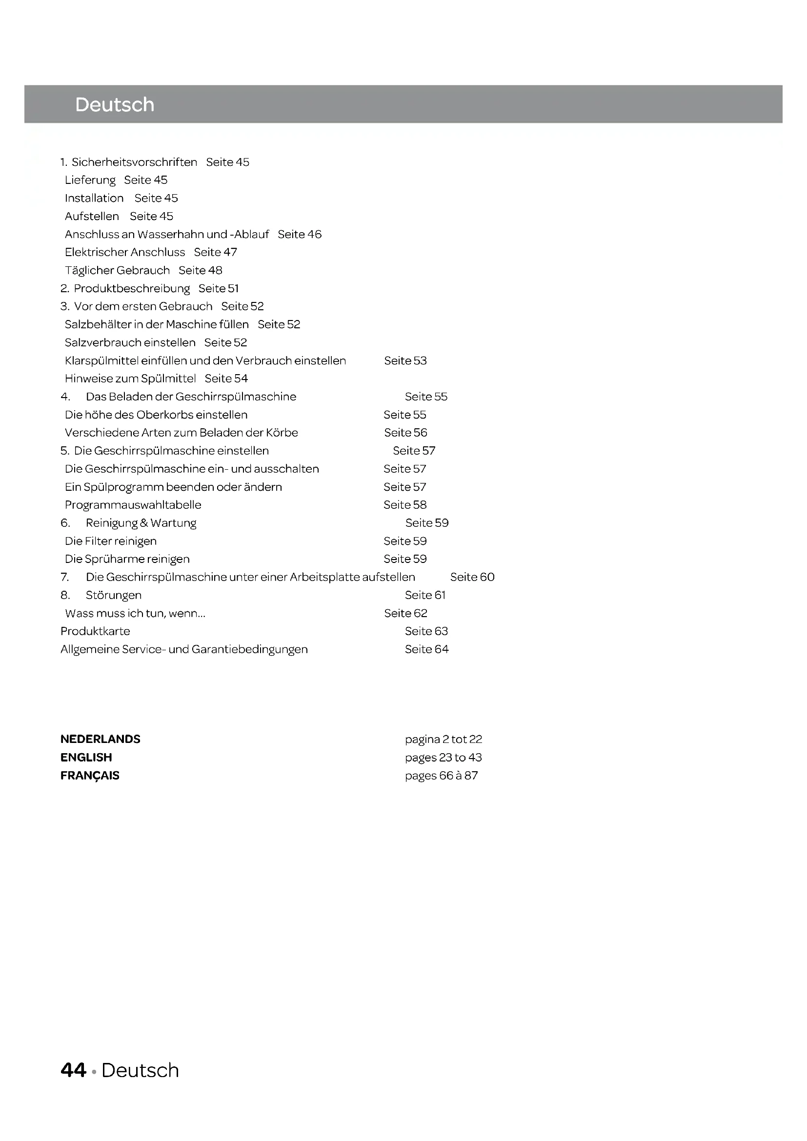 - 431. Sicherheitsvorschriften Seite 45 Lieferung Seite 45 Installation Seite 45 Aufstellen Seite 45 Anschluss an Wasserhahn und -Ablauf Seite 46 Elektrischer Anschluss Seite 47 Täglicher Gebrauch Seite 48