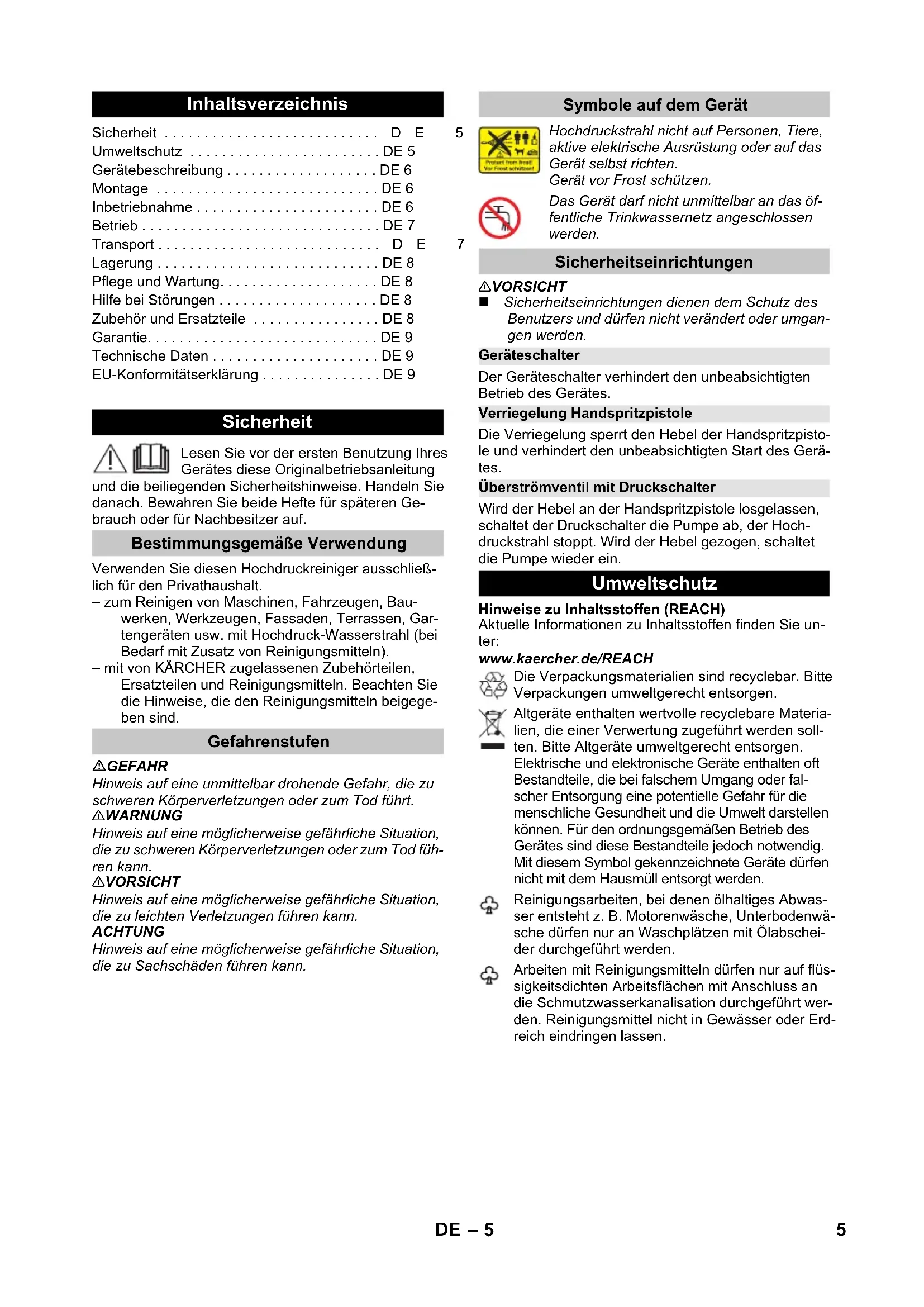;;– 5 Lesen Sie vor der ersten Benutzung Ihres Gerätes diese Originalbetriebsanleitung und die beiliegenden Sicherheitshinweise. Handeln Sie danach. Bewahren Sie beide Hefte für späteren Ge- brauch oder für Nachbesitzer auf. Verwenden Sie diesen Hochdruckreiniger ausschließ- lich für den Privathaushalt. – zum Reinigen von Maschinen, Fahrzeugen, Bau- werken, Werkzeugen, Fassaden, Terrassen, Gar- tengeräten usw. mit Hochdruck-Wasserstrahl (bei Bedarf mit Zusatz von Reinigungsmitteln). – mit von KÄRCHER zugelassenen Zubehörteilen, Ersatzteilen und Reinigungsmitteln. Beachten Sie die Hinweise, die den Reinigungsmitteln beigege- ben sind. GEFAHR Hinweis auf eine unmittelbar drohende Gefahr, die zu schweren Körperverletzungen oder zum Tod führt. 몇 WARNUNG Hinweis auf eine möglicherweise gefährliche Situation, die zu schweren Körperverletzungen oder zum Tod füh- ren kann. 몇 VORSICHT Hinweis auf eine möglicherweise gefährliche Situation, die zu leichten Verletzungen führen kann. ACHTUNG Hinweis auf eine möglicherweise gefährliche Situation, die zu Sachschäden führen kann. 몇 VORSICHT Sicherheitseinrichtungen dienen dem Schutz des Benutzers und dürfen nicht verändert oder umgan- gen werden. Der Geräteschalter verhindert den unbeabsichtigten Betrieb des Gerätes. Die Verriegelung sperrt den Hebel der Handspritzpisto- le und verhindert den unbeabsichtigten Start des Gerä- tes. Wird der Hebel an der Handspritzpistole losgelassen, schaltet der Druckschalter die Pumpe ab, der Hoch- druckstrahl stoppt. Wird der Hebel gezogen, schaltet die Pumpe wieder ein. Hinweise zu Inhaltsstoffen (REACH) Aktuelle Informationen zu Inhaltsstoffen finden Sie un- ter: www.kaercher.de/REACH Inhaltsverzeichnis Sicherheit ...DE 5 Umweltschutz ... DE 5 Gerätebeschreibung ... DE 6 Montage ... DE 6 Inbetriebnahme ... DE 6 Betrieb ... DE 7 Transport ...DE 7 Lagerung ... DE 8 Pflege und Wartung... DE 8 Hilfe bei Störungen ... DE 8 Zubehör und Ersatzteile ... DE 8 Garantie... DE 9 Technische Daten ... DE 9 EU-Konformitätserklärung ... DE 9 Sicherheit Bestimmungsgemäße Verwendung Gefahrenstufen Symbole auf dem Gerät Hochdruckstrahl nicht auf Personen, Tiere, aktive elektrische Ausrüstung oder auf das Gerät selbst richten. Gerät vor Frost schützen. Das Gerät darf nicht unmittelbar an das öf- fentliche Trinkwassernetz angeschlossen werden. Sicherheitseinrichtungen Geräteschalter Verriegelung Handspritzpistole Überströmventil mit Druckschalter Umweltschutz Die Verpackungsmaterialien sind recyclebar. Bitte Verpackungen umweltgerecht entsorgen. Altgeräte enthalten wertvolle recyclebare Materia- lien, die einer Verwertung zugeführt werden soll- ten. Bitte Altgeräte umweltgerecht entsorgen. Elektrische und elektronische Geräte enthalten oft Bestandteile, die bei falschem Umgang oder fal- scher Entsorgung eine potentielle Gefahr für die menschliche Gesundheit und die Umwelt darstellen können. Für den ordnungsgemäßen Betrieb des Gerätes sind diese Bestandteile jedoch notwendig. Mit diesem Symbol gekennzeichnete Geräte dürfen nicht mit dem Hausmüll entsorgt werden. Reinigungsarbeiten, bei denen ölhaltiges Abwas- ser entsteht z. B. Motorenwäsche, Unterbodenwä- sche dürfen nur an Waschplätzen mit Ölabschei- der durchgeführt werden. Arbeiten mit Reinigungsmitteln dürfen nur auf flüs- sigkeitsdichten Arbeitsflächen mit Anschluss an die Schmutzwasserkanalisation durchgeführt wer- den. Reinigungsmittel nicht in Gewässer oder Erd- reich eindringen lassen. 5DE– 6 In dieser Betriebsanleitung wird die maximale Ausstat- tung beschrieben. Je nach Modell gibt es Unterschiede im Lieferumfang (siehe Verpackung). Der Lieferumfang Ihres Gerätes ist auf der Verpackung abgebildet. Prüfen Sie beim Auspacken den Inhalt auf Vollständigkeit. Bei fehlendem Zubehör oder bei Transportschäden be- nachrichtigen Sie bitte ihren Händler. Abbildungen siehe Ausklappseite! 1 Hochdruckanschluss 2 Geräteschalter „0/OFF“ / „I/ON“ 3 Aufbewahrungshaken für Netzanschlussleitung 4 Aufbewahrung für Hochdruckschlauch 5 Transportgriff 6 Wasseranschluss mit eingebautem Sieb 7 Reinigungsmittel-Saugschlauch mit Reinigungs- mittel-Filter und Deckel 8 Reinigungsmitteltank 9 Kupplung für Wasseranschluss 10 Aufbewahrung für Strahlrohr 11 Aufbewahrung für Handspritzpistole 12 Netzanschlussleitung mit Netzstecker 13 Transportrad 14 Handspritzpistole 15 Verriegelung Handspritzpistole 16 Klammer für Hochdruckschlauch 17 Hochdruckschlauch 18 Strahlrohr mit Druckregulierung (Vario Power) Für die gängigsten Reinigungsaufgaben. Der Ar- beitsdruck ist stufenlos zwischen „Min“ und „Max“ regelbar. In Stellung „Mix“ kann Reinigungsmittel zudosiert werden. Zum Verstellen des Arbeitsdrucks, Hebel der Handspritzpistole loslassen und Strahlrohr auf ge- wünschte Stellung drehen. 19 Strahlrohr mit Dreckfräser Für hartnäckige Verschmutzungen. Dem Gerät lose beigelegte Teile vor Inbetriebnahme montieren. Abbildungen siehe Ausklappseite! Abbildung Transporträder einstecken und einrasten. Abbildung Transportgriff aufstecken und verschrauben. Abbildung Kupplung auf Wasseranschluss des Gerätes schrauben. Abbildung Klammer für Hochdruckschlauch aus Handspritz- pistole herausziehen. Abbildung Hochdruckschlauch in Handspritzpistole stecken. Klammer eindrücken, bis sie einrastet. Sichere Verbindung durch Ziehen am Hochdruckschlauch prüfen. Gerät auf eine ebene Fläche stellen. Abbildung Hochdruckschlauch mit dem Hochdruckanschluss des Gerätes verbinden. Netzstecker in Steckdose stecken. Anschlusswerte siehe Typenschild/Technische Daten. Vorschriften des Wasserversorgungsunternehmens be- achten. ACHTUNG Verunreinigungen im Wasser können die Hochdruck- pumpe und das Zubehör beschädigen. Zum Schutz wird die Verwendung des KÄRCHER-Wasserfilters (Sonderzubehör, Bestellnummer 4.730-059) empfoh- len. Wasserzulaufschlauch auf Kupplung am Wasser- anschluss stecken. Wasserzulaufschlauch an die W
