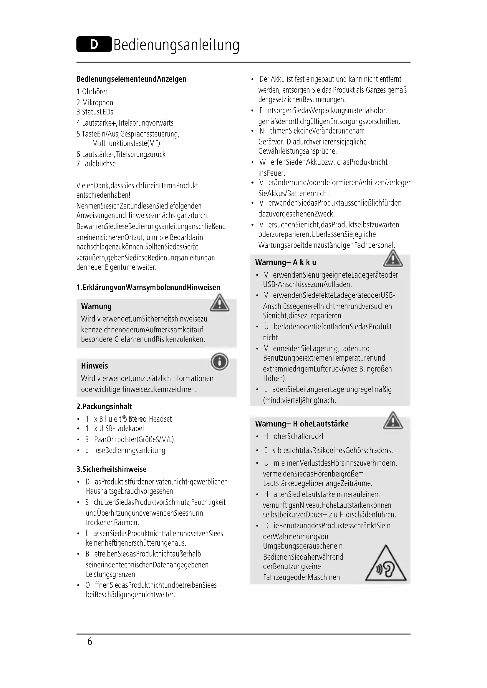 - Die Benutzung des Produktes schränkt Sie in der Wahrnehmung von Umgebungsgeräuschen ein. Bedienen Sie daher während der Benutzung keine Fahrzeuge oder Maschinen.7