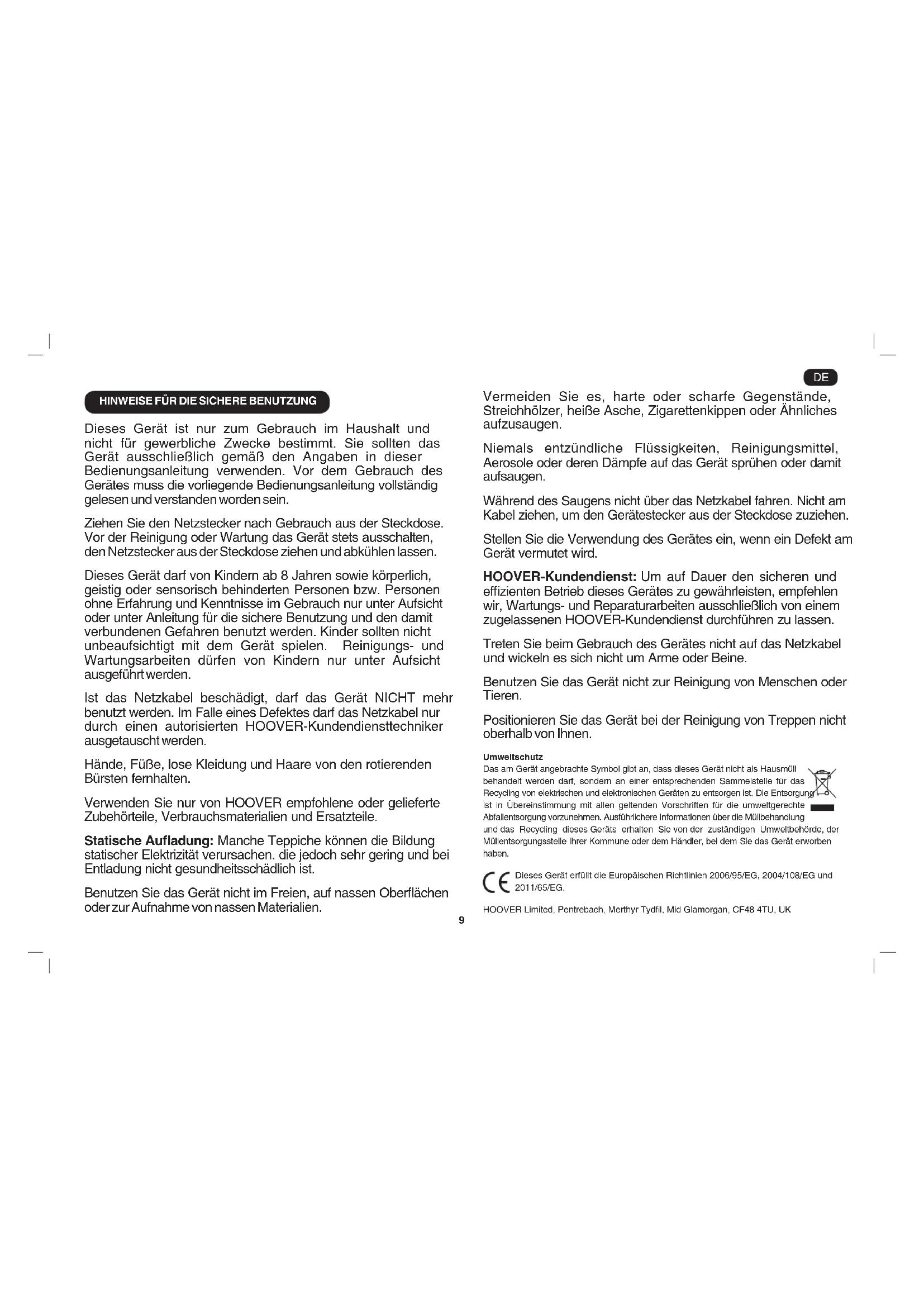 HOOVER-Kundendienst: Um auf Dauer den sicheren und effizienten Betrieb these Gerätes zu gewährleisten, empfehlen wir, Wartungs- und Reparaturarbeiten ausschließlich von einem zugelassenen HOOVER-Kundendienst durchführten zu halten.