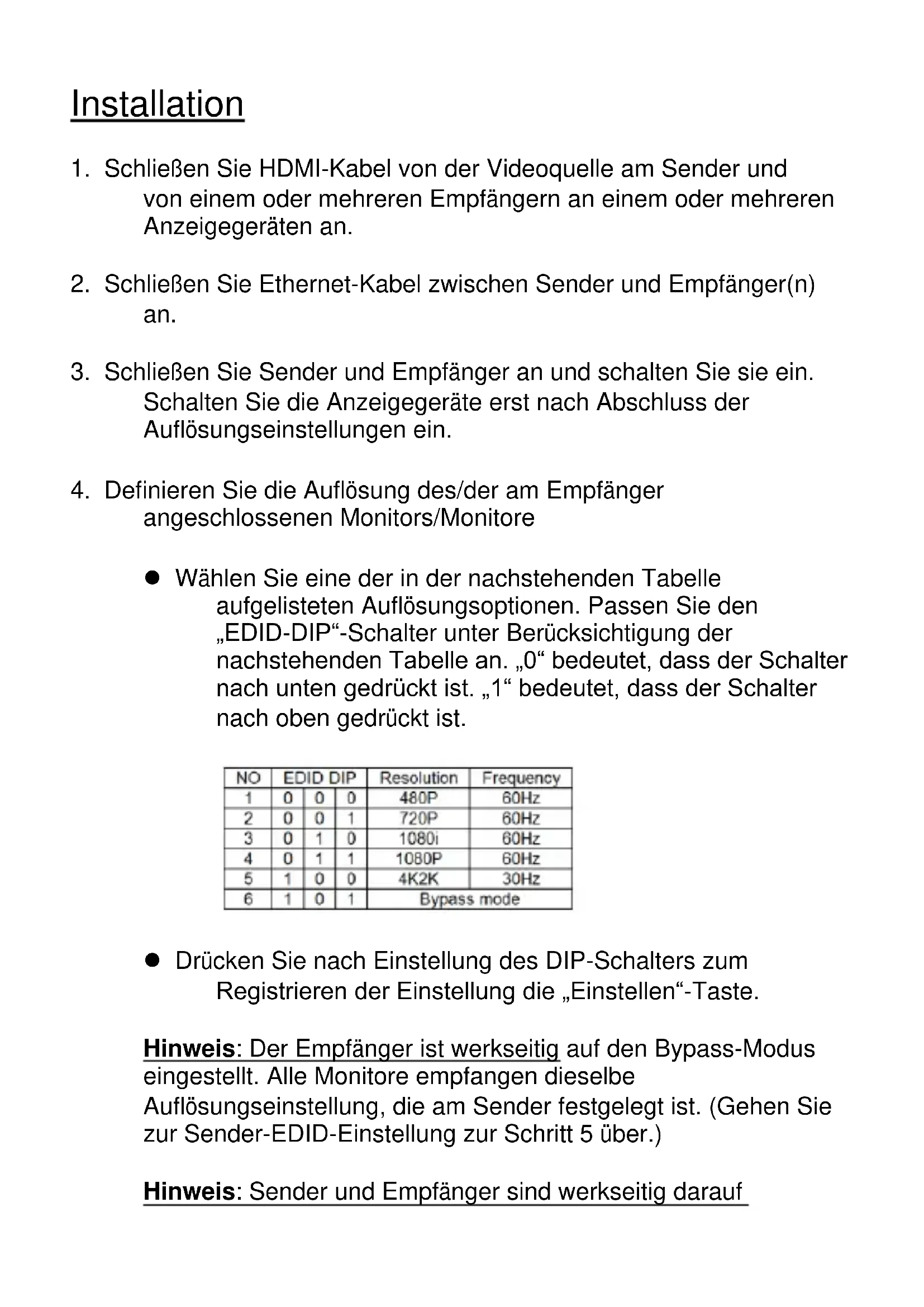 angeschlossenen Monitors/Monitore Wählen Sie eine der in der nachstehenden Tabelle aufgelisteten Auflösungsoptionen. Passen Sie den „EDID-DIP“-Schalter unter Berücksichtigung der nachstehenden Tabelle an. „0“ bedeutet, dass der Schalter nach unten gedrückt ist. „1“ bedeutet, dass der Schalter nach oben gedrückt ist. Drücken Sie nach Einstellung des DIP-Schalters zum Registrieren der Einstellung die „Einstellen“-Taste. Hinweis: Der Empfänger ist werkseitig auf den Bypass-Modus eingestellt. Alle Monitore empfangen dieselbe Auflösungseinstellung, die am Sender festgelegt ist. (Gehen Sie zur Sender-EDID-Einstellung zur Schritt 5 über.) Hinweis: Sender und Empfänger sind werkseitig daraufeingestellt, dass alle an Sender und Empfänger angeschlossenen Monitore Videosignale bei 1080p, 60 Hz empfangen. Hinweis: Empfänger ist auf Bypass-Modus, Sender auf LOKALE AUSGABE-EDID lesen eingestellt – der Sender liest automatisch EDID vom angeschlossenen Monitor und speist dieselbe Einstellung an allen am Empfänger angeschlossenen Monitoren ein. Wenn kein lokaler Monitor direkt mit dem Sender verbunden ist, können EDID nicht erkannt werden und es kommt möglicherweise zu einem Anzeigefehler.