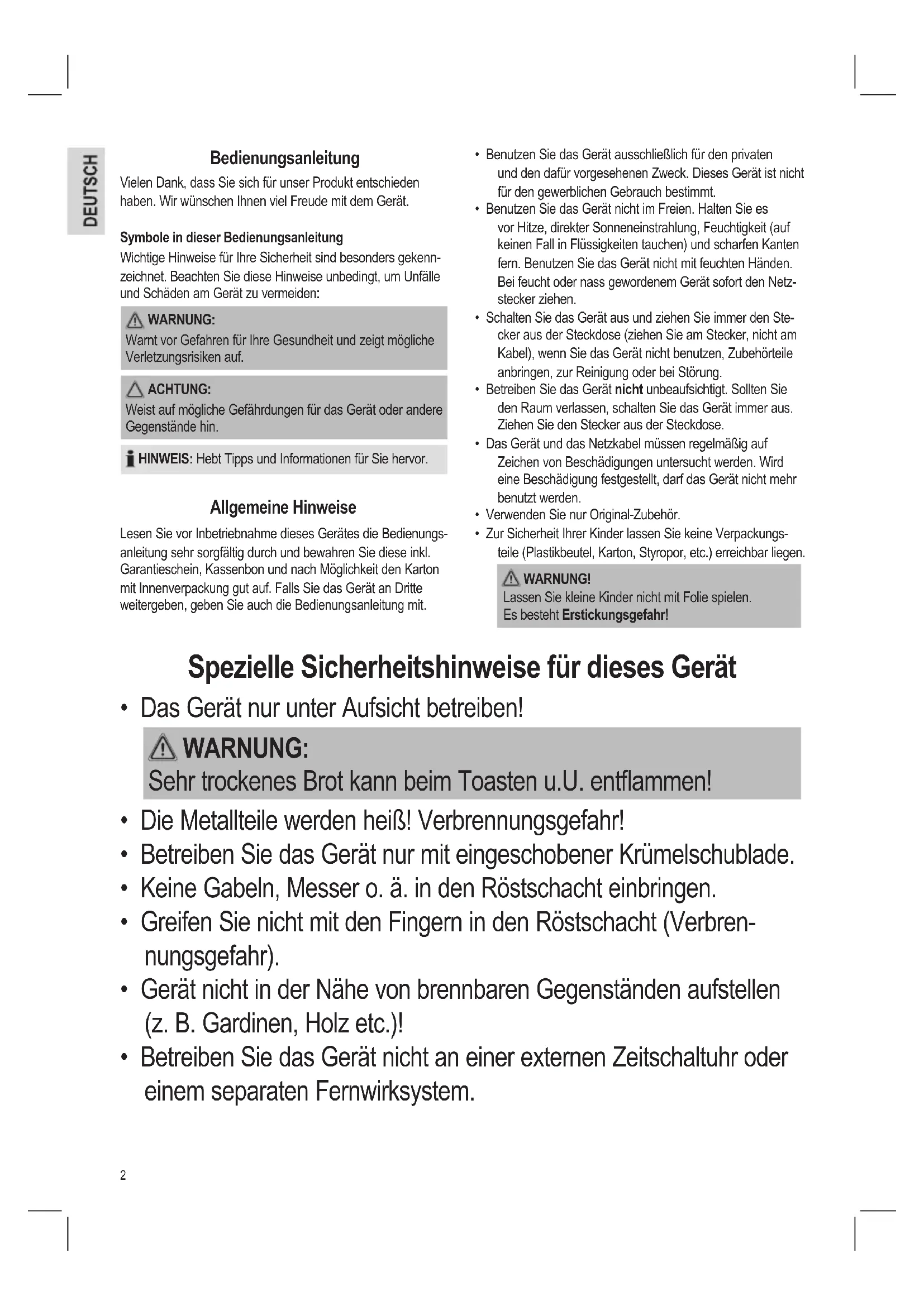 - Das Gerät nur unter Aufsicht betreiben! WARNUNG: Sehr trockenes Brot kann beim Toasten u.U. entammen!