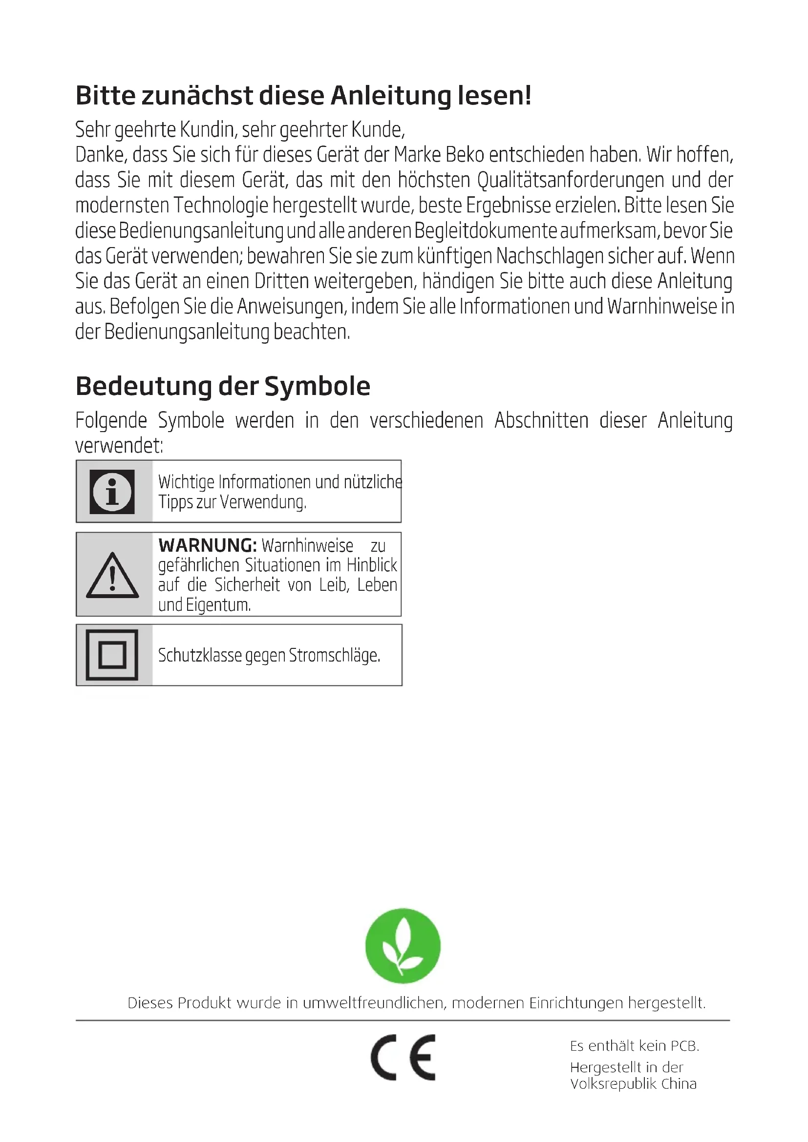 - Dropping the appliance may render it non- operational or cause permanent damage.Bitte zunächst diese Anleitung lesen! Sehr geehrte Kundin, sehr geehrter Kunde, Danke, dass Sie sich für dieses Gerät der Marke Beko entschieden haben. Wir hoffen, dass Sie mit diesem Gerät, das mit den höchsten Qualitätsanforderungen und der modernsten Technologie hergestellt wurde, beste Ergebnisse erzielen. Bitte lesen Sie diese Bedienungsanleitung und alle anderen Begleitdokumente aufmerksam, bevor Sie das Gerät verwenden; bewahren Sie sie zum künftigen Nachschlagen sicher auf. Wenn Sie das Gerät an einen Dritten weitergeben, händigen Sie bitte auch diese Anleitung aus. Befolgen Sie die Anweisungen, indem Sie alle Informationen und Warnhinweise in der Bedienungsanleitung beachten. Bedeutung der Symbole Folgende Symbole werden in den verschiedenen Abschnitten dieser Anleitung verwendet: