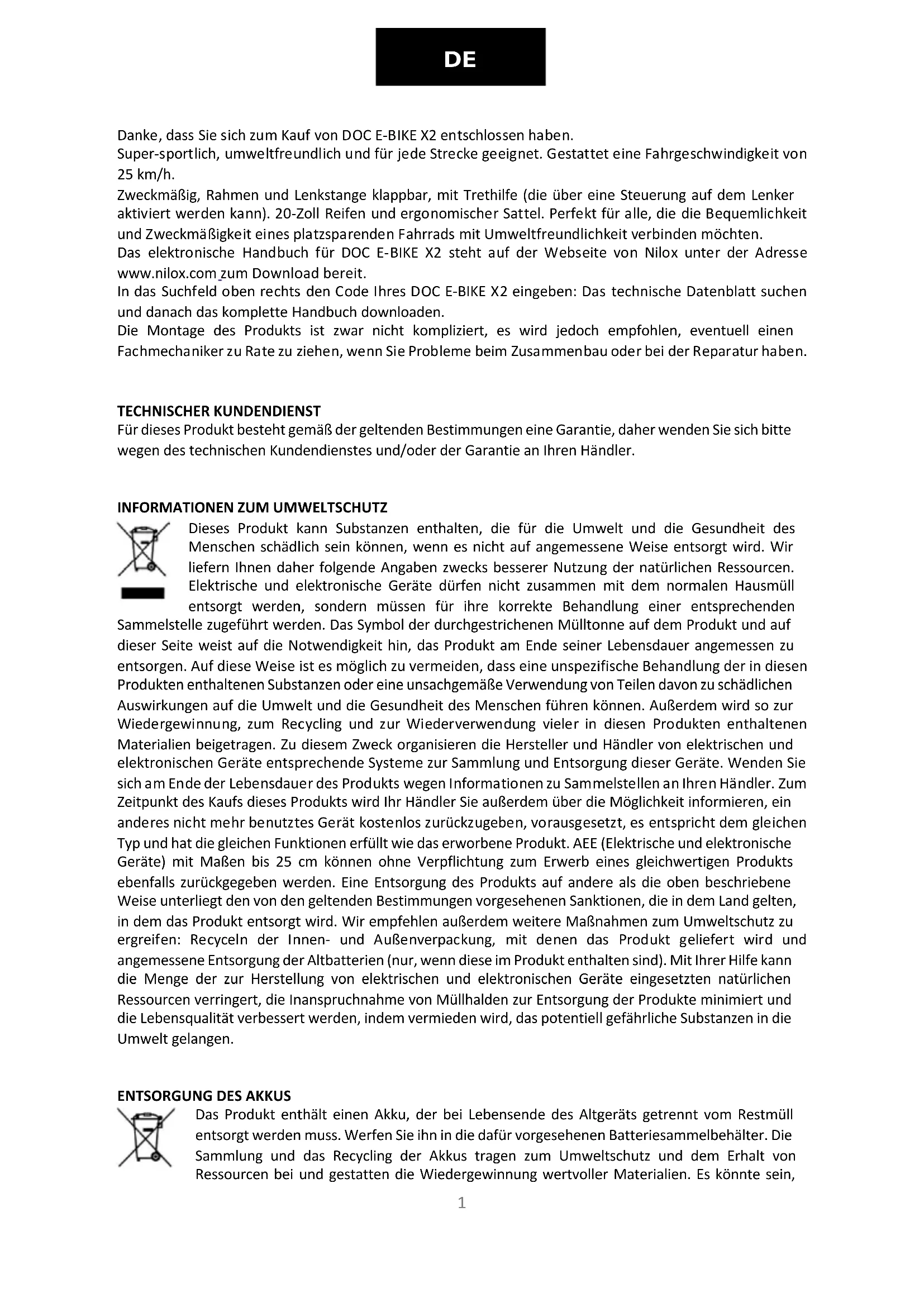 Danke, dass Sie sich zum Kauf von DOC E-BIKE X2 entschlossen haben. Super-sportlich, umweltfreundlich und für jede Strecke geeignet. Gestattet eine Fahrgeschwindigkeit von 25 km/h. Zweckmäßig, Rahmen und Lenkstange klappbar, mit Trethilfe (die über eine Steuerung auf dem Lenker aktiviert werden kann). 20-Zoll Reifen und ergonomischer Sattel. Perfekt für alle, die die Bequemlichkeit und Zweckmäßigkeit eines platzsparenden Fahrrads mit Umweltfreundlichkeit verbinden möchten. Das elektronische Handbuch für DOC E-BIKE X2 steht auf der Webseite von Nilox unter der Adresse www.nilox.com zum Download bereit. In das Suchfeld oben rechts den Code Ihres DOC E-BIKE X2 eingeben: Das technische Datenblatt suchen und danach das komplette Handbuch downloaden. Die Montage des Produkts ist zwar nicht kompliziert, es wird jedoch empfohlen, eventuell einen Fachmechaniker zu Rate zu ziehen, wenn Sie Probleme beim Zusammenbau oder bei der Reparatur haben.