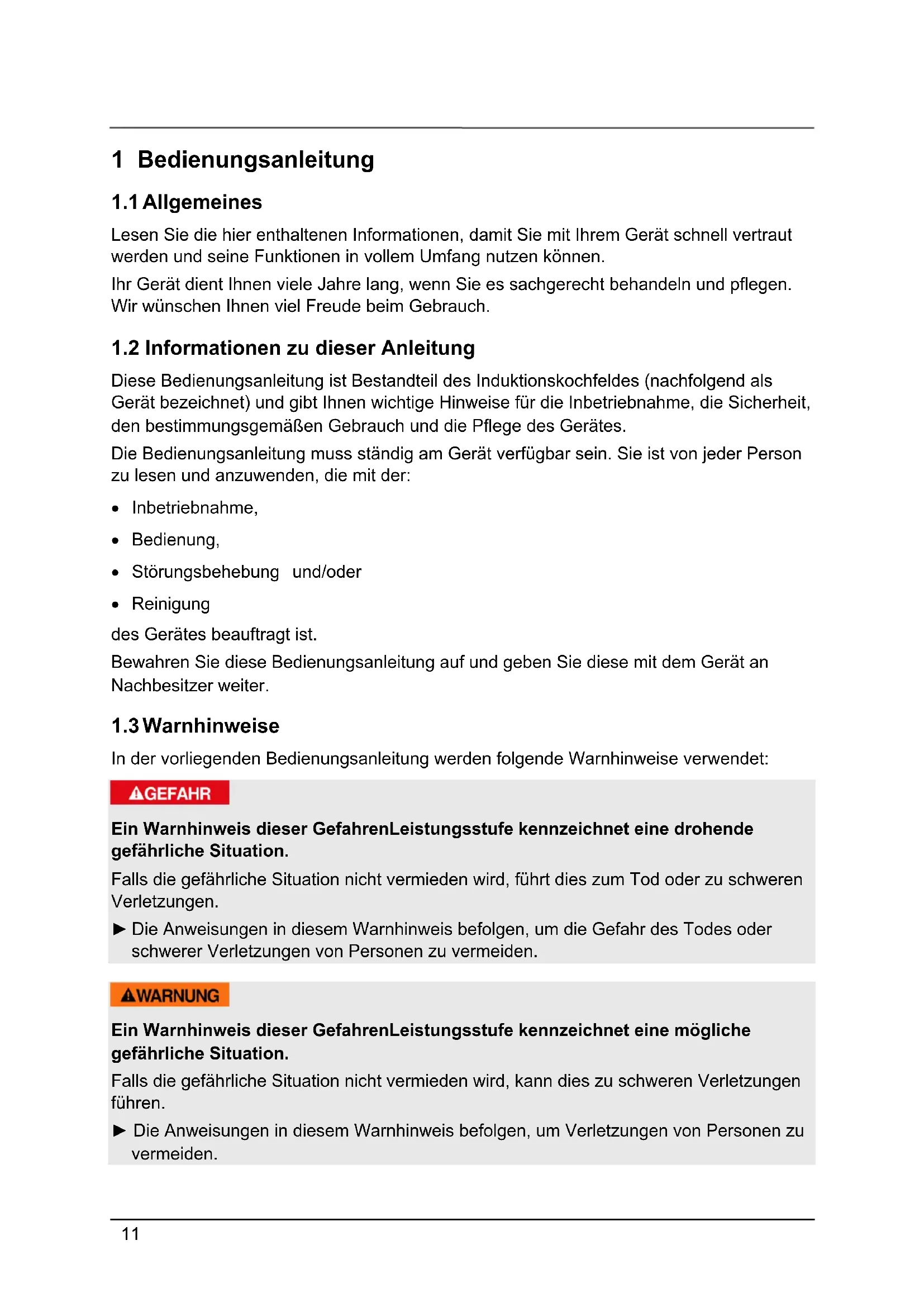 Diese Bedienungsanleitung ist Bestandteil des Induktionskochfeldes (nachfolgend als Gerät bezeichnet) und gibt Ihnen wichtige Hinweise für die Inbetriebnahme, die Sicherheit, den bestimmungsgemäßen Gebrauch und die Pflege des Gerätes. Die Bedienungsanleitung muss ständig am Gerät verfügbar sein. Sie ist von jeder Person zu lesen und anzuwenden, die mit der: Inbetriebnahme, Bedienung, Störungsbehebung und/oder Reinigung des Gerätes beauftragt ist. Bewahren Sie diese Bedienungsanleitung auf und geben Sie diese mit dem Gerät an Nachbesitzer weiter.