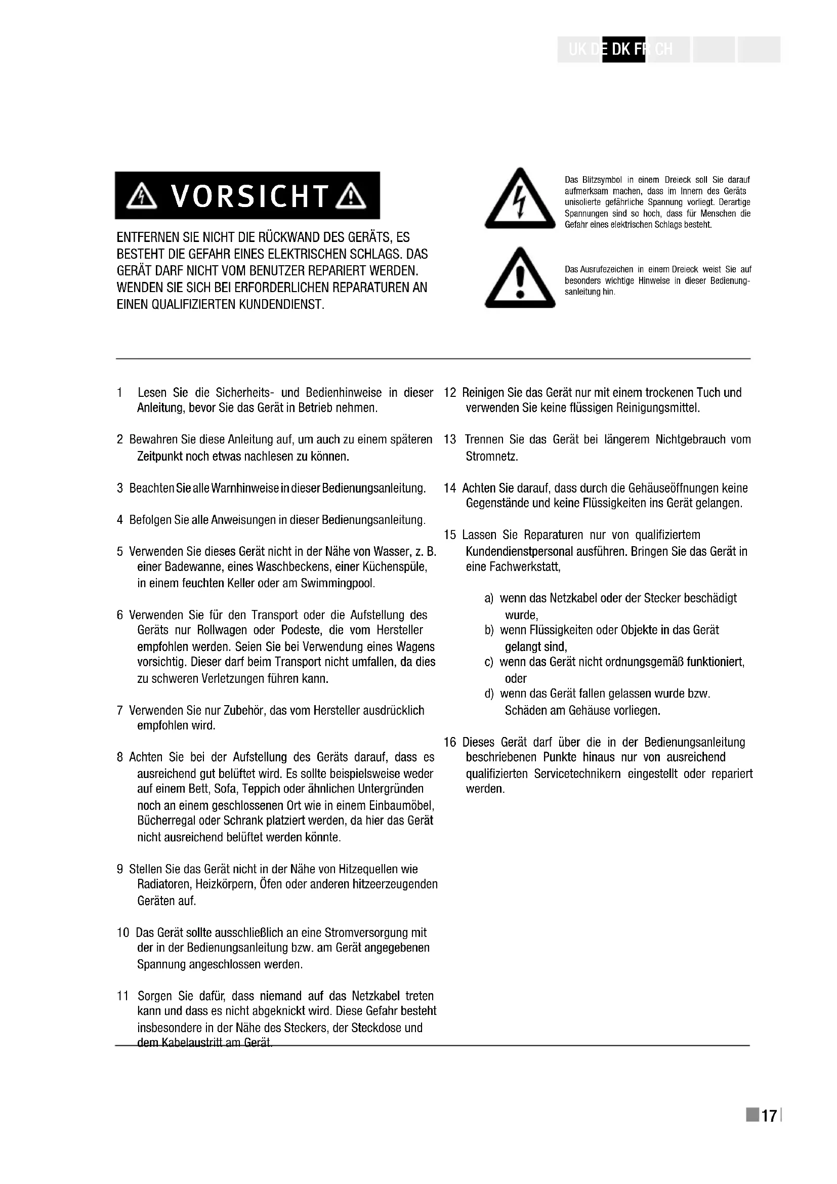 In Table 2 you will find the most common specifications for our subwoofers. Please have in mind that there are countless methods for measuring subwoofers. However, none of them tell you anything useful about how a subwoofer really sounds. Only your ears can decide whether one subwoofer sounds better than another. Like all our speakers, DALI SUB K-14 F is designed to reproduce music as honestly as possible. Enjoy your new DALI SUB K-14 F!17 UK DE DK FR CH VORSICHT ENTFERNEN SIE NICHT DIE RÜCKWAND DES GERÄTS, ES BESTEHT DIE GEFAHR EINES ELEKTRISCHEN SCHLAGS. DAS GERÄT DARF NICHT VOM BENUTZER REPARIERT WERDEN. WENDEN SIE SICH BEI ERFORDERLICHEN REPARATUREN AN EINEN QUALIFIZIERTEN KUNDENDIENST. Das Blitzsymbol in einem Dreieck soll Sie darauf aufmerksam machen, dass im Innern des Geräts unisolierte gefährliche Spannung vorliegt. Derartige Spannungen sind so hoch, dass für Menschen die Gefahr eines elektrischen Schlags besteht. Das Ausrufezeichen in einem Dreieck weist Sie auf besonders wichtige Hinweise in dieser Bedienung- sanleitung hin. 1 Lesen Sie die Sicherheits- und Bedienhinweise in dieser Anleitung, bevor Sie das Gerät in Betrieb nehmen. 2 Bewahren Sie diese Anleitung auf, um auch zu einem späteren Zeitpunkt noch etwas nachlesen zu können. 3 Beachten Sie alle Warnhinweise in dieser Bedienungsanleitung. 4 Befolgen Sie alle Anweisungen in dieser Bedienungsanleitung. 5 Verwenden Sie dieses Gerät nicht in der Nähe von Wasser, z. B. einer Badewanne, eines Waschbeckens, einer Küchenspüle, in einem feuchten Keller oder am Swimmingpool. 6 Verwenden Sie für den Transport oder die Aufstellung des Geräts nur Rollwagen oder Podeste, die vom Hersteller empfohlen werden. Seien Sie bei Verwendung eines Wagens vorsichtig. Dieser darf beim Transport nicht umfallen, da dies zu schweren Verletzungen führen kann. 7 Verwenden Sie nur Zubehör, das vom Hersteller ausdrücklich empfohlen wird. 8 Achten Sie bei der Aufstellung des Geräts darauf, dass es ausreichend gut belüftet wird. Es sollte beispielsweise weder auf einem Bett, Sofa, Teppich oder ähnlichen Untergründen noch an einem geschlossenen Ort wie in einem Einbaumöbel, Bücherregal oder Schrank platziert werden, da hier das Gerät nicht ausreichend belüftet werden könnte. 9 Stellen Sie das Gerät nicht in der Nähe von Hitzequellen wie Radiatoren, Heizkörpern, Öfen oder anderen hitzeerzeugenden Geräten auf. 10 Das Gerät sollte ausschließlich an eine Stromversorgung mit der in der Bedienungsanleitung bzw. am Gerät angegebenen Spannung angeschlossen werden. 11 Sorgen Sie dafür, dass niemand auf das Netzkabel treten kann und dass es nicht abgeknickt wird. Diese Gefahr besteht insbesondere in der Nähe des Steckers, der Steckdose und dem Kabelaustritt am Gerät. 12 Reinigen Sie das Gerät nur mit einem trockenen Tuch und verwenden Sie keine üssigen Reinigungsmittel. 13 Trennen Sie das Gerät bei längerem Nichtgebrauch vom Stromnetz. 14 Achten Sie darauf, dass durch die Gehäuseöffnungen keine Gegenstände und keine Flüssigkeiten ins Gerät gelangen. 15 Lassen Sie Reparaturen nur von qualiziertem Kundendienstpersonal ausführen. Bringen Sie das Gerät in eine Fachwerkstatt, a) wenn das Netzkabel oder der Stecker beschädigt wurde, b) wenn Flüssigkeiten oder Objekte in das Gerät gelangt sind, c) wenn das Gerät nicht ordnungsgemäß funktioniert, oder d) wenn das Gerät fallen gelassen wurde bzw. Schäden am Gehäuse vorliegen. 16 Dieses Gerät darf über die in der Bedienungsanleitung beschriebenen Punkte hinaus nur von ausreichend qualizierten Servicetechnikern eingestellt oder repariert werden.18 INHALt