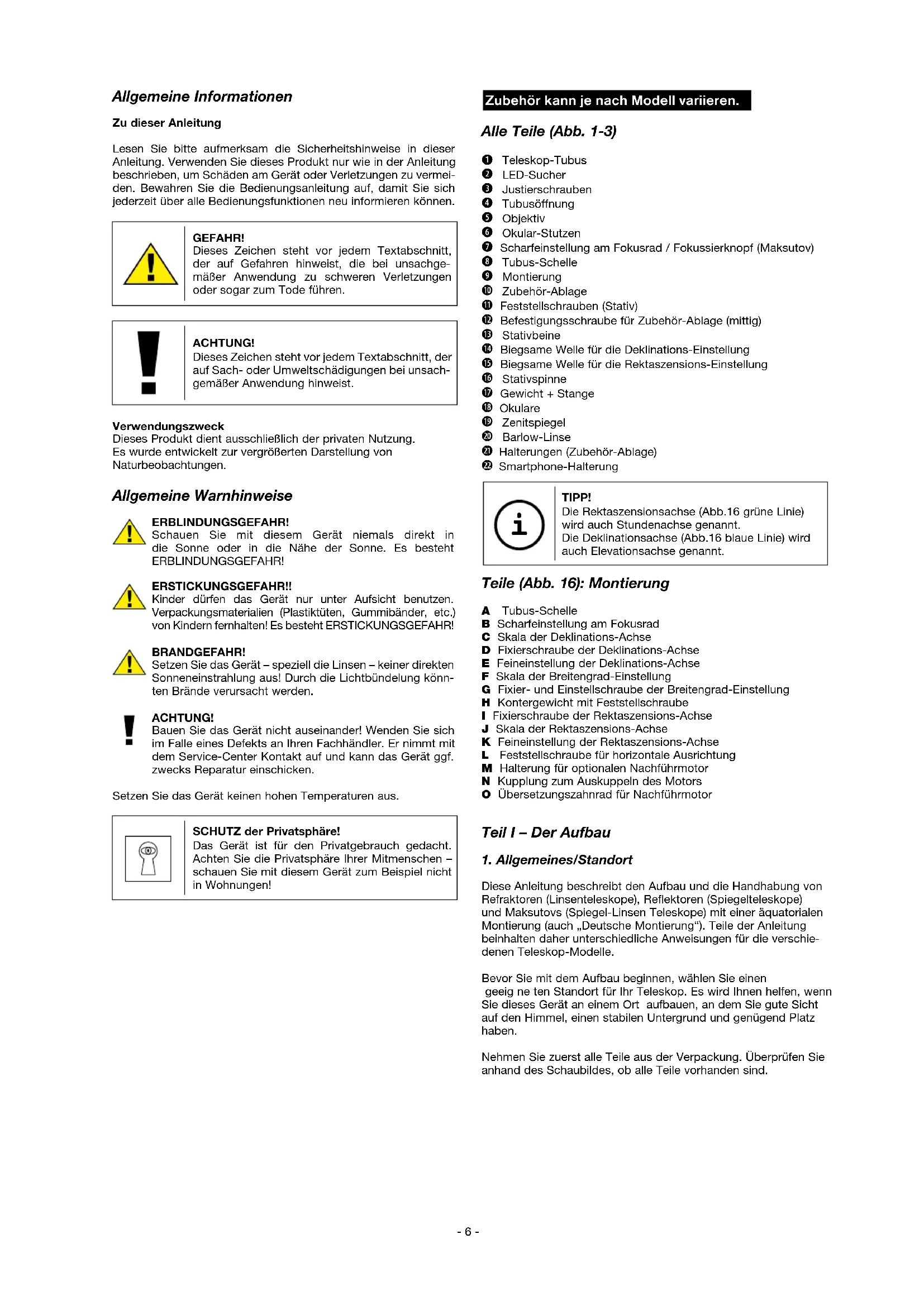 Diese Anleitung beschreibt den Aufbau und die Handhabung von Refraktoren (Linsenteleskope), Reflektoren (Spiegelteleskope) und Maksutovs (Spiegel-Linsen Teleskope) mit einer äquatorialen Montierung (auch „Deutsche Montierung“). Teile der Anleitung beinhalten daher unterschiedliche Anweisungen für die verschie- denen Teleskop-Modelle. Bevor Sie mit dem Aufbau beginnen, wählen Sie einen geeig ne ten Standort für Ihr Teleskop. Es wird Ihnen helfen, wenn Sie dieses Gerät an einem Ort aufbauen, an dem Sie gute Sicht auf den Himmel, einen stabilen Untergrund und genügend Platz haben. Nehmen Sie zuerst alle Teile aus der Verpackung. Überprüfen Sie anhand des Schaubildes, ob alle Teile vorhanden sind.- 7 -