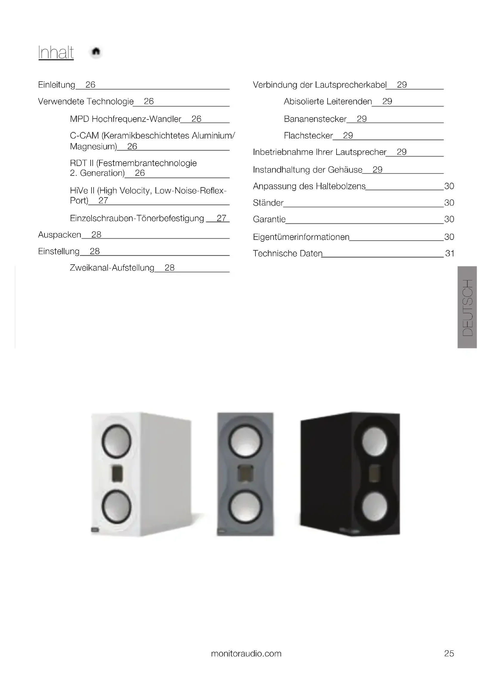 HiVe II (High Velocity, Low-Noise-Reflex- Port) 27 Einzelschrauben-Tönerbefestigung 27 Auspacken 28 Einstellung 28 Zweikanal-Aufstellung 28 Verbindung der Lautsprecherkabel 29 Abisolierte Leiterenden 29 Bananenstecker 29 Flachstecker 29 Inbetriebnahme Ihrer Lautsprecher 29 Instandhaltung der Gehäuse 29 Anpassung des Haltebolzens 30 Ständer 30 Garantie 30 Eigentümerinformationen 30 Technische Daten 31 DEUTSCH monitoraudio.com 25Einleitung Studio ist ein leistungsstarkes Lautsprechersystem für Musikliebhaber, die nach absoluter Leistung in einem kompakten, erschwinglichen Paket suchen. Das kompromisslose Design-Ethos umfasst in erster Linie eine „Trickle Down“-Tönertechnologie von der Flaggschiff-Serie Platinum II. Bei jedem Detail der Signalkette wurde das Erreichen von Neutralität berücksichtigt, was von unserem Design-Team verlangte, auf sehr kompromisslose Weise zu denken. Das gitterlose Design zum Beispiel stellt sicher, dass der Lautsprecher immer auf optimalen Level und ohne Konzession läuft. Maßgeschneiderte Standlautsprecher wurden für das bestmögliche Fundament entworfen, mit makellosem angepassten Design und Leistung. Verwendete Technologie MPD Hochfrequenz-Wandler Ein MPD (Mikro-gefaltete Membran) Hochfrequenz-Wandler wurde entworfen, um unglaubliche Artikulation aufgrund der Membran mit geringer Masse zu bieten. Die Funktionsweise des MPD-Wandlers beinhaltet ein schnelles Drücken der Falten zur Erzeugung eines glatten, weiten Resonanzübergangs in das Ultraschallband. Das Ergebnis ist ein realistischerer Klang, der das hohe harmonische Spektrum jeder Note ohne definitionstrübende Verzerrung freisetzt. C-CAM (Keramikbeschichtetes Aluminium/Magnesium) C-CAM ist ein innovatives Legierungsmaterial, das ursprünglich für die Luft- und Raumfahrtindustrie entwickelt wurde. Es verfügt über ideale Qualitäten für die Verwendung als Lautsprecherkonus, da es äußerst starr und dennoch leicht genug ist, um eine hohe Gesamteffizienz zu bieten. C-CAM wird als Aluminium- und Magnesium-Legierung geformt, die bei der Produktion spannungstrennenden Prozessen unterzogen wird, um eine Verformung der Oberfläche und molekulare Schwächen zu vermeiden. Eine Schicht aus reiner Keramik (Alumina) wird auf die Oberflächen aufgetragen, um eine vollständig starre Außenseite zu erzeugen. C-CAM-Konen sind so konzipiert, dass sie gegenüber Biegespannungen äußerst resistent sind. Wenn es zu einem Konus geformt wird, bietet das C-CAM-Material eine erhöhte Klarheit und verringert eine Verzerrung im Vergleich zu konventionellen Konusmaterialien. RDT II (Festmembrantechnologie 2. Generation) RDT II ist eine „Sandwich“-Verbundstruktur aus ultradünnen Häuten mit geringer Masse, die an einem wabenförmigen NomexR-Kernmaterial gebunden sind. Die Gesamtdicke der RDT-II-Membran beträgt lediglich 2 mm, sie ist dennoch 150 Mal stärker als ein konventioneller Lautsprecherkonus. RDT II ist eine einzigartige, innovative Entwicklung, die von den Ingenieuren von Monitor Audio für die neue Platinum-II-Serie konzipiert wurde. Sie nutzt zwei Hautmaterialien mit unterschiedlichen mechanischen Eigenschaften. Für die vordere Haut wird C-CAM verwendet, während die rückseitige Haut aus gewebter Kohlefaser besteht. Diese Kombination kann die Verzerrung über 300 Hz um über 8 dB verringern, was zu einer Verringerung der Energie harmonischer Komponenten um 60 % führt, wodurch das RDT II zur Konustechnologie mit der geringsten Verzerrung in der Geschichte von Monitor Audio wird. Die dualen 4“ RDT II Töner, die für Studio verwendet werden, wurden aus dem PL500 II entwickelt und in diesem Fall modifiziert, um Bass- und Mittelbereiche zu erzeugen. Darüber hinaus wurde die DCF (Dynamischer Kopplungsfilter) -Technologie integriert, um Hochfrequenz-Konusauflösung zu reduzieren und die Umlaufstarrheit der Schwingspule zu erhöhen. Wie bei Platinum II wurden Studio-Treiber dazu entworfen, unglaublich wenig Verzerrung zu erzeugen, und folgen den gleichen magnetischen Design- Prinzipien. Studio26HiVe II (High Velocity, Low-Noise-Reflex-Port) Monitor Audios Port-Technologie nutzt ein gerades, geriffeltes Design, um die Luftströmung zu beschleunigen und Turbulenzen zu verringern. Die HiVe-II-Technologie kann Luft viel schneller nach innen und außen befördern als ein konventioneller Port. Dies führt zu einem mächtigen Bass, verbunden mit einem überdurchschnittlichen Einschwingverhalten. Das extrem dünne Studio-Gehäuse wurde mit zwei HiVe II Ports an der Rückseite optimiert, die auf der Ober- und Unterseite des Gehäuses angebracht sind, um sicherzustellen, dass der Druck innerhalb des Gehäuses symmetrisch ausbalanciert ist. Der große Oberflächenbereich des Ports sorgt außerdem dafür, dass es keine Luftströmung und daraus folgende Luftgeräusche gibt, was bei kleinen Gehäusen ein Problem darstellen kann. Einzelschrauben-Tönerbefestigung Studio verwendet unser einzigartiges Einzelschrauben-Tönerbefestigungssystem, das an der Rückseite des Gehäuses angebracht ist. Das Festziehen mit einem speziellen Drehmoment soll eine gleichmäßige Klemmwirkung um den Töner herum erzeugen, während sichergestellt wird, dass das Antriebssystem versteift ist. Da dies effektiv eine weitere Form der Versteifung ist, wird das Gehäusesystem mit den eingebauten Tönern noch starrer. DEUTSCH monitoraudio.com 27Auspacken Bitte stellen Sie sicher, dass ausreichend Bodenfläche vorhanden ist und folgen Sie den Bildanleitungen auf dem Produktkarton. Zerschneiden Sie das Klebeband, das den Karton verschließt, und stellen Sie dabei sicher, nicht tiefer als das Klebeband zu schneiden. Klappen Sie die Falzen an der Oberseite des Kartons zurück, um das Polystyrol freizulegen, und entfernen Sie jegliches Zubehör, aber bewegen Sie das Polystyrol nicht. Zeigt die richtige Seite des Kartons nach oben und ist dieser geöffnet, drehen Sie ihn um, sodass die Polystyrol-Endklappen nun in Kontakt mit dem Boden sind. H