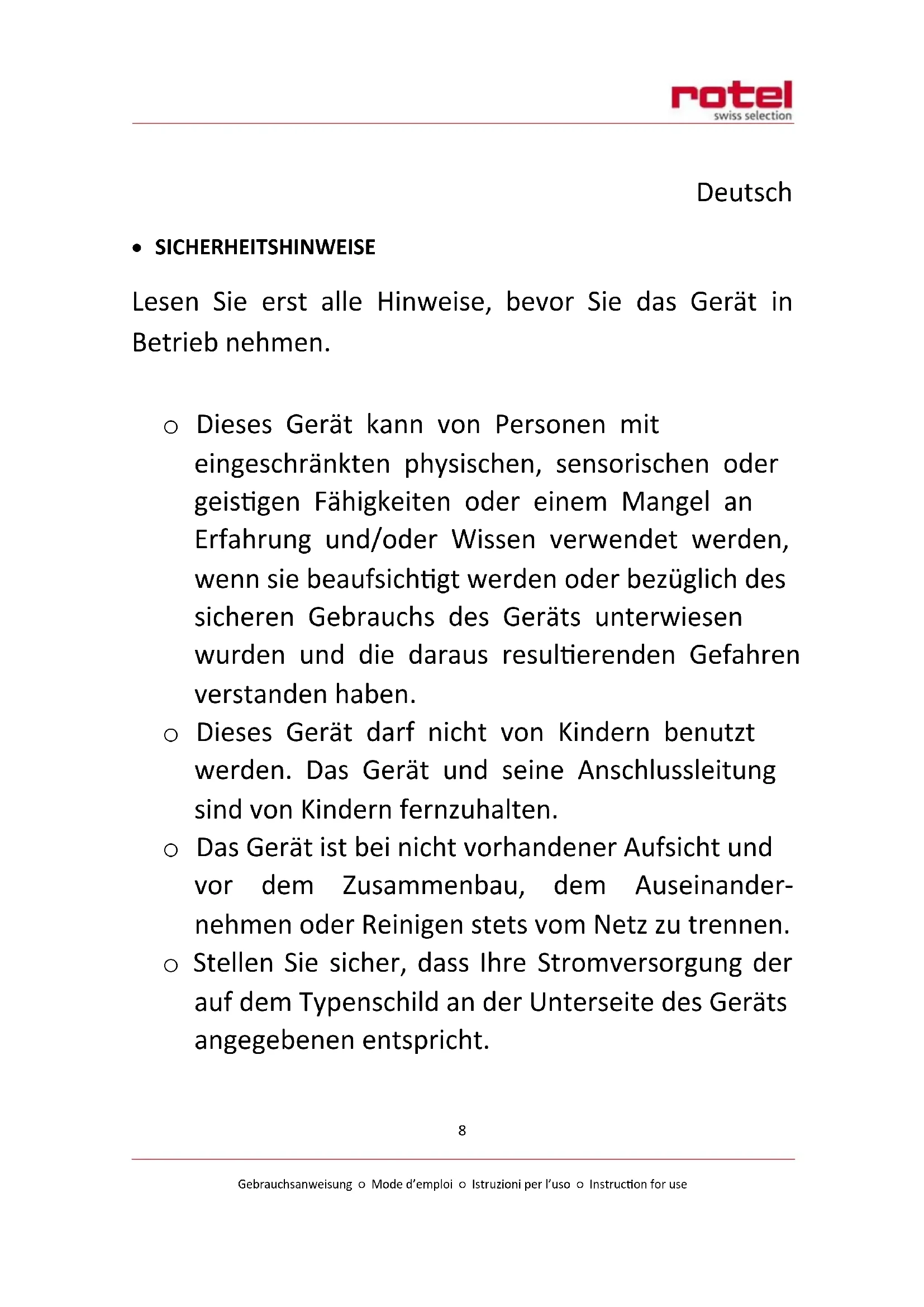 - Zur ordnungsgemässen Entsorgung geben Sie das Gerät bitte an einen Händler, den Kundendienst oder Rotel AG zurück.