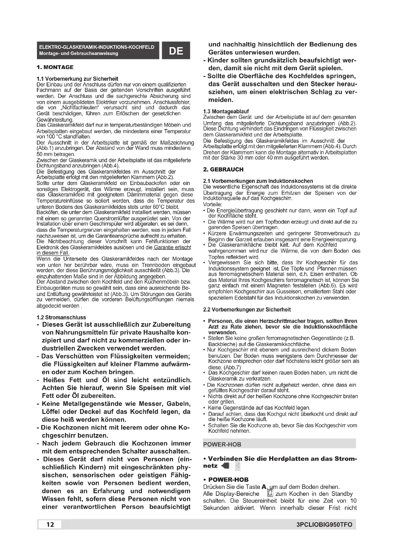 POWER-HOB Drücken Sie die Taste A, um auf dem Boden drehen. Alle Display-Bereiche zum Kochen in den Standby schalten. Die Steuereinheit bleibt für eine Zeit von 10 Sekunden aktiviert. Wenn innerhalb dieser Frist nicht ELEKTRO-GLASKERAMIK-INDUKTIONS-KOCHFELDMontage- und Gebrauchsanweisung DE13 3PCLIOBIG950TFO wählen wird jeder Bereich der Küche Heizofen schaltet sich automatisch ab.
