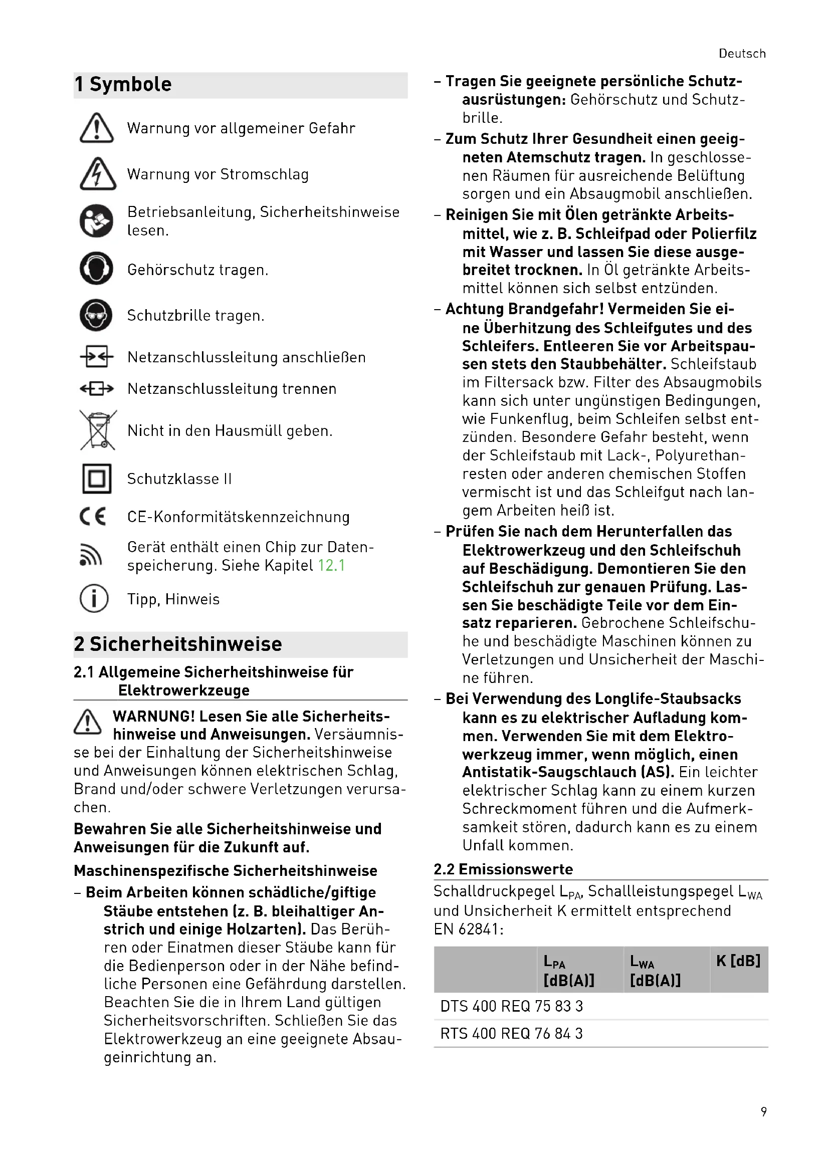 VORSICHT Emissionswerte können von den angegebe nen Werten abweichen. Dies hängt ab von der Verwendung des Werkzeugs und der Art des bearbeiteten Werkstücks. ► Beurteilen Sie die tatsächliche Belastung während des gesamten Betriebszyklus. ► Legen Sie abhängig von der tatsächlichen Belastung geeignete Sicherheitsmaßnah men fest. 3 Bestimmungsgemäße Verwendung Bestimmungsgemäß sind die Schleifer zum Schleifen von Holz, Kunststoff, Verbundwerks toffen, Farbe/Lacke, Spachtelmasse und ähnli chen Werkstoffen vorgesehen. Metall und as besthaltige Werkstoffe dürfen nicht bearbeitet werden. Wegen der elektrischen Sicherheit darf die Ma schine nicht feucht sein und nicht in feuch ter Umgebung betrieben werden. Die Maschine darf nur für Trockenschliff verwendet werden. Bei nicht bestimmungsgemäßem Ge brauch haftet der Benutzer. 4 Technische Daten Schwingschleifer DTS400 REQ RTS400 REQ Leistung 250W 250W Drehzahl (Leerlauf) 6000 - 12000min
