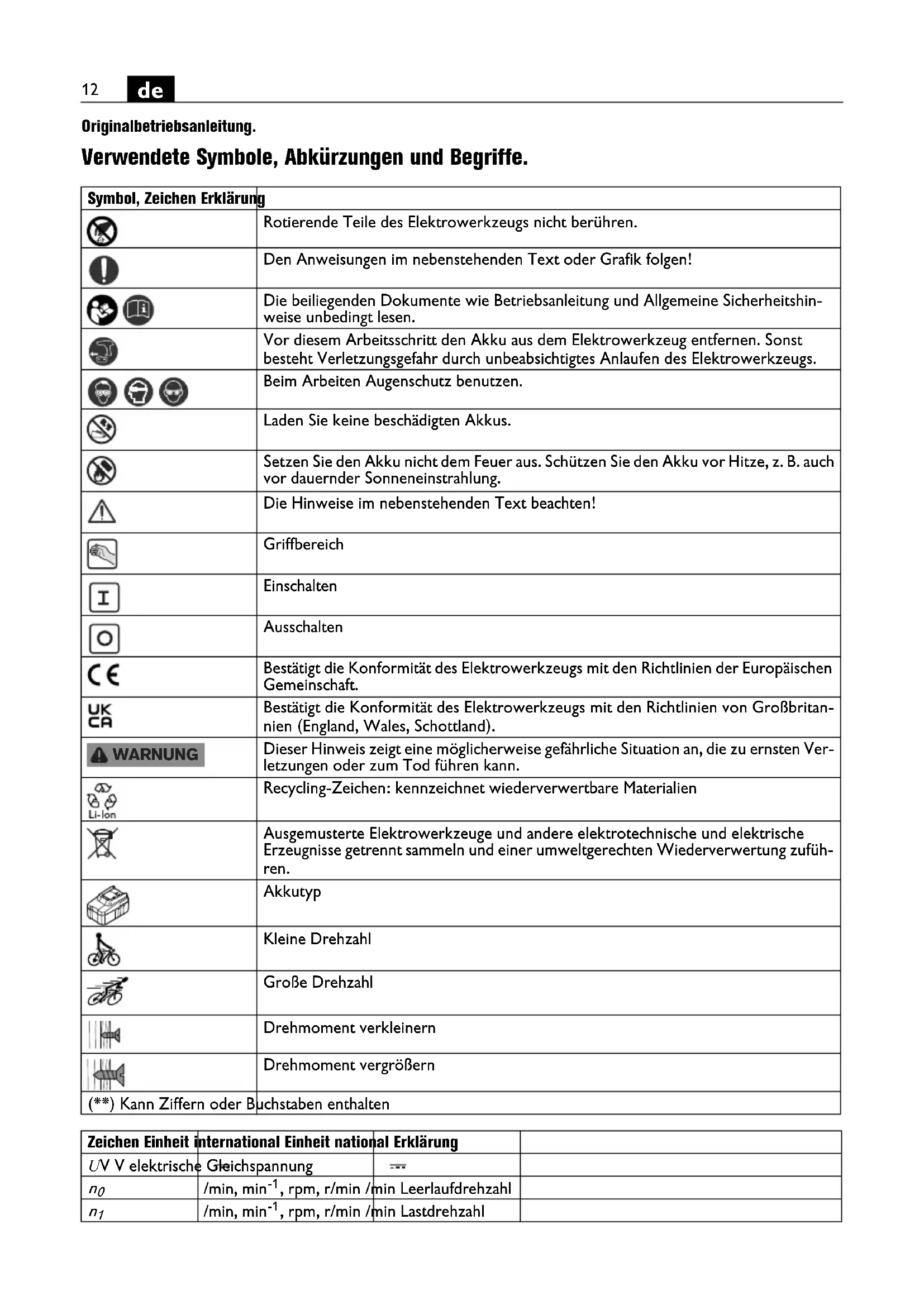| Zeichen Einheit international Einheit national Erklärung | |||
