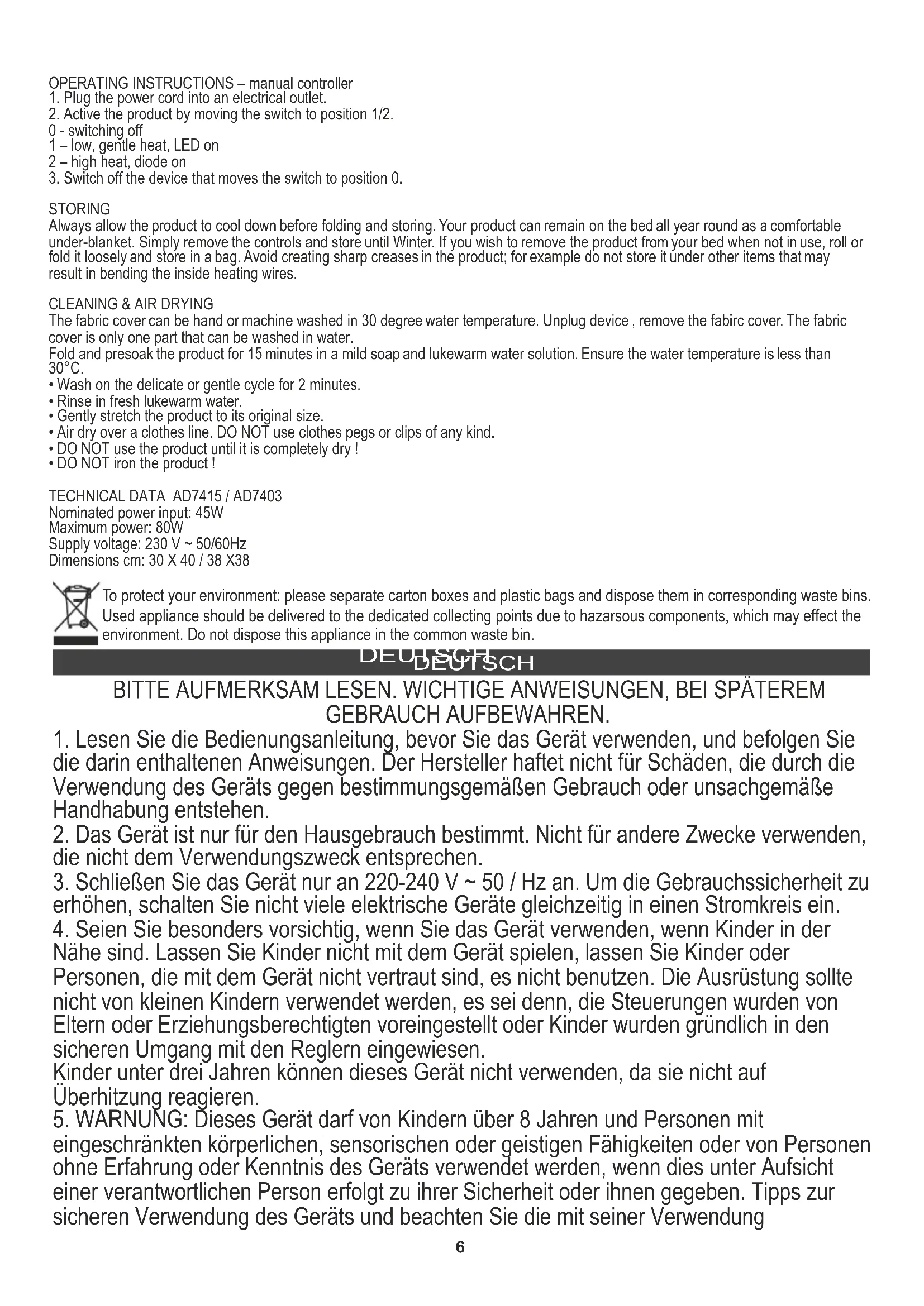 AD 7403 - Heizdecke/-kissen ADLER - Kostenlose Bedienungsanleitung