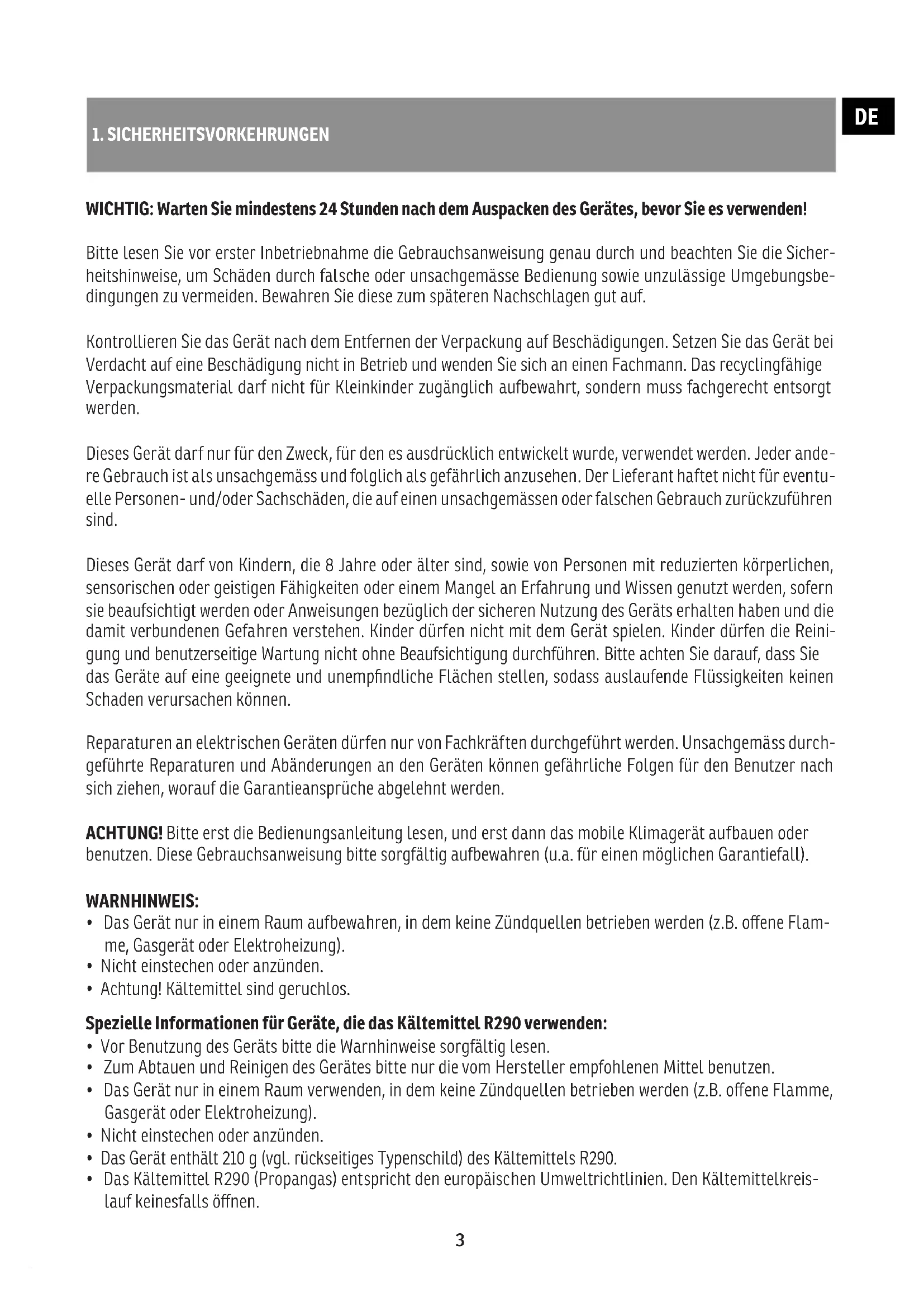 Bitte lesen Sie vor erster Inbetriebnahme die Gebrauchsanweisung genau durch und beachten Sie die Sicher- heitshinweise, um Schäden durch falsche oder unsachgemässe Bedienung sowie unzulässige Umgebungsbe- dingungen zu vermeiden. Bewahren Sie diese zum späteren Nachschlagen gut auf. Kontrollieren Sie das Gerät nach dem Entfernen der Verpackung auf Beschädigungen. Setzen Sie das Gerät bei Verdacht auf eine Beschädigung nicht in Betrieb und wenden Sie sich an einen Fachmann. Das recyclingfähige Verpackungsmaterial darf nicht für Kleinkinder zugänglich aufbewahrt, sondern muss fachgerecht entsorgt werden. Dieses Gerät darf nur für den Zweck, für den es ausdrücklich entwickelt wurde, verwendet werden. Jeder ande- re Gebrauch ist als unsachgemäss und folglich als gefährlich anzusehen. Der Lieferant haftet nicht für eventu- elle Personen- und/oder Sachschäden, die auf einen unsachgemässen oder falschen Gebrauch zurückzuführen sind. Dieses Gerät darf von Kindern, die 8 Jahre oder älter sind, sowie von Personen mit reduzierten körperlichen, sensorischen oder geistigen Fähigkeiten oder einem Mangel an Erfahrung und Wissen genutzt werden, sofern sie beaufsichtigt werden oder Anweisungen bezüglich der sicheren Nutzung des Geräts erhalten haben und die damit verbundenen Gefahren verstehen. Kinder dürfen nicht mit dem Gerät spielen. Kinder dürfen die Reini- gung und benutzerseitige Wartung nicht ohne Beaufsichtigung durchführen. Bitte achten Sie darauf, dass Sie das Geräte auf eine geeignete und unempfindliche Flächen stellen, sodass auslaufende Flüssigkeiten keinen Schaden verursachen können. Reparaturen an elektrischen Geräten dürfen nur von Fachkräften durchgeführt werden. Unsachgemäss durch- geführte Reparaturen und Abänderungen an den Geräten können gefährliche Folgen für den Benutzer nach sich ziehen, worauf die Garantieansprüche abgelehnt werden. ACHTUNG! Bitte erst die Bedienungsanleitung lesen, und erst dann das mobile Klimagerät aufbauen oder benutzen. Diese Gebrauchsanweisung bitte sorgfältig aufbewahren (u.a. für einen möglichen Garantiefall). WARNHINWEIS: