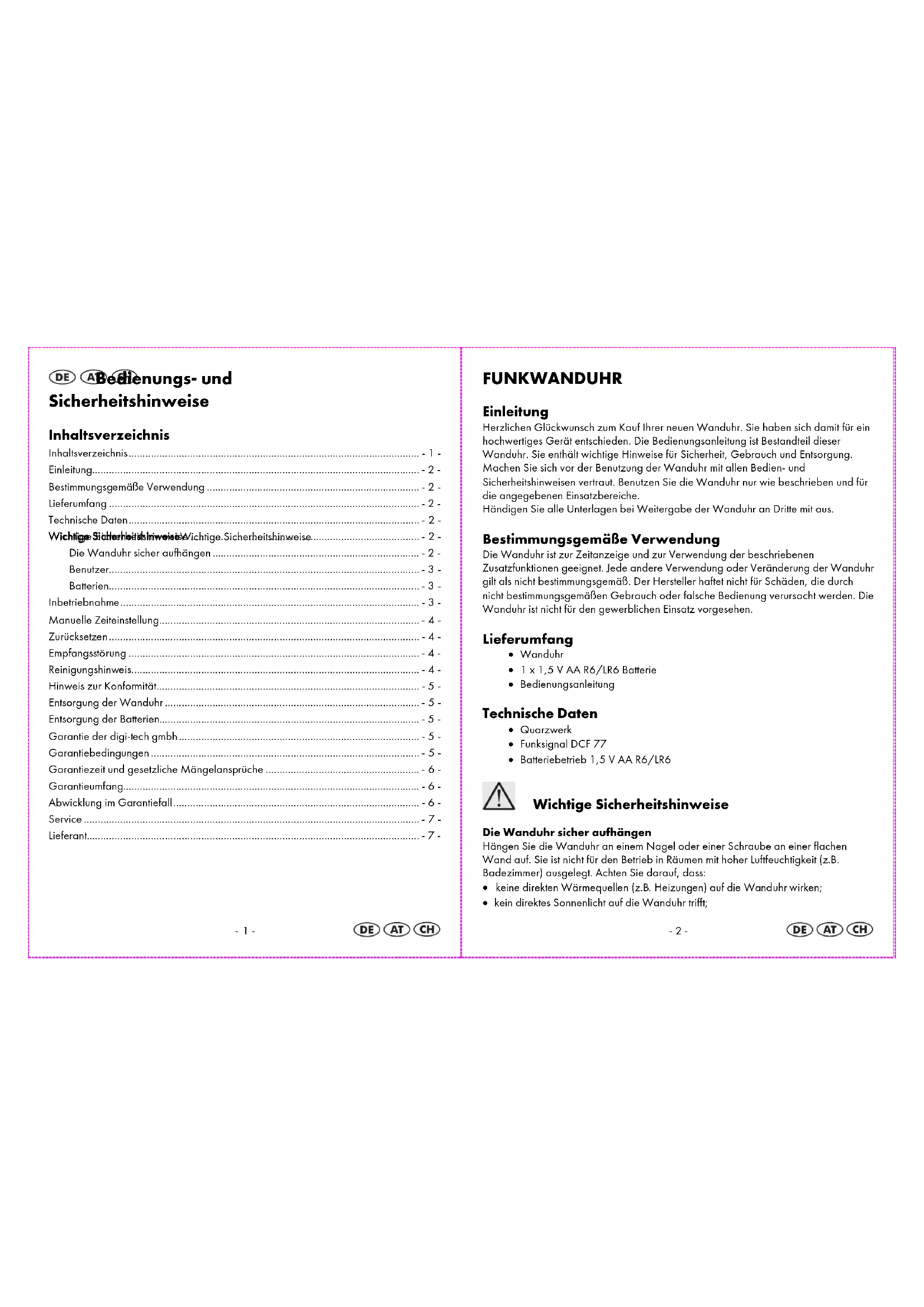 Hinweis zur Konformität Dieses Gerät entspricht bei bestimmungsgemäßer Verwendung den grundlegenden Anforderungen des § 3 und den übrigen einschlägigen Bestimmungen des FTEG (Artikel 3 der R&TTE). Die Konformitätserklärung können Sie hier anfordern: conformity@digi-tech-gmbh.com Entsorgung der Wanduhr Diese Wanduhr darf nicht im normalen Hausmüll entsorgt werden. Entsorgen Sie die Wanduhr über einen zugelassenen Entsorgungsbetrieb oder über Ihre kommunale Entsorgungseinrichtung. Beachten Sie die aktuell geltenden Vorschriften. Setzen Sie sich im Zweifelsfall mit Ihrer Entsorgungseinrichtung in Verbindung. Entsorgung der Batterien Bitte entsorgen Sie Ihre Batterien sachgerecht in extra hierfür aufgestellten Gefäßen im Handel. Batterien gehören nicht in den Hausmüll. Entsorgen Sie Batterien bitte über einen zugelassenen Entsorgungsbetrieb oder über Ihre kommunale Entsorgungseinrichtung. Beachten Sie die aktuell geltenden Vorschriften. Setzen Sie sich im Zweifelsfall mit Ihrer Entsorgungseinrichtung in Verbindung. Garantie der digi-tech gmbh Sie erhalten auf diese Wanduhr 3 Jahre Garantie ab Kaufdatum. Im Falle von Mängeln dieser Wanduhr stehen Ihnen gegen den Verkäufer des Produkts gesetzliche Rechte zu. Diese gesetzlichen Rechte werden durch unsere im Folgenden dargestellte Garantie nicht eingeschränkt. Garantiebedingungen Die Garantiefrist beginnt mit dem Kaufdatum. Bitte bewahren Sie den Kassenbon gut auf. Diese Unterlage wird als Nachweis für den Kauf benötigt. Tritt innerhalb von drei Jahren ab dem Kaufdatum dieser Wanduhr ein Material- oder Fabrikationsfehler auf, wird die Wanduhr von uns – nach unserer Wahl – für Sie kostenlos repariert oder ersetzt. Diese Garantieleistung setzt voraus, dass innerhalb der Drei-Jahres-Frist die defekte Wanduhr und der Kaufbeleg (Kassenbon) vorgelegt und schriftlich kurz beschrieben wird, worin der Mangel besteht und wann er aufgetreten ist. Wenn der Defekt von unserer Garantie gedeckt ist, erhalten Sie die reparierte oder eine neue Wanduhr zurück. Mit Reparatur oder Austausch des Produkts beginnt kein neuer Garantiezeitraum.