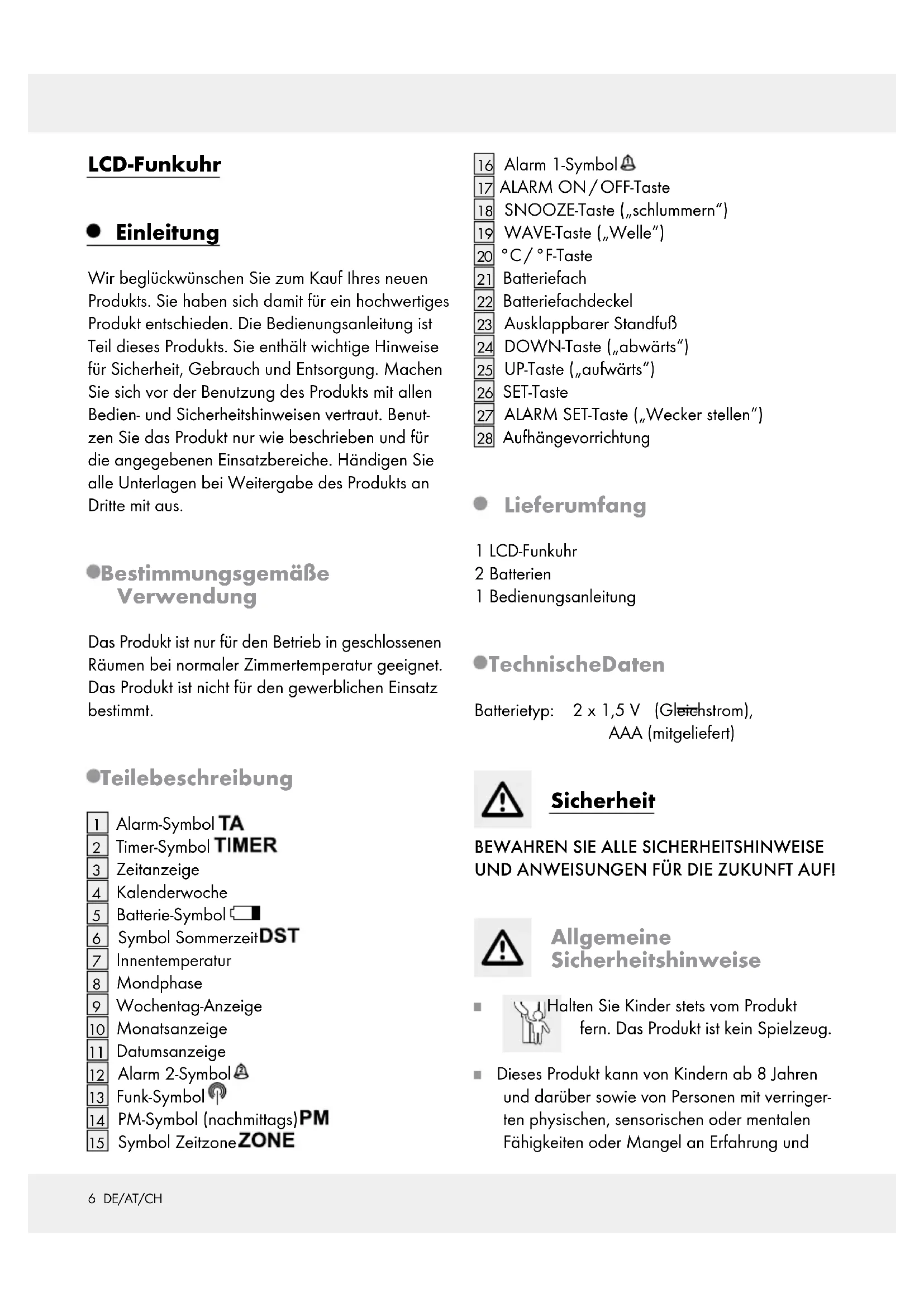 Aufhängevorrichtung Lieferumfang 1 LCD-Funkuhr 2 Batterien 1 Bedienungsanleitung Technische Daten Batterietyp: 2 x 1,5 V (Gleichstrom), AAA (mitgeliefert) Sicherheit