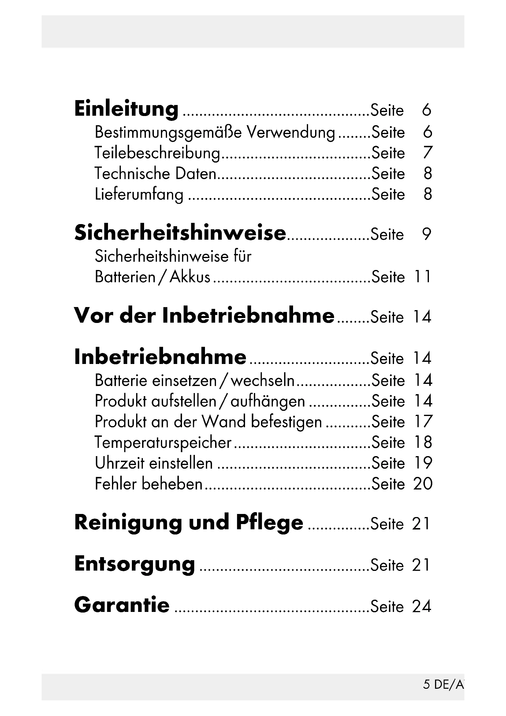 115 DE/AT/CH Einleitung .............................................Seite 6 Bestimmungsgemäße Verwendung ........Seite 6 Teilebeschreibung ....................................Seite 7 Technische Daten.....................................Seite 8 Lieferumfang ............................................Seite 8 Sicherheitshinweise....................Seite 9 Sicherheitshinweise für Batterien / Akkus ......................................Seite 11 Vor der Inbetriebnahme ........Seite 14 Inbetriebnahme .............................Seite 14 Batterie einsetzen / wechseln ..................Seite 14 Produkt aufstellen / aufhängen ...............Seite 14 Produkt an der Wand befestigen ...........Seite 17 Temperaturspeicher .................................Seite 18 Uhrzeit einstellen .....................................Seite 19 Fehler beheben ........................................Seite 20 Reinigung und Pflege ...............Seite 21 Entsorgung .........................................Seite 21 Garantie ...............................................Seite 246 DE/AT/CH Innen- / Außenthermometer