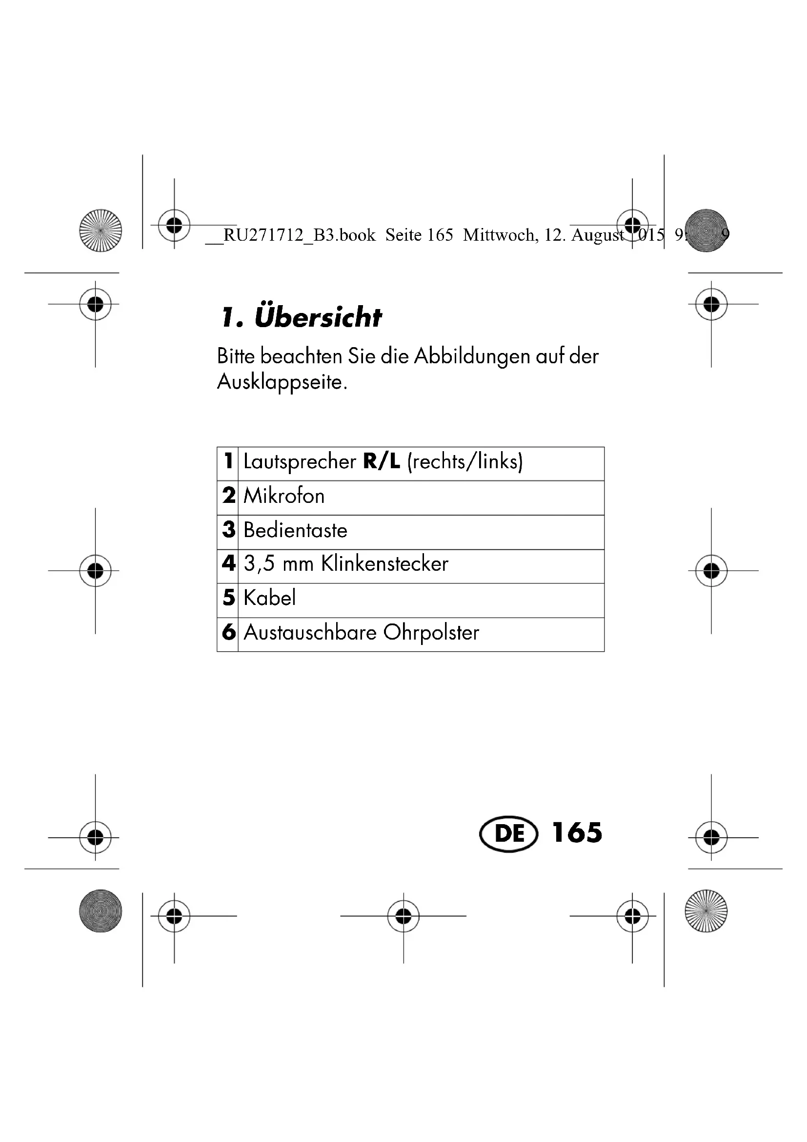 Bitte beachten Sie die Abbildungen auf der Ausklappseite. 1 Lautsprecher R/L (rechts/links) 2 Mikrofon 3 Bedientaste 4 3,5 mm Klinkenstecker 5 Kabel 6 Austauschbare Ohrpolster