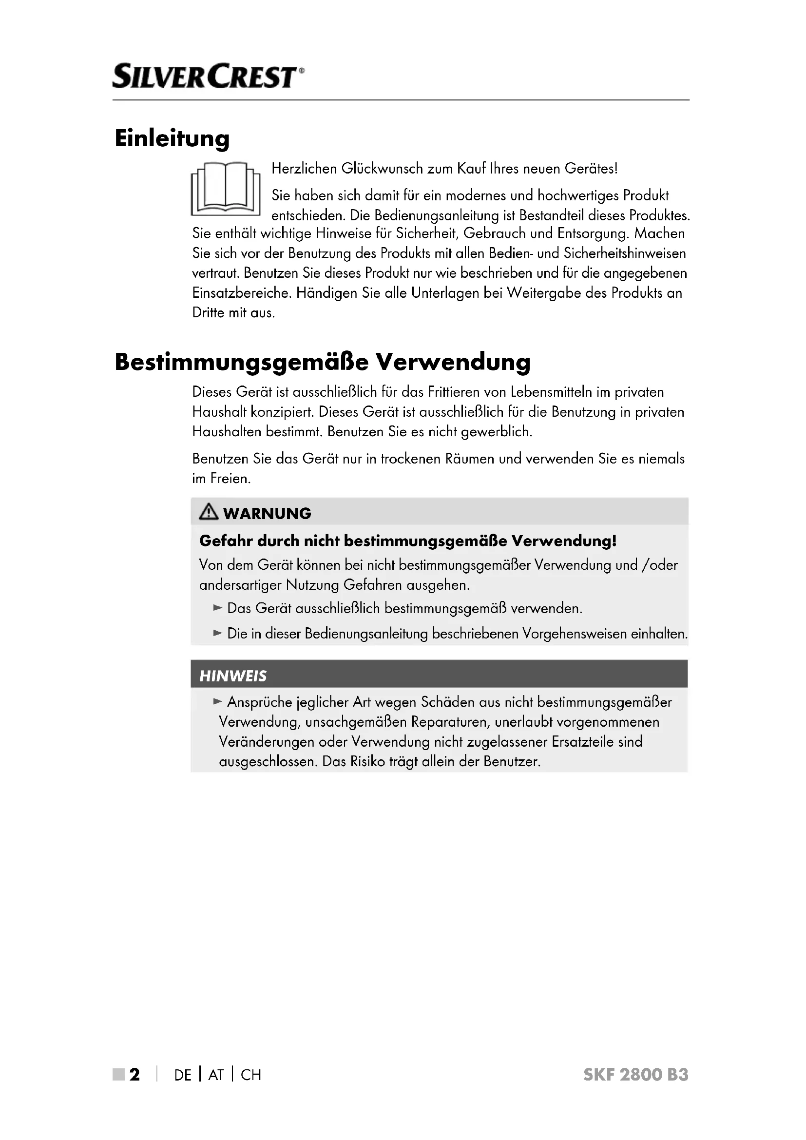 SKF 2800 B3 Einleitung Herzlichen Glückwunsch zum Kauf Ihres neuen Gerätes! Sie haben sich damit für ein modernes und hochwertiges Produkt entschieden. Die Bedienungsanleitung ist Bestandteil dieses Produktes. Sie enthält wichtige Hinweise für Sicherheit, Gebrauch und Entsorgung. Machen Sie sich vor der Benutzung des Produkts mit allen Bedien- und Sicherheitshinweisen vertraut. Benutzen Sie dieses Produkt nur wie beschrieben und für die angegebenen Einsatzbereiche. Händigen Sie alle Unterlagen bei Weitergabe des Produkts an Dritte mit aus. Bestimmungsgemäße Verwendung Dieses Gerät ist ausschließlich für das Frittieren von Lebensmitteln im privaten Haushalt konzipiert. Dieses Gerät ist ausschließlich für die Benutzung in privaten Haushalten bestimmt. Benutzen Sie es nicht gewerblich. Benutzen Sie das Gerät nur in trockenen Räumen und verwenden Sie es niemals im Freien. WARNUNG Gefahr durch nicht bestimmungsgemäße Verwendung! Von dem Gerät können bei nicht bestimmungsgemäßer Verwendung und /oder andersartiger Nutzung Gefahren ausgehen. ► Das Gerät ausschließlich bestimmungsgemäß verwenden. ► Die in dieser Bedienungsanleitung beschriebenen Vorgehensweisen einhalten. HINWEIS ► Ansprüche jeglicher Art wegen Schäden aus nicht bestimmungsgemäßer Verwendung, unsachgemäßen Reparaturen, unerlaubt vorgenommenen Veränderungen oder Verwendung nicht zugelassener Ersatzteile sind ausgeschlossen. Das Risiko trägt allein der Benutzer.DE