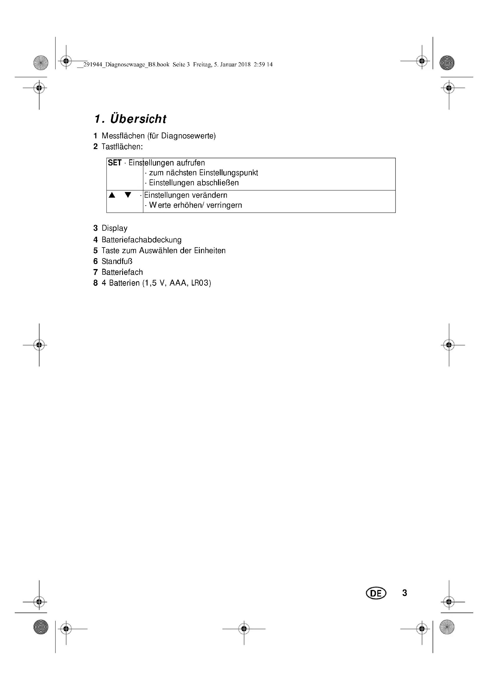 1 Messflächen (für Diagnosewerte) 2 Tastflächen: 3 Display 4 Batteriefachabdeckung 5 Taste zum Auswählen der Einheiten 6 Standfuß 7 Batteriefach 8 4|Batterien (1,5 V, AAA, LR03) SET - Einstellungen aufrufen - zum nächsten Einstellungspunkt - Einstellungen abschließen S T - Einstellungen verändern - Werte erhöhen/verringern