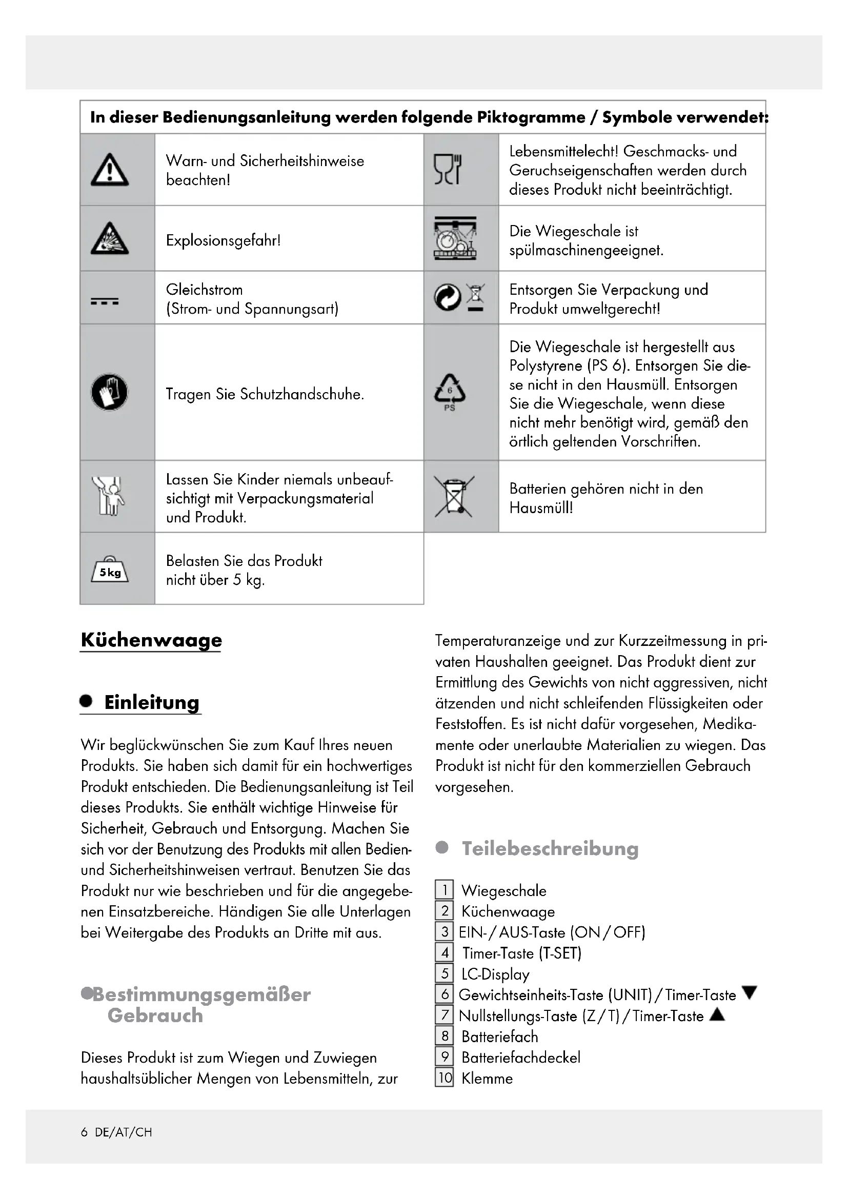 105 DE/AT/CH Einleitung ........................................................................................................................................Seite 6 Bestimmungsgemäßer Gebrauch ......................................................................................................Seite 6 Teilebeschreibung ...............................................................................................................................Seite 6 Technische Daten ................................................................................................................................Seite 7 Lieferumfang .......................................................................................................................................Seite 7 Sicherheitshinweise ............................................................................................................... Seite 7 Allgemeine Sicherheitshinweise ........................................................................................................Seite 7 Sicherheitshinweise zu Batterien .......................................................................................................Seite 8 Inbetriebnahme ........................................................................................................................Seite 9 Batterie austauschen ..........................................................................................................................Seite 9 Wiegen ................................................................................................................................................Seite 10 Wiegen und hinzufügen ....................................................................................................................Seite 10 Wiegegut teilweise entfernen ............................................................................................................Seite 10 Count-Down-Timer / Alarm einstellen ................................................................................................S eite 11 Umgebungs-Temperatur anzeigen ....................................................................................................Se i te 11 Küchenwaage ausschalten ................................................................................................................ Se it e 11 Fehler beheben .......................................................................................................................... Se it e 11 Reinigung, Pflege, Aufbewahrung ..........................................................................Seite 12 Entsorgung.....................................................................................................................................Seite 12 Garantie ...........................................................................................................................................Seite 126 DE/AT/CH In dieser Bedienungsanleitung werden folgende Piktogramme / Symbole verwendet: Warn- und Sicherheitshinweise beachten! Lebensmittelecht! Geschmacks- und Geruchseigenschaften werden durch dieses Produkt nicht beeinträchtigt. Explosionsgefahr! Die Wiegeschale ist spülmaschinengeeignet. Gleichstrom (Strom- und Spannungsart) Entsorgen Sie Verpackung und Produkt umweltgerecht! Tragen Sie Schutzhandschuhe. Die Wiegeschale ist hergestellt aus Polystyrene (PS 6). Entsorgen Sie die- se nicht in den Hausmüll. Entsorgen Sie die Wiegeschale, wenn diese nicht mehr benötigt wird, gemäß den örtlich geltenden Vorschriften. Lassen Sie Kinder niemals unbeauf- sichtigt mit Verpackungsmaterial und Produkt. Batterien gehören nicht in den Hausmüll! 5 kg Belasten Sie das Produkt nicht über 5 kg. Küchenwaage Einleitung Wir beglückwünschen Sie zum Kauf Ihres neuen Produkts. Sie haben sich damit für ein hochwertiges Produkt entschieden. Die Bedienungsanleitung ist Teil dieses Produkts. Sie enthält wichtige Hinweise für Sicherheit, Gebrauch und Entsorgung. Machen Sie sich vor der Benutzung des Produkts mit allen Bedien- und Sicherheitshinweisen vertraut. Benutzen Sie das Produkt nur wie beschrieben und für die angegebe- nen Einsatzbereiche. Händigen Sie alle Unterlagen bei Weitergabe des Produkts an Dritte mit aus.