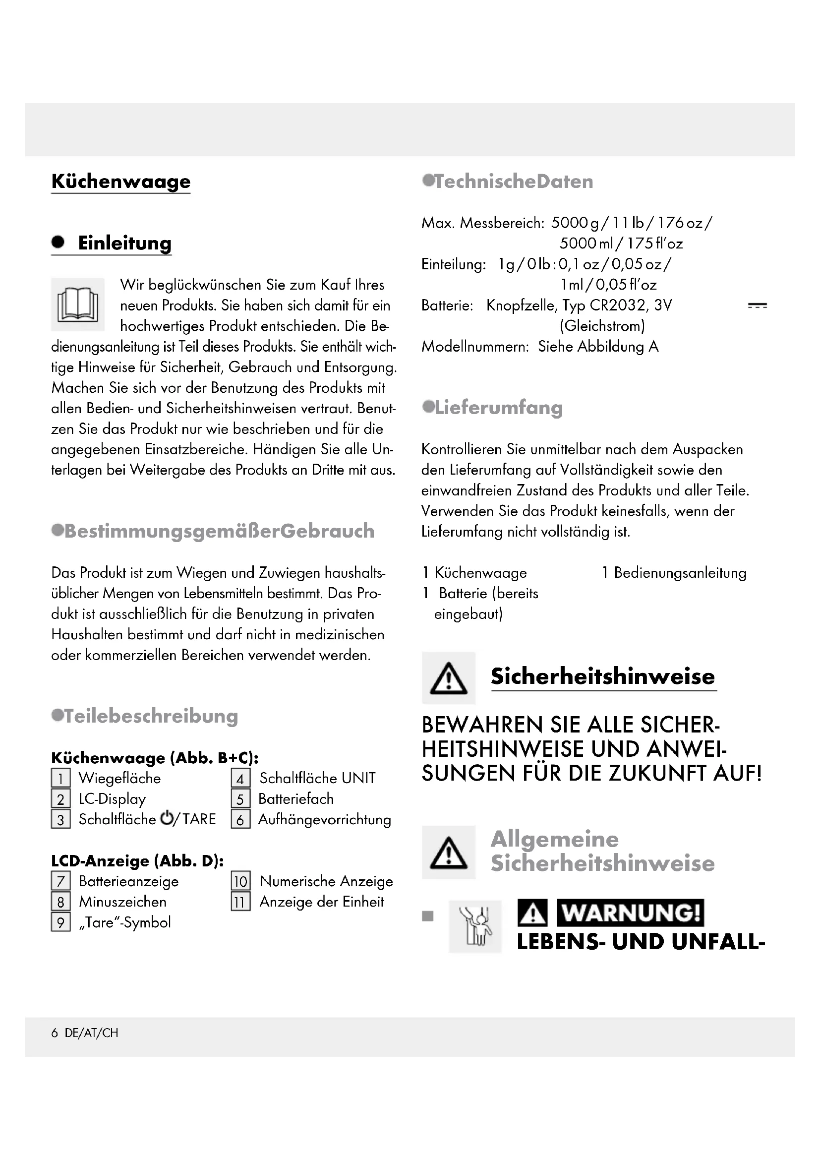 HG01939A HG01939B HG01939C HG01939D HG01939E HG01939F5 DE/AT/CH Einleitung ................................................................................................................................................... Seite 6 Bestimmungsgemäßer Gebrauch ................................................................................................................. Seite 6 Teilebeschreibung ......................................................................................................................................... Seite 6 Technische Daten .......................................................................................................................................... Seite 6 Lieferumfang .................................................................................................................................................. Seite 6 Sicherheitshinweise .......................................................................................................................... Seite 6 Allgemeine Sicherheitshinweise ................................................................................................................... Seite 6 Sicherheitshinweise für Batterien / Akkus ..................................................................................................... Seite 8 Inbetriebnahme ................................................................................................................................... Seite 9 Batterie wechseln .......................................................................................................................................... Seite 9 Bedienung ................................................................................................................................................ Seite 9 Wiegen .......................................................................................................................................................... Seite 9 Zuwiegen ....................................................................................................................................................... Seite 9 Maßeinheit ändern ....................................................................................................................................... Seite 10 Ausschalten.................................................................................................................................................... Seite 10 Fehler beheben .................................................................................................................................... Seite 10 Reinigung und Pflege ...................................................................................................................... Seite 11 Entsorgung ............................................................................................................................................... Seite 11 Garantie ..................................................................................................................................................... Seite 116 DE/AT/CH Küchenwaage Einleitung Wir beglückwünschen Sie zum Kauf Ihres neuen Produkts. Sie haben sich damit für ein hochwertiges Produkt entschieden. Die Be- dienungsanleitung ist Teil dieses Produkts. Sie enthält wich- tige Hinweise für Sicherheit, Gebrauch und Entsorgung. Machen Sie sich vor der Benutzung des Produkts mit allen Bedien- und Sicherheitshinweisen vertraut. Benut- zen Sie das Produkt nur wie beschrieben und für die angegebenen Einsatzbereiche. Händigen Sie alle Un- terlagen bei Weitergabe des Produkts an Dritte mit aus. Bestimmungsgemäßer Gebrauch Das Produkt ist zum Wiegen und Zuwiegen haushalts- üblicher Mengen von Lebensmitteln bestimmt. Das Pro- dukt ist ausschließlich für die Benutzung in privaten Haushalten bestimmt und darf nicht in medizinischen oder kommerziellen Bereichen verwendet werden. Teilebeschreibung Küchenwaage (Abb. B+C):