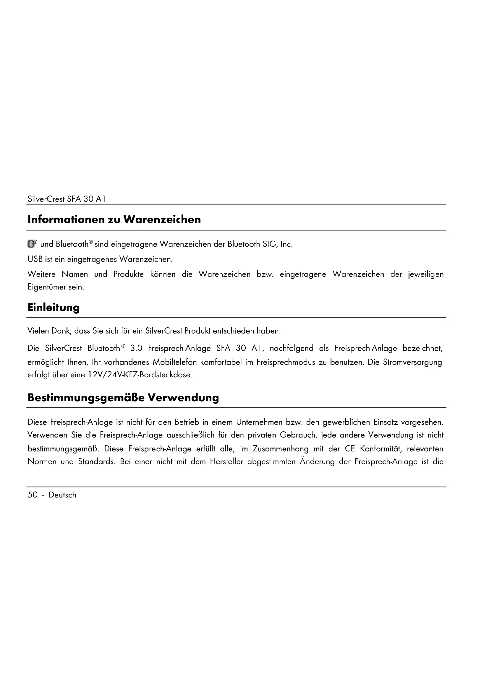 ermöglicht Ihnen, Ihr vorhandenes Mobiltelefon komfortabel im Freisprechmodus zu benutzen. Die Stromversorgung erfolgt über eine 12V/24V-KFZ-Bordsteckdose. Bestimmungsgemäße Verwendung Diese Freisprech-Anlage ist nicht für den Betrieb in einem Unternehmen bzw. den gewerblichen Einsatz vorgesehen. Verwenden Sie die Freisprech-Anlage ausschließlich für den privaten Gebrauch, jede andere Verwendung ist nicht bestimmungsgemäß. Diese Freisprech-Anlage erfüllt alle, im Zusammenhang mit der CE Konformität, relevanten Normen und Standards. Bei einer nicht mit dem Hersteller abgestimmten Änderung der Freisprech-Anlage ist dieSilverCrest SFA 30 A1 Deutsch - 51 Einhaltung dieser Normen nicht mehr gewährleistet. Aus hieraus resultierenden Schäden oder Störungen ist jegliche Haftung seitens des Herstellers ausgeschlossen. Bitte beachten Sie die Landesvorschriften bzw. Gesetze des Einsatzlandes. Lieferumfang