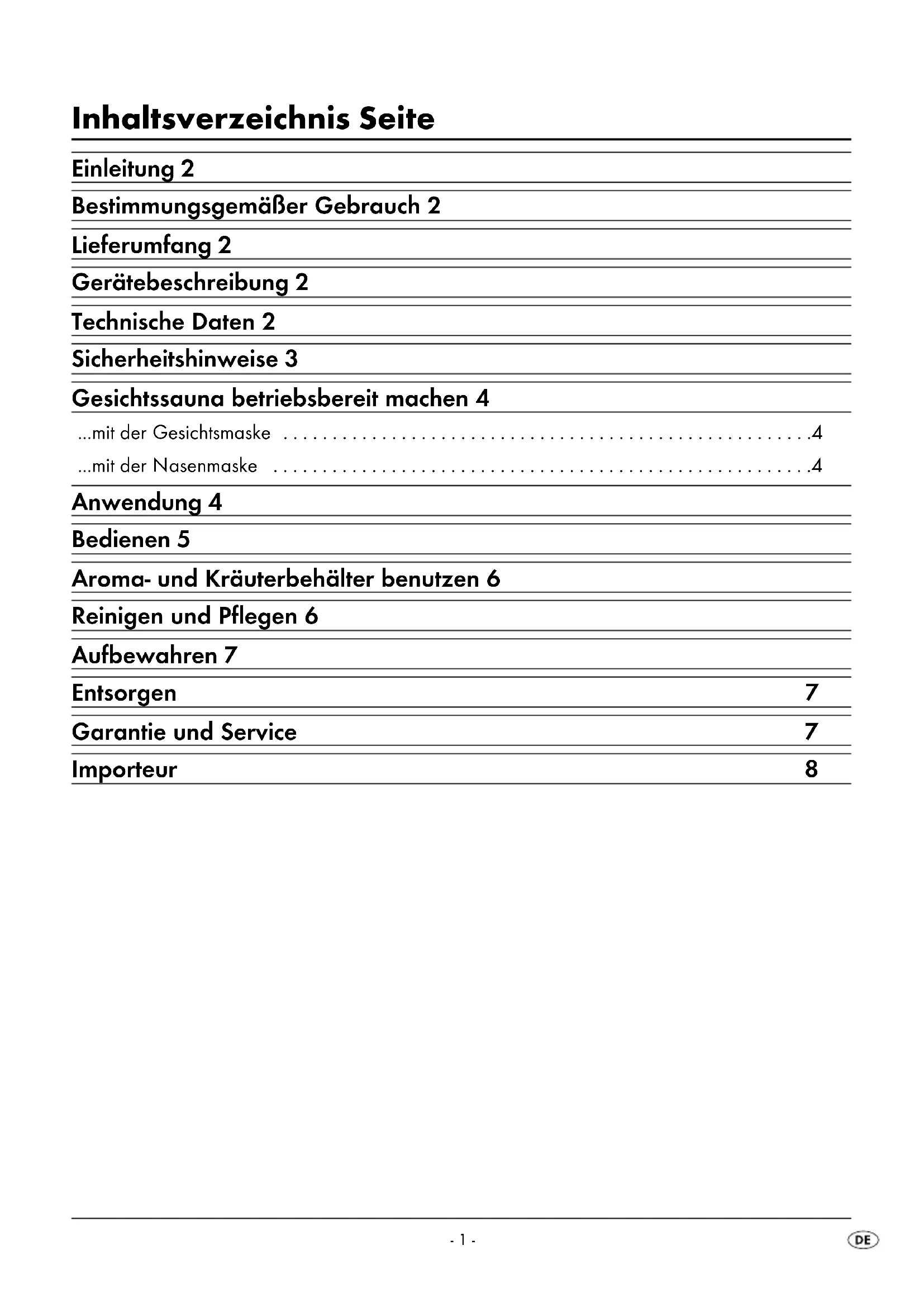 - GESICHTSSAUNA Bedienungsanleitung SAUNA FACCIALE Istruzioni per l’uso SAUNA FACIAL Mode d’emploi FACIAL SAUNA Operating instructionsDE / AT / CH Bedienungsanleitung Seite 1 FR / CH Mode d’emploi Page 9 IT / CH Istruzioni per l’uso Pagina 17 GB Operating instructions Page 25 Klappen Sie vor dem Lesen die Seite mit den Abbildungen aus und machen Sie sich anschließend mit allen Funktionen des Gerätes vertraut. Avant de lire le mode d‘emploi, ouvrez la page contenant les illustrations et familiarisez-vous ensuite avec toutes les fonctions de l‘appareil. Prima di leggere aprire la pagina con le immagini e prendere confi denza con le diverse funzioni dell’apparecchio. Before reading, unfold the page containing the illustrations and familiarise yourself with all functions of the device.B A- 1 - Inhaltsverzeichnis Seite Einleitung 2 Bestimmungsgemäßer Gebrauch 2 Lieferumfang 2 Gerätebeschreibung 2 Technische Daten 2 Sicherheitshinweise 3 Gesichtssauna betriebsbereit machen 4