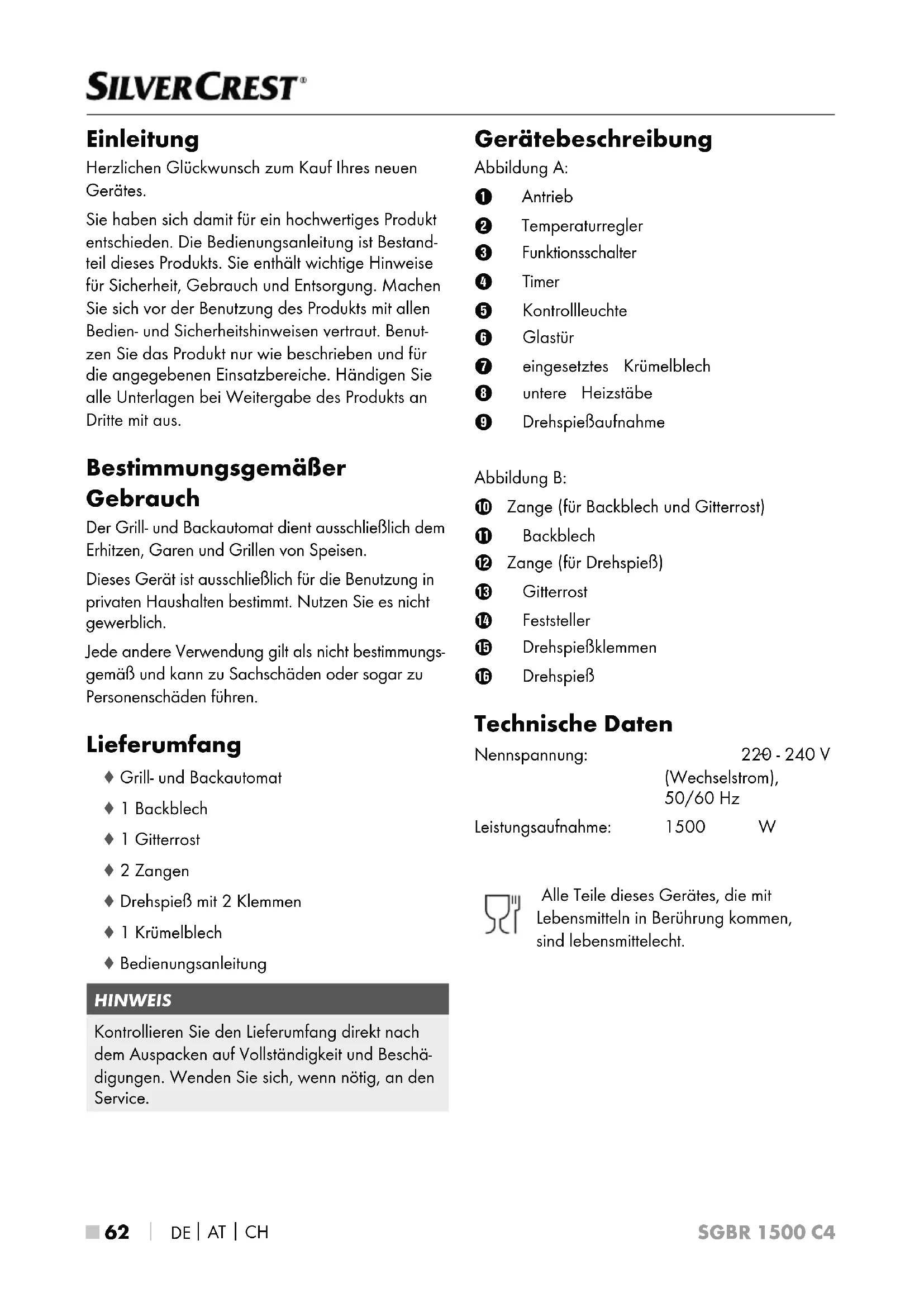 BEDIENUNGSANLEITUNG SGBR 1500 B4 SILVERCREST