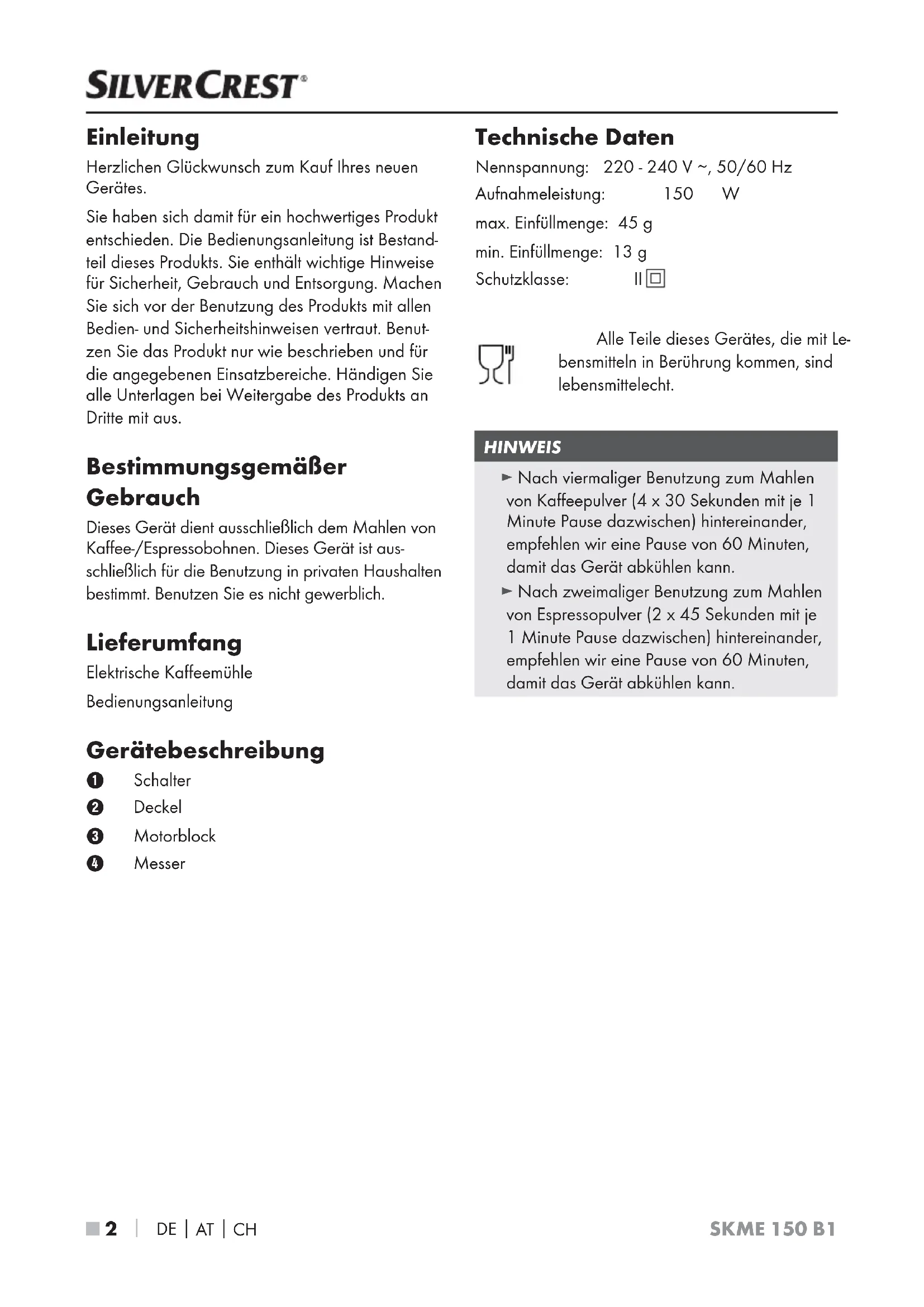 SKME 150 B1 - Kaffeemühle SILVERCREST - Kostenlose Bedienungsanleitung