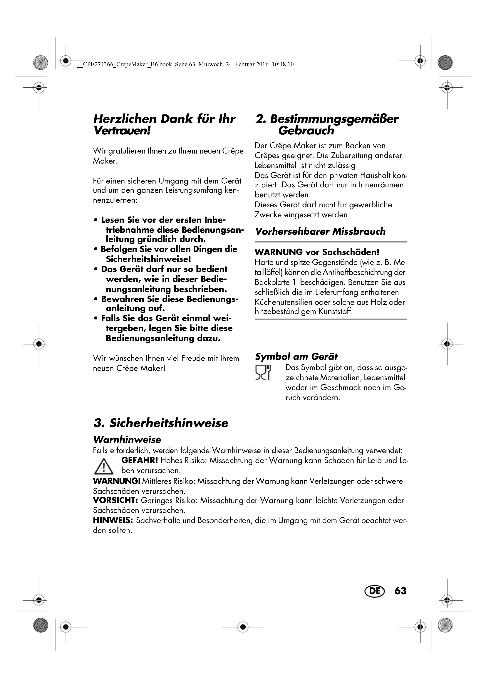 Gebrauch Der Crêpe Maker ist zum Backen von Crêpes geeignet. Die Zubereitung anderer Lebensmittel ist nicht zulässig. Das Gerät ist für den privaten Haushalt kon- zipiert. Das Gerät darf nur in Innenräumen benutzt werden. Dieses Gerät darf nicht für gewerbliche Zwecke eingesetzt werden. Vorhersehbarer Missbrauch WARNUNG vor Sachschäden! Harte und spitze Gegenstände (wie z. B. Me- talllöffel) können die Antihaftbeschichtung der Backplatte