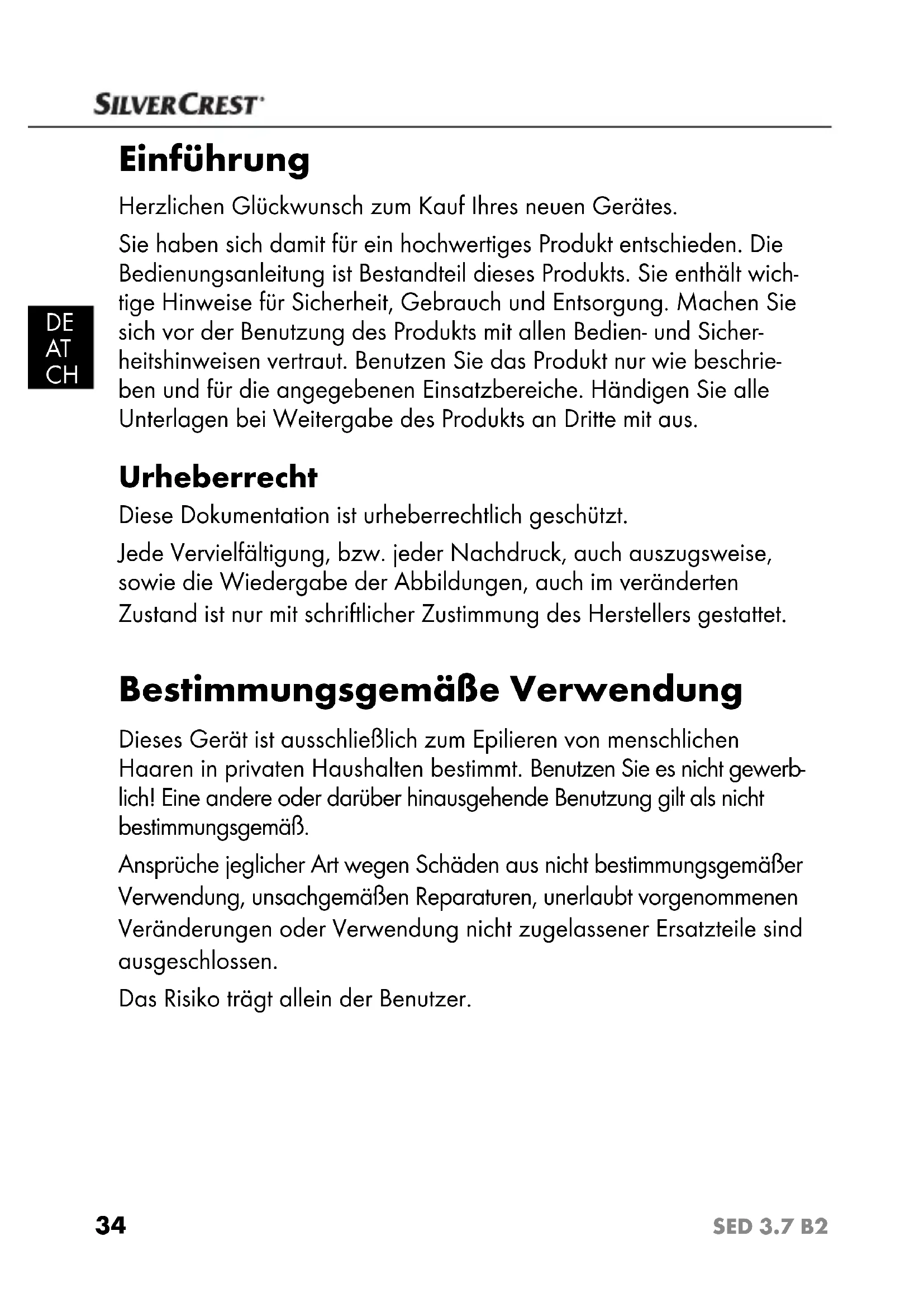 SED 3.7 B2 Einführung Herzlichen Glückwunsch zum Kauf Ihres neuen Gerätes. Sie haben sich damit für ein hochwertiges Produkt entschieden. Die Bedienungsanleitung ist Bestandteil dieses Produkts. Sie enthält wich- tige Hinweise für Sicherheit, Gebrauch und Entsorgung. Machen Sie sich vor der Benutzung des Produkts mit allen Bedien- und Sicher- heitshinweisen vertraut. Benutzen Sie das Produkt nur wie beschrie- ben und für die angegebenen Einsatzbereiche. Händigen Sie alle Unterlagen bei Weitergabe des Produkts an Dritte mit aus. Urheberrecht Diese Dokumentation ist urheberrechtlich geschützt. Jede Vervielfältigung, bzw. jeder Nachdruck, auch auszugsweise, sowie die Wiedergabe der Abbildungen, auch im veränderten Zustand ist nur mit schriftlicher Zustimmung des Herstellers gestattet. Bestimmungsgemäße Verwendung Dieses Gerät ist ausschließlich zum Epilieren von menschlichen Haaren in privaten Haushalten bestimmt. Benutzen Sie es nicht gewerb- lich! Eine andere oder darüber hinausgehende Benutzung gilt als nicht bestimmungsgemäß. Ansprüche jeglicher Art wegen Schäden aus nicht bestimmungsgemäßer Verwendung, unsachgemäßen Reparaturen, unerlaubt vorgenommenen Veränderungen oder Verwendung nicht zugelassener Ersatzteile sind ausgeschlossen. Das Risiko trägt allein der Benutzer.35 SED 3.7 B2