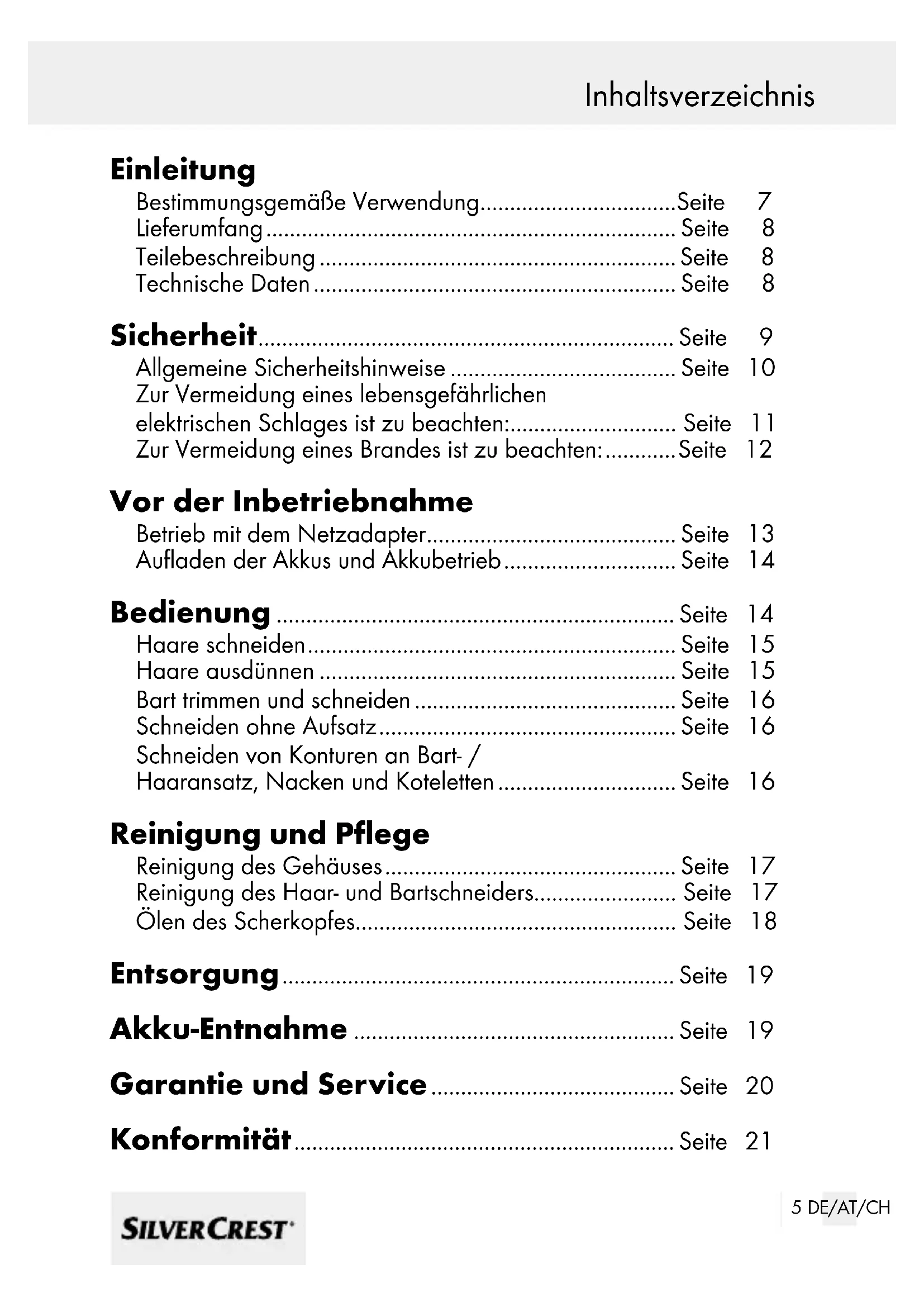 G5 DE/AT/CH Inhaltsverzeichnis Einleitung Bestimmungsgemäße Verwendung ................................. Seite 7 Lieferumfang ..................................................................... Seite 8 Teilebeschreibung ............................................................ Seite 8 Technische Daten ............................................................. Seite 8 Sicherheit ...................................................................... Seite 9 Allgemeine Sicherheitshinweise ...................................... Seite 10 Zur Vermeidung eines lebensgefährlichen elektrischen Schlages ist zu beachten:............................ Seite 11 Zur Vermeidung eines Brandes ist zu beachten: ............ Seite 12 Vor der Inbetriebnahme Betrieb mit dem Netzadapter .......................................... Seite 13 Aufladen der Akkus und Akkubetrieb ............................. Seite 14 Bedienung ................................................................... Seite 14 Haare schneiden .............................................................. Seite 15 Haare ausdünnen ............................................................ Seite 15 Bart trimmen und schneiden ............................................ Seite 16 Schneiden ohne Aufsatz .................................................. Seite 16 Schneiden von Konturen an Bart- / Haaransatz, Nacken und Koteletten .............................. Seite 16 Reinigung und Pflege Reinigung des Gehäuses ................................................. Seite 17 Reinigung des Haar- und Bartschneiders........................ Seite 17 Ölen des Scherkopfes...................................................... Seite 18 Entsorgung .................................................................. Seite 19 Akku-Entnahme ...................................................... Seite 19 Garantie und Service ......................................... Seite 20 Konformität ................................................................ Seite 216 DE/AT/CH In dieser Bedienungsanleitung werden folgende Piktogramme / Symbole verwendet: Bedienungsanleitung lesen! Ein beschädigtes Gerät, Netzkabel oder Netzstecker bedeuten Lebensgefahr durch elektrischen Schlag. Kontrollieren Sie regelmäßig den Zustand von Gerät, Netzkabel, Netzstecker. Achtung! Warn- und Sicherheitshinweise beachten! Vorsicht! Stromschlaggefahr! Gefährliche elektrische Spannung – Lebensgefahr!