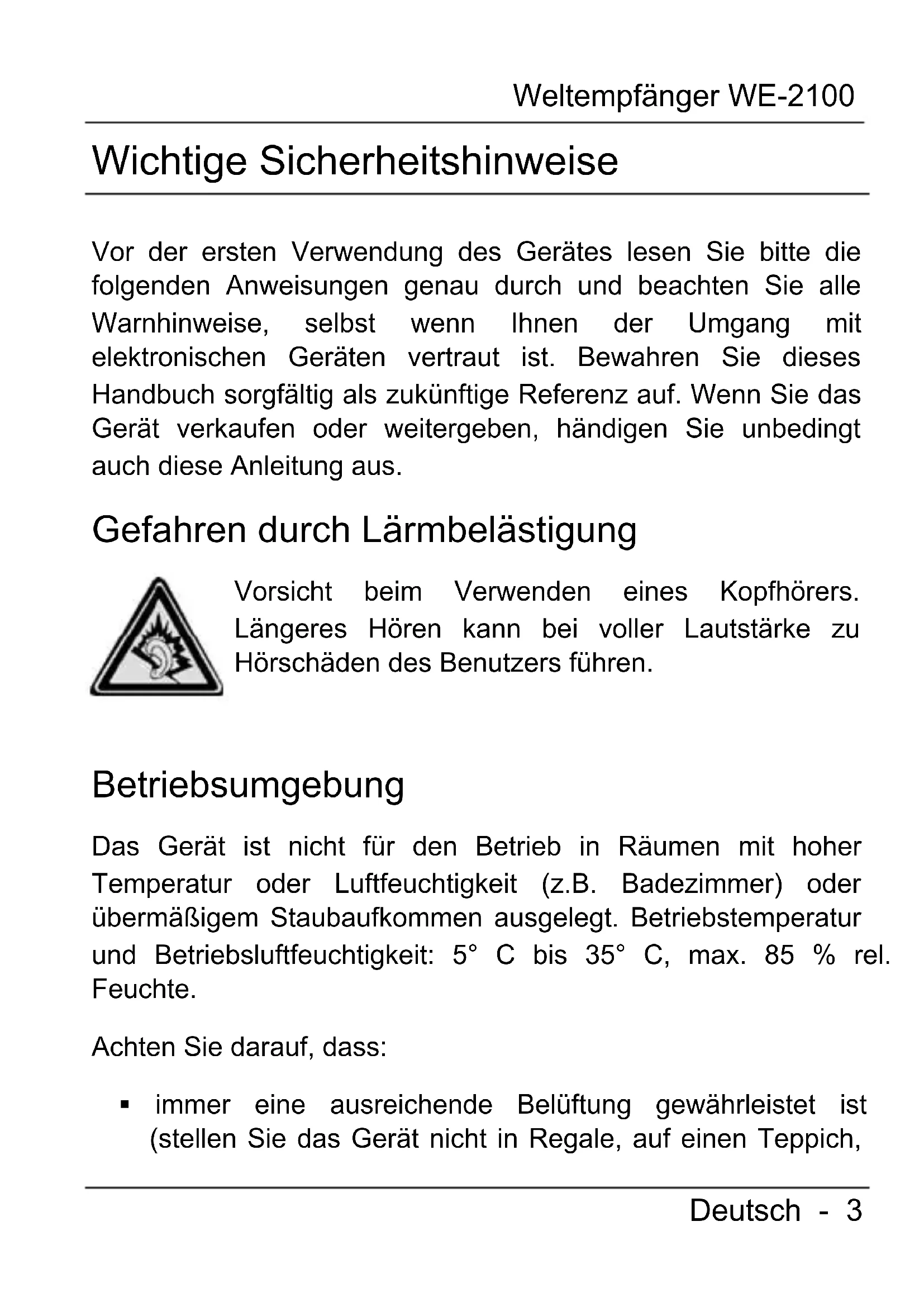- Garantiehinweise Weltempfänger WE-2100 Deutsch - 3 Wichtige Sicherheitshinweise Vor der ersten Verwendung des Gerätes lesen Sie bitte die folgenden Anweisungen genau durch und beachten Sie alle Warnhinweise, selbst wenn Ihnen der Umgang mit elektronischen Geräten vertraut ist. Bewahren Sie dieses Handbuch sorgfältig als zukünftige Referenz auf. Wenn Sie das Gerät verkaufen oder weitergeben, händigen Sie unbedingt auch diese Anleitung aus. Gefahren durch Lärmbelästigung Vorsicht beim Verwenden eines Kopfhörers. Längeres Hören kann bei voller Lautstärke zu Hörschäden des Benutzers führen. Betriebsumgebung Das Gerät ist nicht für den Betrieb in Räumen mit hoher Temperatur oder Luftfeuchtigkeit (z.B. Badezimmer) oder übermäßigem Staubaufkommen ausgelegt. Betriebstemperatur und Betriebsluftfeuchtigkeit: 5° C bis 35° C, max. 85 % rel. Feuchte. Achten Sie darauf, dass: immer eine ausreichende Belüftung gewährleistet ist (stellen Sie das Gerät nicht in Regale, auf einen Teppich,Weltempfänger WE-2100 p. 18
