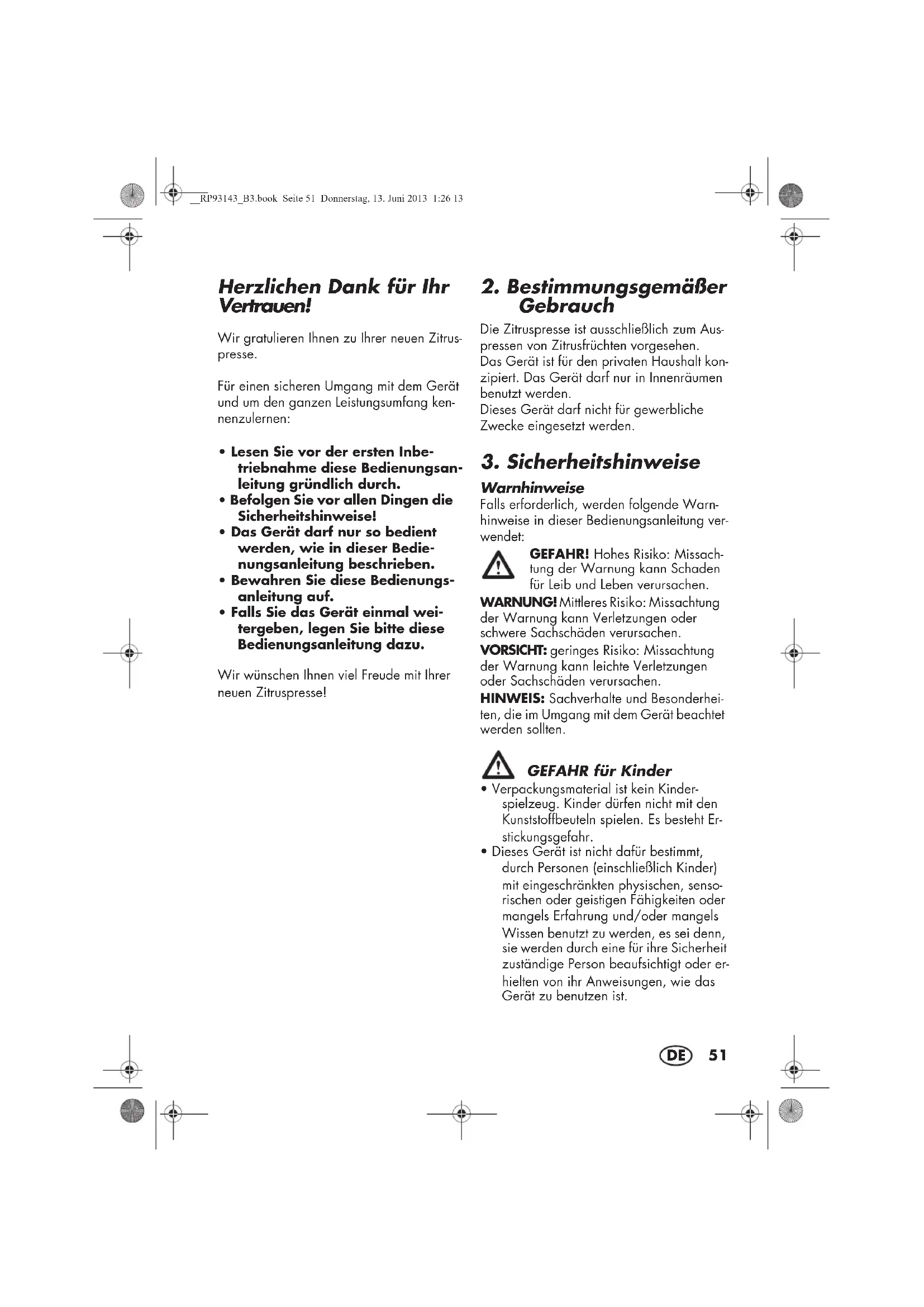 - Dieses Gerät ist nicht dafür bestimmt, durch Personen (einschließlich Kinder) mit eingeschränkten physischen, senso- rischen oder geistigen Fähigkeiten oder mangels Erfahrung und/oder mangels Wissen benutzt zu werden, es sei denn, sie werden durch eine für ihre Sicherheit zuständige Person beaufsichtigt oder er- hielten von ihr Anweisungen, wie das Gerät zu benutzen ist. __RP93143_B3.book Seite 51 Donnerstag, 13. Juni 2013 1:26 1352
