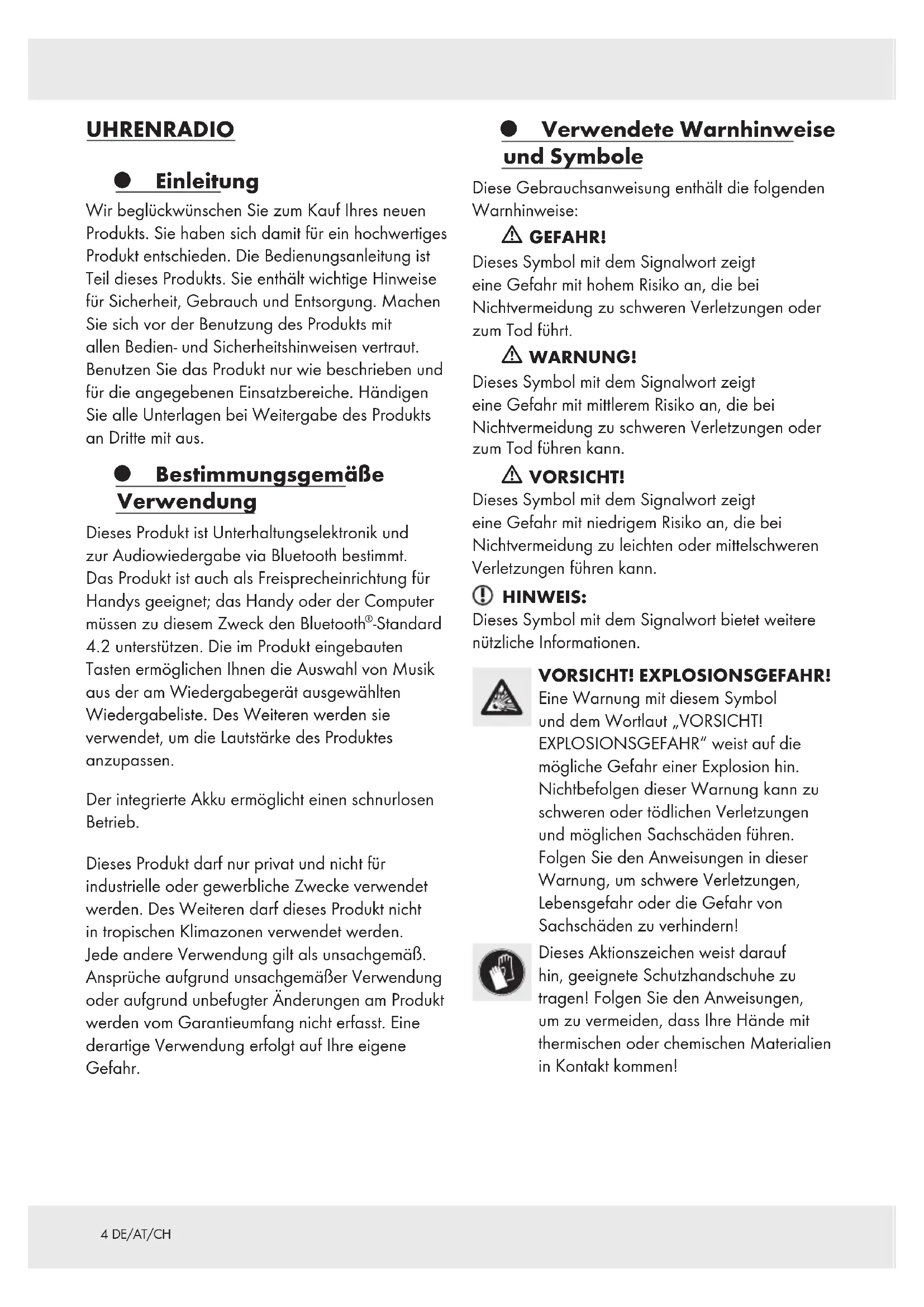 Tasten ermöglichen Ihnen die Auswahl von Musik aus der am Wiedergabegerät ausgewählten Wiedergabeliste. Des Weiteren werden sie verwendet, um die Lautstärke des Produktes anzupassen. Der integrierte Akku ermöglicht einen schnurlosen Betrieb. Dieses Produkt darf nur privat und nicht für industrielle oder gewerbliche Zwecke verwendet werden. Des Weiteren darf dieses Produkt nicht in tropischen Klimazonen verwendet werden. Jede andere Verwendung gilt als unsachgemäß. Ansprüche aufgrund unsachgemäßer Verwendung oder aufgrund unbefugter Änderungen am Produkt werden vom Garantieumfang nicht erfasst. Eine derartige Verwendung erfolgt auf Ihre eigene Gefahr. z Verwendete Warnhinweise und Symbole Diese Gebrauchsanweisung enthält die folgenden Warnhinweise: m GEFAHR! Dieses Symbol mit dem Signalwort zeigt eine Gefahr mit hohem Risiko an, die bei Nichtvermeidung zu schweren Verletzungen oder zum Tod führt. m WARNUNG! Dieses Symbol mit dem Signalwort zeigt eine Gefahr mit mittlerem Risiko an, die bei Nichtvermeidung zu schweren Verletzungen oder zum Tod führen kann. m VORSICHT! Dieses Symbol mit dem Signalwort zeigt eine Gefahr mit niedrigem Risiko an, die bei Nichtvermeidung zu leichten oder mittelschweren Verletzungen führen kann. HINWEIS: Dieses Symbol mit dem Signalwort bietet weitere nützliche Informationen. VORSICHT! EXPLOSIONSGEFAHR! Eine Warnung mit diesem Symbol und dem Wortlaut „VORSICHT! EXPLOSIONSGEFAHR“ weist auf die mögliche Gefahr einer Explosion hin. Nichtbefolgen dieser Warnung kann zu schweren oder tödlichen Verletzungen und möglichen Sachschäden führen. Folgen Sie den Anweisungen in dieser Warnung, um schwere Verletzungen, Lebensgefahr oder die Gefahr von Sachschäden zu verhindern! Dieses Aktionszeichen weist darauf hin, geeignete Schutzhandschuhe zu tragen! Folgen Sie den Anweisungen, um zu vermeiden, dass Ihre Hände mit thermischen oder chemischen Materialien in Kontakt kommen!5DE/AT/CH z Markenhinweise USB
