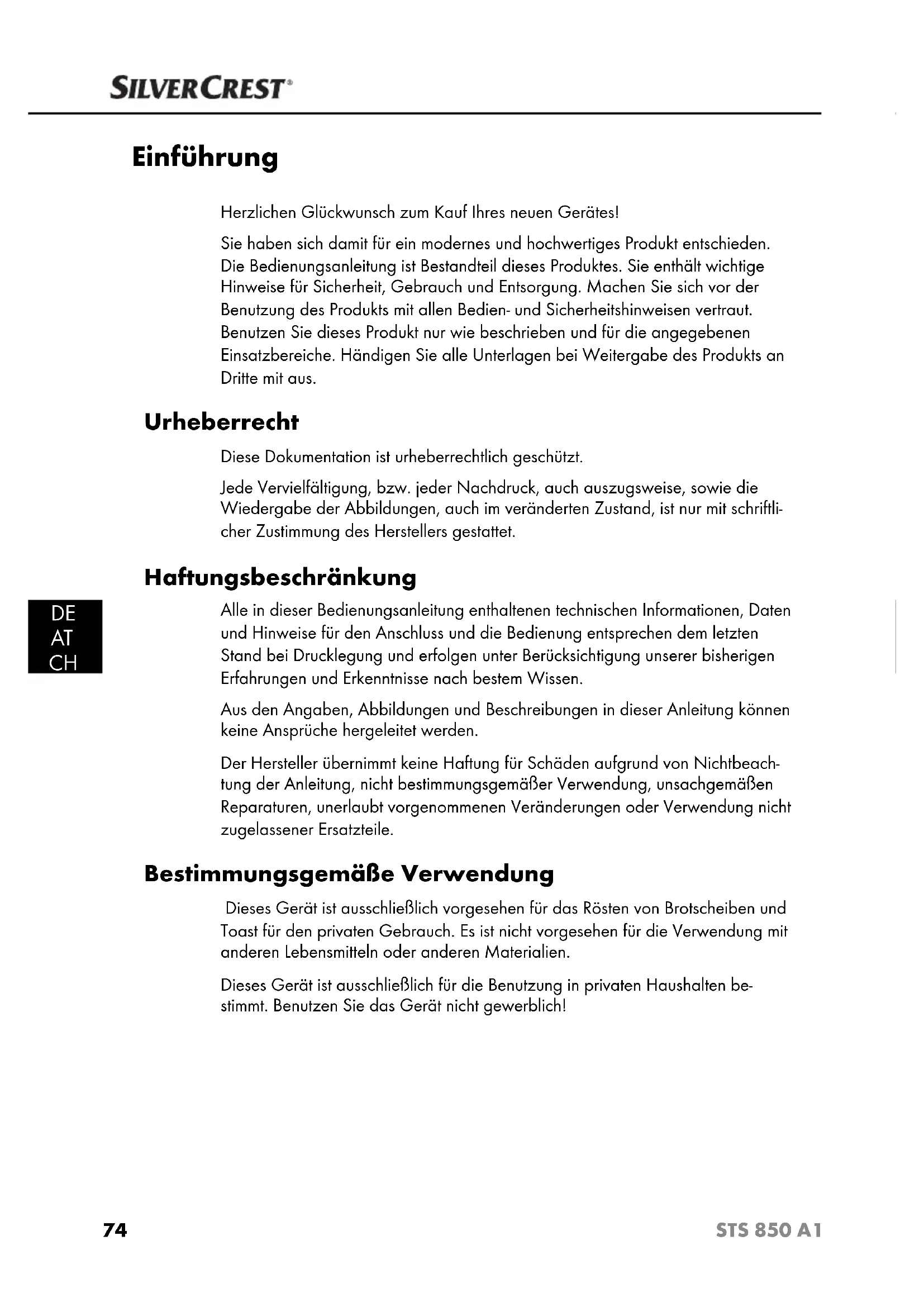 Einführung Herzlichen Glückwunsch zum Kauf Ihres neuen Gerätes! Sie haben sich damit für ein modernes und hochwertiges Produkt entschieden. Die Bedienungsanleitung ist Bestandteil dieses Produktes. Sie enthält wichtige Hinweise für Sicherheit, Gebrauch und Entsorgung. Machen Sie sich vor der Benutzung des Produkts mit allen Bedien- und Sicherheitshinweisen vertraut. Benutzen Sie dieses Produkt nur wie beschrieben und für die angegebenen Einsatzbereiche. Händigen Sie alle Unterlagen bei Weitergabe des Produkts an Dritte mit aus. Urheberrecht Diese Dokumentation ist urheberrechtlich geschützt. Jede Vervielfältigung, bzw. jeder Nachdruck, auch auszugsweise, sowie die Wiedergabe der Abbildungen, auch im veränderten Zustand, ist nur mit schriftli- cher Zustimmung des Herstellers gestattet. Haftungsbeschränkung Alle in dieser Bedienungsanleitung enthaltenen technischen Informationen, Daten und Hinweise für den Anschluss und die Bedienung entsprechen dem letzten Stand bei Drucklegung und erfolgen unter Berücksichtigung unserer bisherigen Erfahrungen und Erkenntnisse nach bestem Wissen. Aus den Angaben, Abbildungen und Beschreibungen in dieser Anleitung können keine Ansprüche hergeleitet werden. Der Hersteller übernimmt keine Haftung für Schäden aufgrund von Nichtbeach- tung der Anleitung, nicht bestimmungsgemäßer Verwendung, unsachgemäßen Reparaturen, unerlaubt vorgenommenen Veränderungen oder Verwendung nicht zugelassener Ersatzteile. Bestimmungsgemäße Verwendung Dieses Gerät ist ausschließlich vorgesehen für das Rösten von Brotscheiben und Toast für den privaten Gebrauch. Es ist nicht vorgesehen für die Verwendung mit anderen Lebensmitteln oder anderen Materialien. Dieses Gerät ist ausschließlich für die Benutzung in privaten Haushalten be- stimmt. Benutzen Sie das Gerät nicht gewerblich!75 STS 850 A1