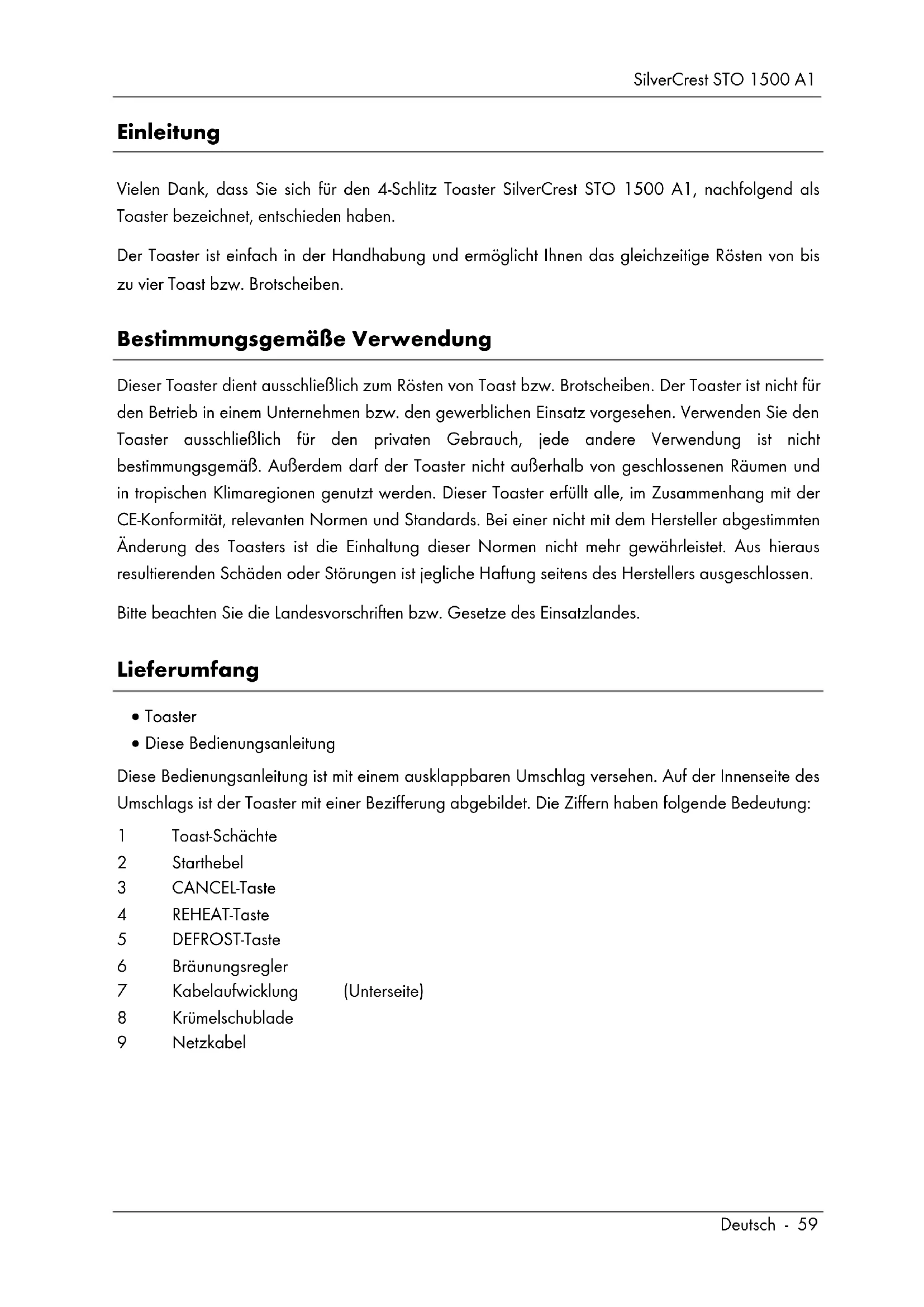 - Hinweise zu Garantie und Serviceabwicklung SilverCrest STO 1500 A1 Deutsch - 59 Einleitung Vielen Dank, dass Sie sich für den 4-Schlitz Toaster SilverCrest STO 1500 A1, nachfolgend als Toaster bezeichnet, entschieden haben. Der Toaster ist einfach in der Handhabung und ermöglicht Ihnen das gleichzeitige Rösten von bis zu vier Toast bzw. Brotscheiben. Bestimmungsgemäße Verwendung Dieser Toaster dient ausschließlich zum Rösten von Toast bzw. Brotscheiben. Der Toaster ist nicht für den Betrieb in einem Unternehmen bzw. den gewerblichen Einsatz vorgesehen. Verwenden Sie den Toaster ausschließlich für den privaten Gebrauch, jede andere Verwendung ist nicht bestimmungsgemäß. Außerdem darf der Toaster nicht außerhalb von geschlossenen Räumen und in tropischen Klimaregionen genutzt werden. Dieser Toaster erfüllt alle, im Zusammenhang mit der CE-Konformität, relevanten Normen und Standards. Bei einer nicht mit dem Hersteller abgestimmten Änderung des Toasters ist die Einhaltung dieser Normen nicht mehr gewährleistet. Aus hieraus resultierenden Schäden oder Störungen ist jegliche Haftung seitens des Herstellers ausgeschlossen. Bitte beachten Sie die Landesvorschriften bzw. Gesetze des Einsatzlandes. Lieferumfang Toaster Diese Bedienungsanleitung Diese Bedienungsanleitung ist mit einem ausklappbaren Umschlag versehen. Auf der Innenseite des Umschlags ist der Toaster mit einer Bezifferung abgebildet. Die Ziffern haben folgende Bedeutung: 1 Toast-Schächte 2 Starthebel 3 CANCEL-Taste 4 REHEAT-Taste 5 DEFROST-Taste 6 Bräunungsregler 7 Kabelaufwicklung (Unterseite) 8 Krümelschublade 9 NetzkabelSilverCrest STO 1500 A1 p. 70