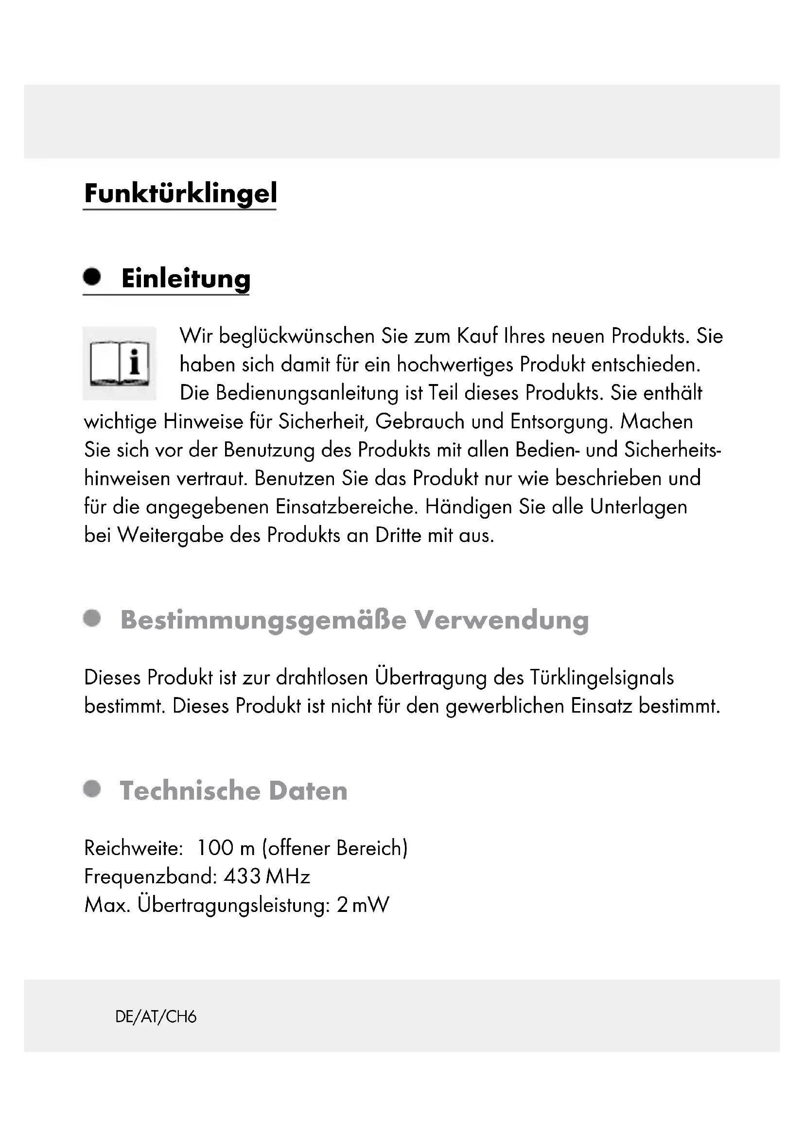 9DE/AT/CH 5 Einleitung ................................................................................ Seite 6 Bestimmungsgemäße Verwendung ...........................................Seite 6 Technische Daten ....................................................................... Seite 6 Lieferumfang ............................................................................... Seite 7 Teileübersicht ..............................................................................Seite 7 Sicherheit ................................................................................Seite 8 Allgemeine Sicherheitshinweise ................................................Seite 9 Sicherheitshinweise für Batterien / Akkus ..................................Seite 10 Montage ..................................................................................Seite 11 Inbetriebnahme ................................................................ Seite 12 Batterien einlegen / wechseln ....................................................Seite 12 Bedienung .............................................................................Seite 13 Sender / Empfänger synchronisieren ........................................Seite 13 Signalart einstellen ..................................................................... Seite 14 Lautstärke einstellen ...................................................................Seite 14 Signalton auswählen .................................................................Seite 14 Fehler beseitigen ........................................................................Seite 15 Reinigung und Pflege ...................................................Seite 15 Entsorgung ............................................................................ Seite 15 Information...........................................................................Seite 17 Vereinfachte EU-Konformitätserklärung .................................... Seite 17 Garantie .................................................................................. Seite 18DE/AT/CH6 Funktürklingel Einleitung Wir beglückwünschen Sie zum Kauf Ihres neuen Produkts. Sie haben sich damit für ein hochwertiges Produkt entschieden. Die Bedienungsanleitung ist Teil dieses Produkts. Sie enthält wichtige Hinweise für Sicherheit, Gebrauch und Entsorgung. Machen Sie sich vor der Benutzung des Produkts mit allen Bedien- und Sicherheits- hinweisen vertraut. Benutzen Sie das Produkt nur wie beschrieben und für die angegebenen Einsatzbereiche. Händigen Sie alle Unterlagen bei Weitergabe des Produkts an Dritte mit aus. Bestimmungsgemäße Verwendung Dieses Produkt ist zur drahtlosen Übertragung des Türklingelsignals bestimmt. Dieses Produkt ist nicht für den gewerblichen Einsatz bestimmt. Technische Daten Reichweite: 100 m (offener Bereich) Frequenzband: 433 MHz Max. Übertragungsleistung: 2 mWDE/AT/CH 7 Batterietypen: Empfänger: 2 x 1,5 V (Gleichstrom) (Typ AA / LR6), Sender: 1 x 3 V (Gleichstrom) (Typ CR2032) Empfänger: Signaltonlautstärke (bei max. Lautstärkeeinstellung): min. 73 dB (bei Geräteabstand von 1 m) Sender: Schutzart: IPX4 Lieferumfang 1 Sender 1 Empfänger 2 Batterien 1,5 V (Gleichstrom) , Typ AA (Empfänger) 1 Batterie 3 V (Gleichstrom) , Typ CR2032 (Sender) 3 lange Schrauben (zur Wandmontage für Sender und Empfänger) 2 kurze Schrauben (für Sender) 3 Dübel 5 austauschbare Namensschilder (für die Türklingel) 1 Klingelschildabdeckung 1 Bedienungsanleitung Teileübersicht Empfänger (Abb. A / B):