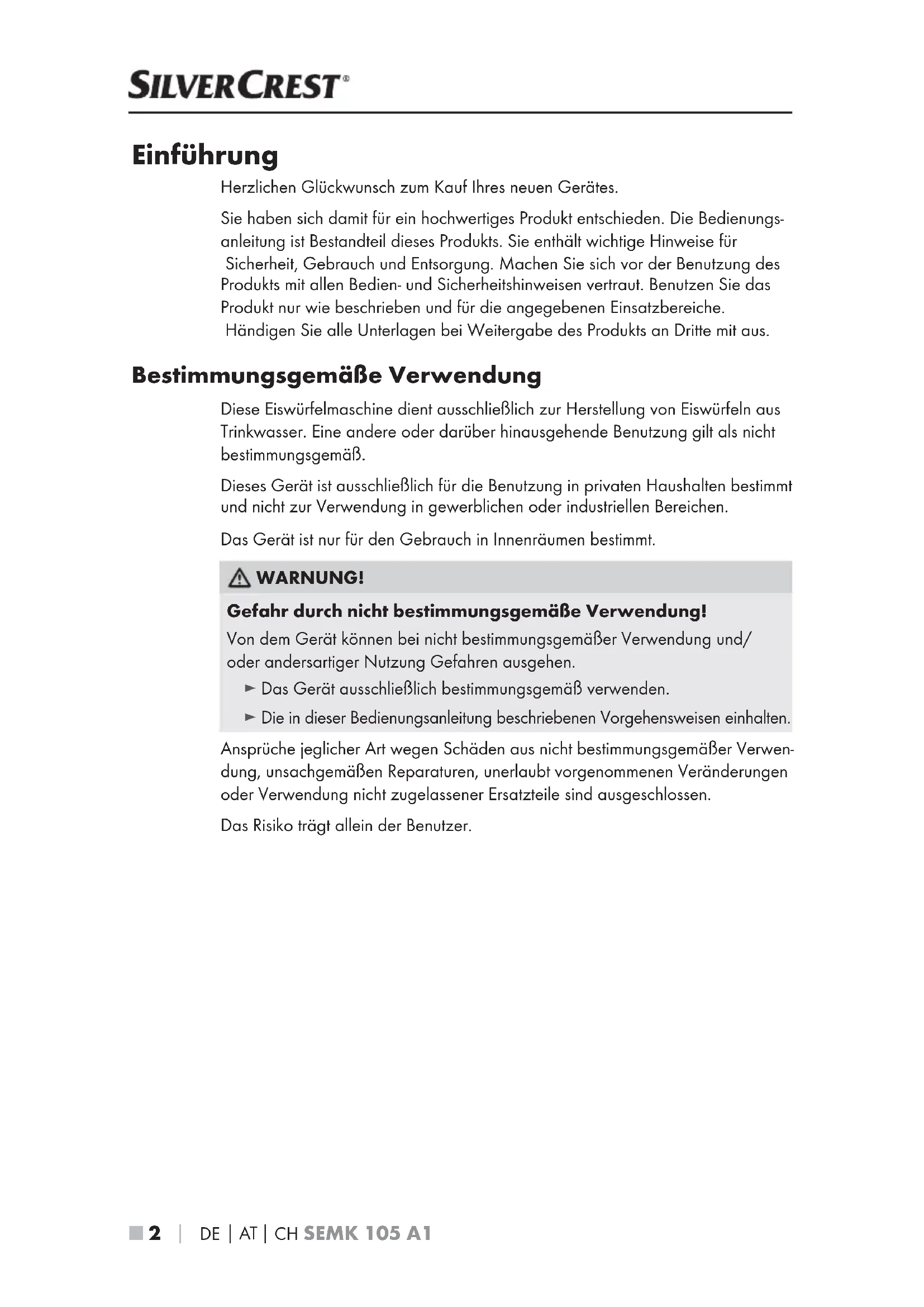 Einführung Herzlichen Glückwunsch zum Kauf Ihres neuen Gerätes. Sie haben sich damit für ein hochwertiges Produkt entschieden. Die Bedienungs- anleitung ist Bestandteil dieses Produkts. Sie enthält wichtige Hinweise für Sicherheit, Gebrauch und Entsorgung. Machen Sie sich vor der Benutzung des Produkts mit allen Bedien- und Sicherheitshinweisen vertraut. Benutzen Sie das Produkt nur wie beschrieben und für die angegebenen Einsatzbereiche. Händigen Sie alle Unterlagen bei Weitergabe des Produkts an Dritte mit aus. Bestimmungsgemäße Verwendung Diese Eiswürfelmaschine dient ausschließlich zur Herstellung von Eiswürfeln aus Trinkwasser. Eine andere oder darüber hinausgehende Benutzung gilt als nicht bestimmungsgemäß. Dieses Gerät ist ausschließlich für die Benutzung in privaten Haushalten bestimmt und nicht zur Verwendung in gewerblichen oder industriellen Bereichen. Das Gerät ist nur für den Gebrauch in Innenräumen bestimmt. WARNUNG! Gefahr durch nicht bestimmungsgemäße Verwendung! Von dem Gerät können bei nicht bestimmungsgemäßer Verwendung und/ oder andersartiger Nutzung Gefahren ausgehen. ► Das Gerät ausschließlich bestimmungsgemäß verwenden. ► Die in dieser Bedienungsanleitung beschriebenen Vorgehensweisen einhalten. Ansprüche jeglicher Art wegen Schäden aus nicht bestimmungsgemäßer Verwen- dung, unsachgemäßen Reparaturen, unerlaubt vorgenommenen Veränderungen oder Verwendung nicht zugelassener Ersatzteile sind ausgeschlossen. Das Risiko trägt allein der Benutzer.DE