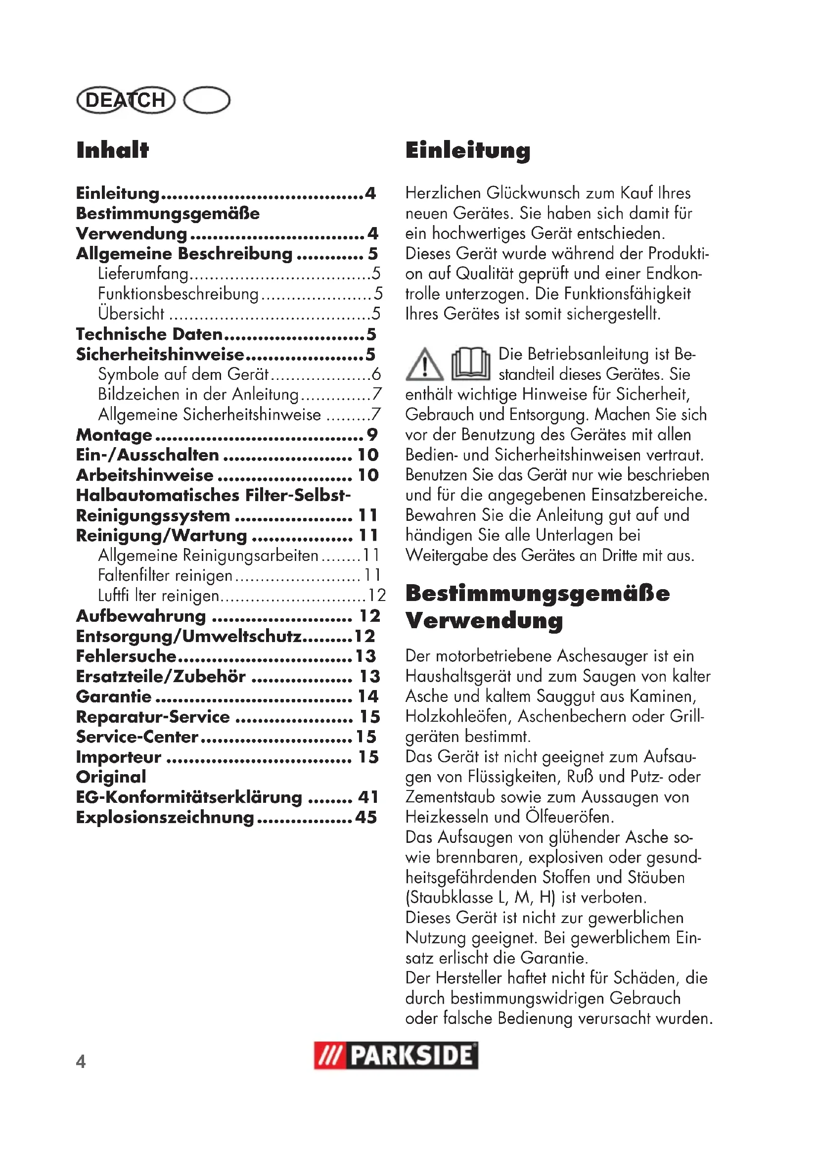 - DE AT CH Einleitung Herzlichen Glückwunsch zum Kauf Ihres neuen Gerätes. Sie haben sich damit für ein hochwertiges Gerät entschieden. Dieses Gerät wurde während der Produkti- on auf Qualität geprüft und einer Endkon- trolle unterzogen. Die Funktionsfähigkeit Ihres Gerätes ist somit sichergestellt. Die Betriebsanleitung ist Be- standteil dieses Gerätes. Sie enthält wichtige Hinweise für Sicherheit, Gebrauch und Entsorgung. Machen Sie sich vor der Benutzung des Gerätes mit allen Bedien- und Sicherheitshinweisen vertraut. Benutzen Sie das Gerät nur wie beschrieben und für die angegebenen Einsatzbereiche. Bewahren Sie die Anleitung gut auf und händigen Sie alle Unterlagen bei Weitergabe des Gerätes an Dritte mit aus. Bestimmungsgemäße Verwendung Der motorbetriebene Aschesauger ist ein Haushaltsgerät und zum Saugen von kalter Asche und kaltem Sauggut aus Kaminen, Holzkohleöfen, Aschenbechern oder Grill- geräten bestimmt. Das Gerät ist nicht geeignet zum Aufsau- gen von Flüssigkeiten, Ruß und Putz- oder Zementstaub sowie zum Aussaugen von Heizkesseln und Ölfeueröfen. Das Aufsaugen von glühender Asche so- wie brennbaren, explosiven oder gesund- heitsgefährdenden Stoffen und Stäuben (Staubklasse L, M, H) ist verboten. Dieses Gerät ist nicht zur gewerblichen Nutzung geeignet. Bei gewerblichem Ein- satz erlischt die Garantie. Der Hersteller haftet nicht für Schäden, die durch bestimmungswidrigen Gebrauch oder falsche Bedienung verursacht wurden. Inhalt Einleitung p. 4